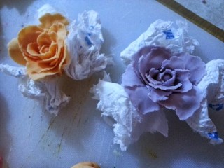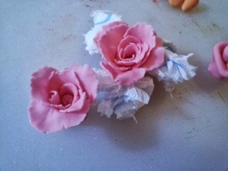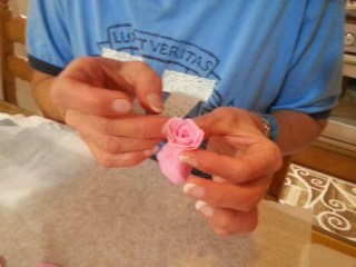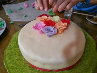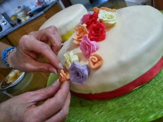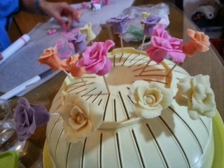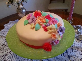Ho postato stasera tutti i passaggi che hanno portato alla creazione di questa mia dolce creazione, dai panetti di pasta di zucchero colorati, fino alla foto del risultato finale, passando dalla lavorazione delle rose, alla “lisciatura” della torta grezza, fino alla copertura e decorazione con i fiori e le foglie ormai asciutte e pronte da essere “posate in opera”!