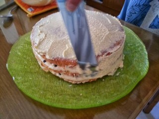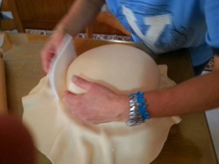 Fase di “stuccatura” della torta, su cui verrà posata la copertura in pasta di zucchero color avorio.