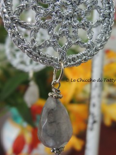 In questo luminosissimo paio di orecchini, il lavoro all’uncinetto è realizzato con filato Lurex color argento, mentre il pendente è una goccia di Quarzo grigio sfaccettata.
