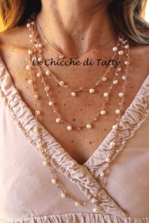 La collana è anche essa realizzata all’uncinetto con filato Lurex colo “oro rosa” con perline di fiume e cristalli.