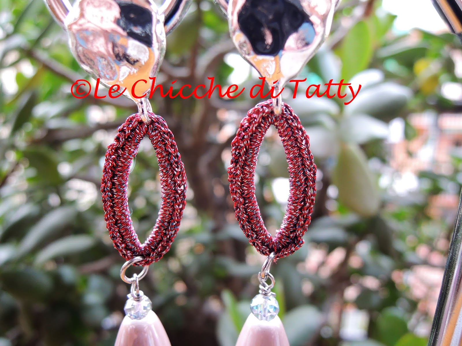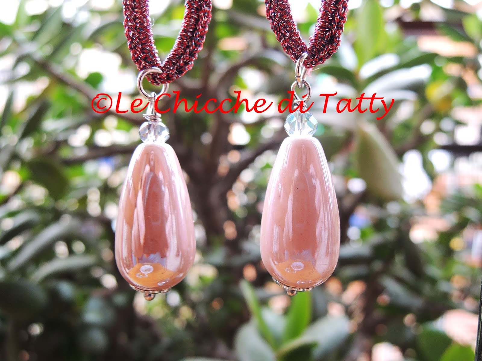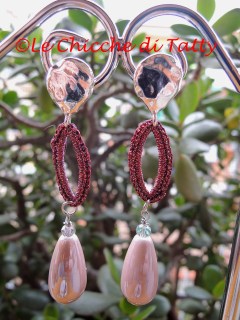 Orecchini composti da un ovale lavorato all’uncinetto con filato gioiello perno in acciaio e goccia in ceramica rosa polvere.