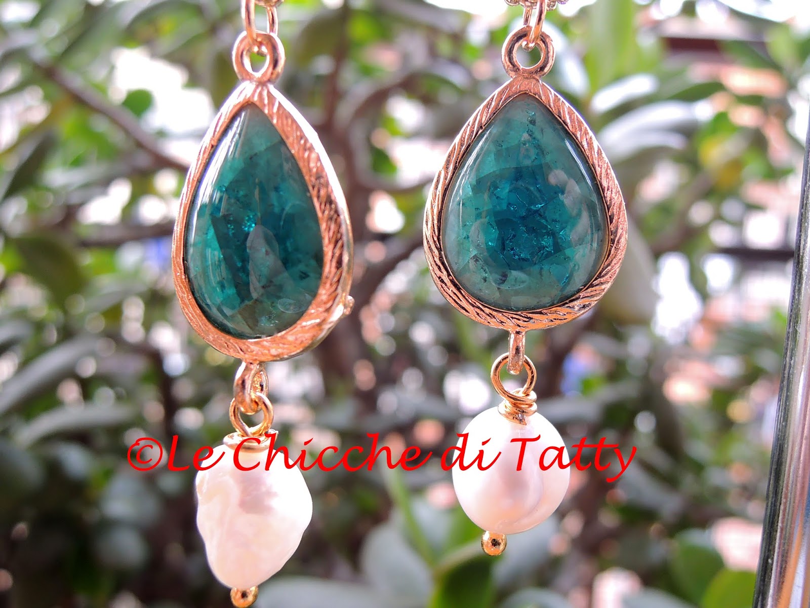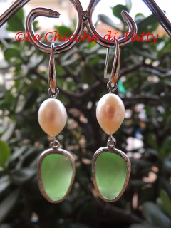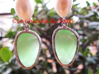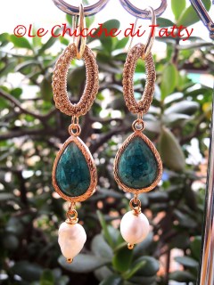 Goccia in ceramica smaltata verde, particolare lavorato all’uncinetto con filato gioiello color oro e come pendente una perla di fiume.