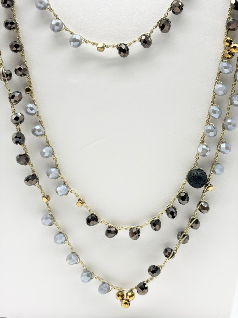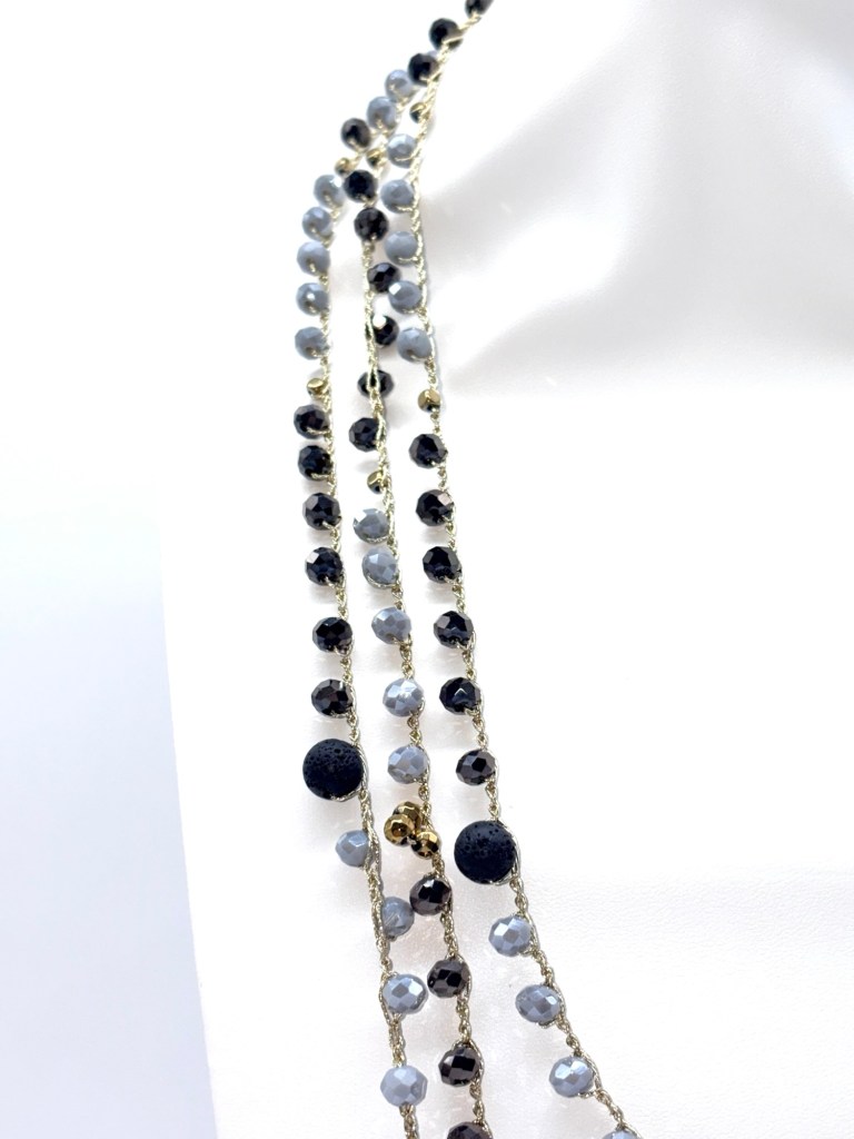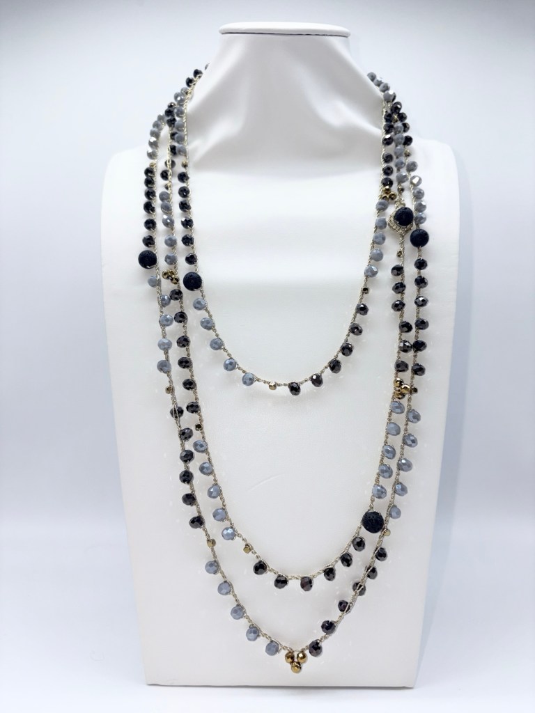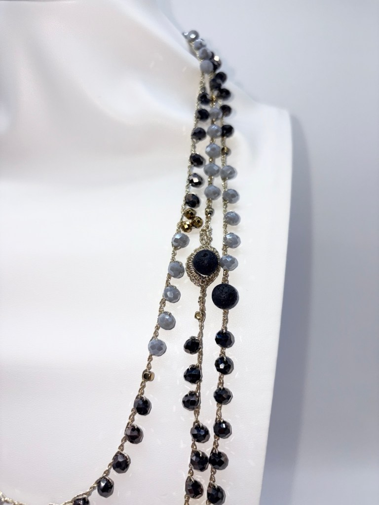 La collana Grey Stones è realizzata a mano con pietre naturali, cristalli e dettagli raffinati che creano un gioco di luce sofisticato e femminile.