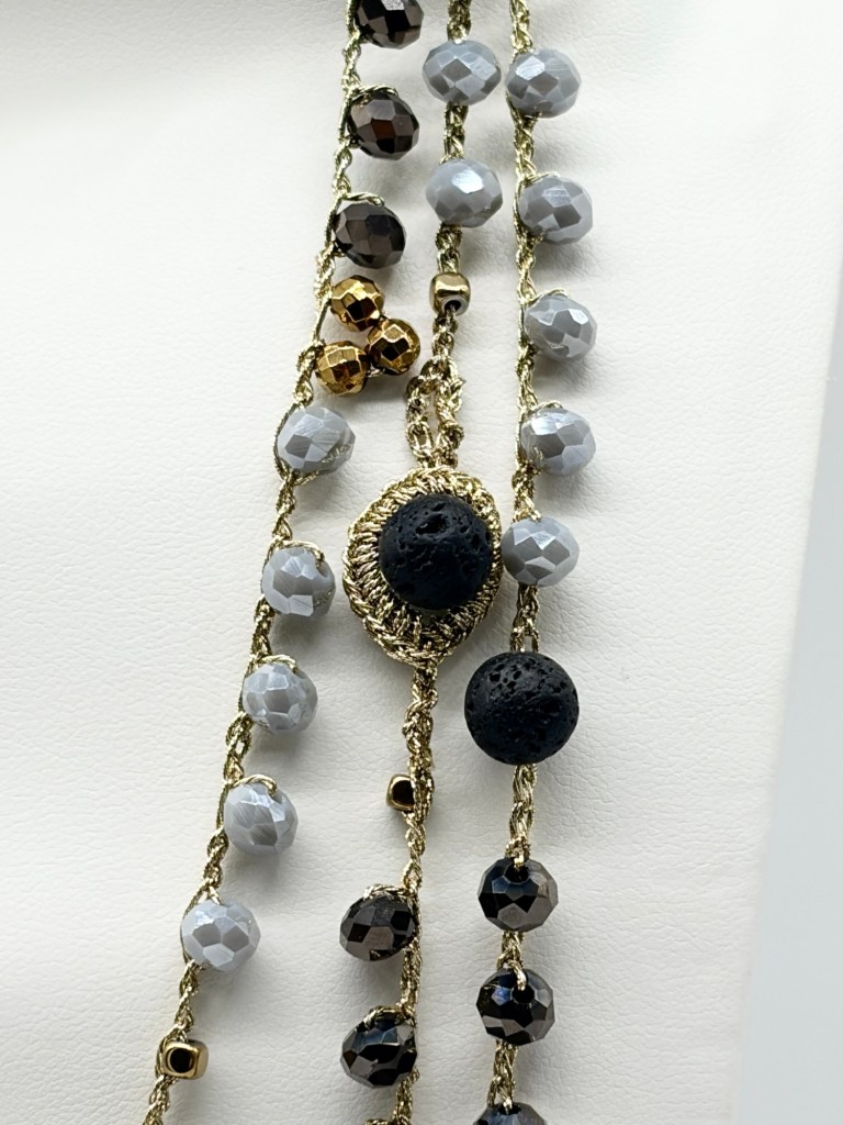 Realizzata all’uncinetto con Filato Gioiello color oro e cristalli grigi, brown ed elementi in pietra lavica.