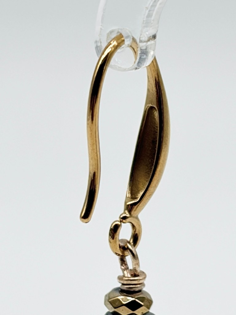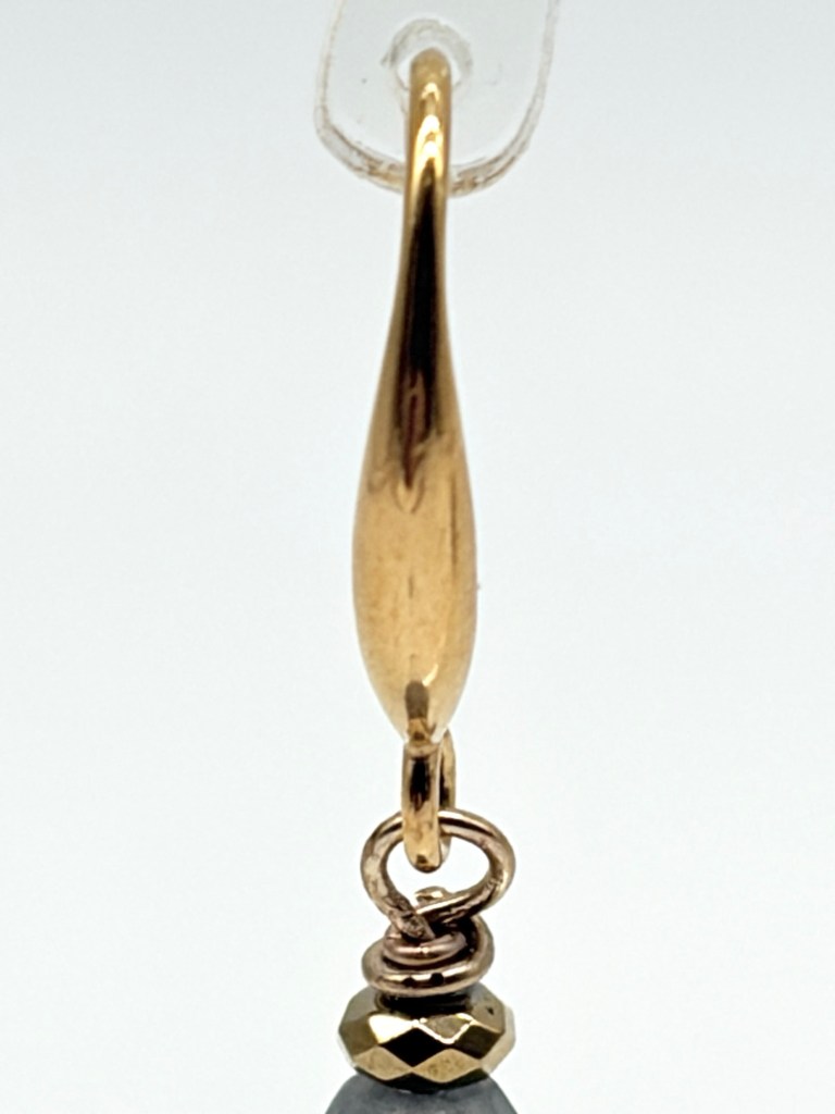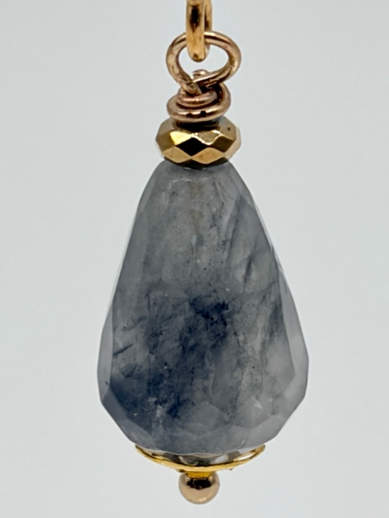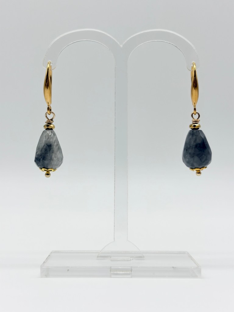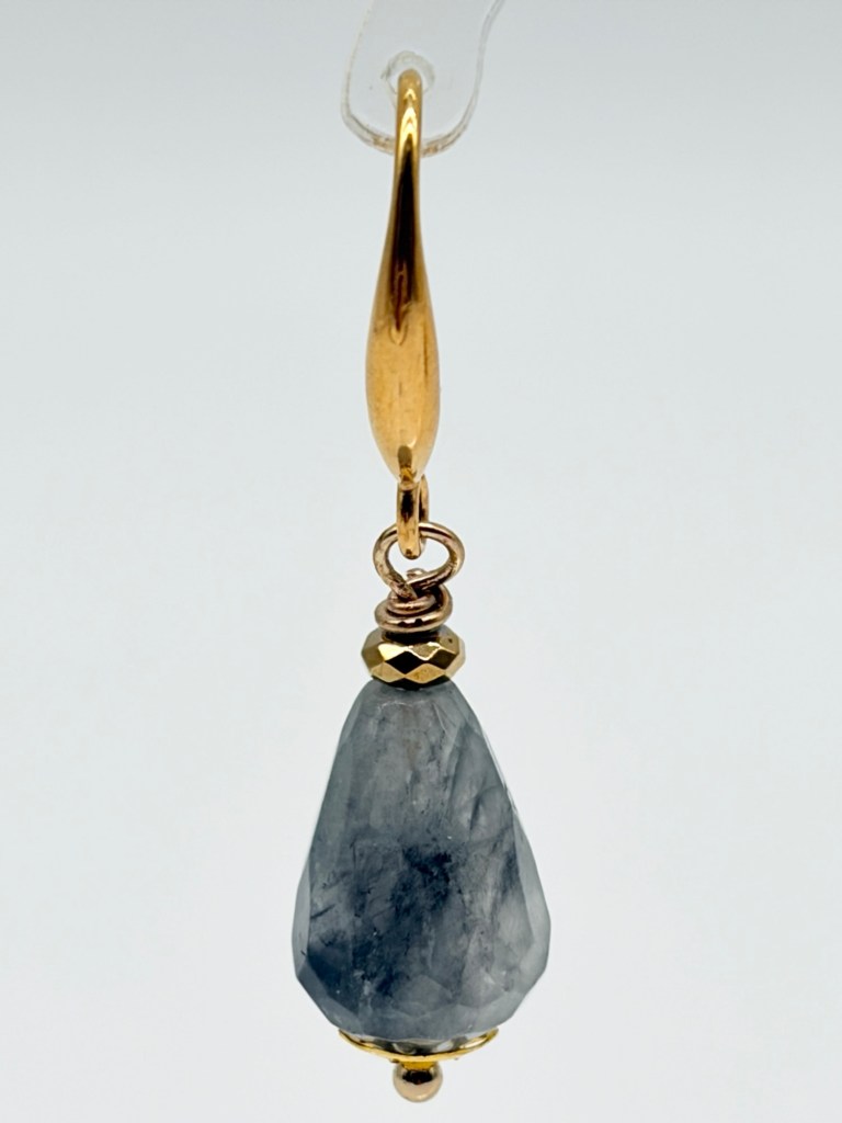 Il pendente è una goccia di quarzo fumé sfaccettato di primissima scelta, caratterizzata da riflessi profondi e luminosi che donano movimento e luce al viso. La pietra è separata dalla monachella in acciaio dorato da due rondelle di ematite, un dettaglio ricercato che valorizza l’armonia dell’insieme e aggiunge un tocco moderno.