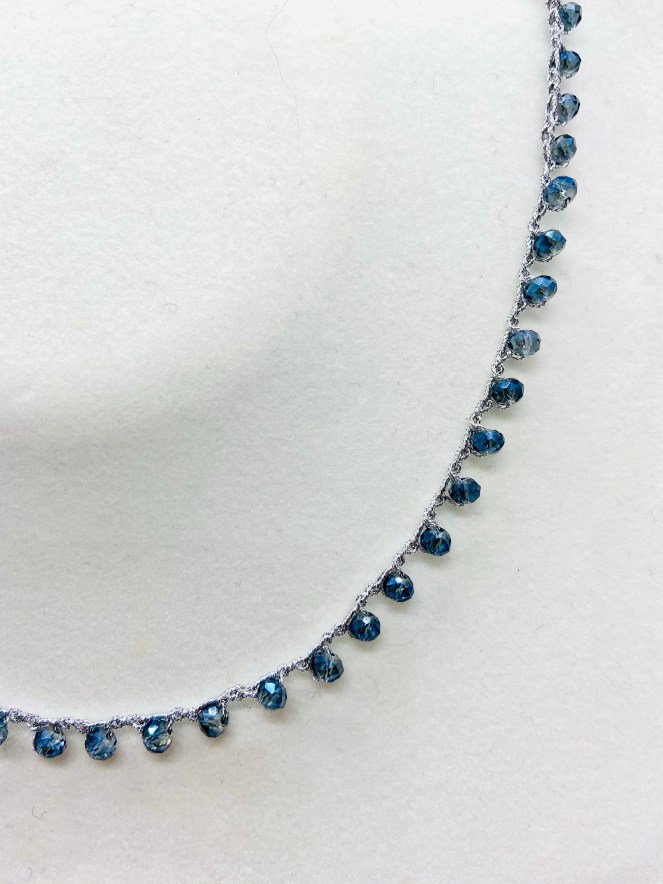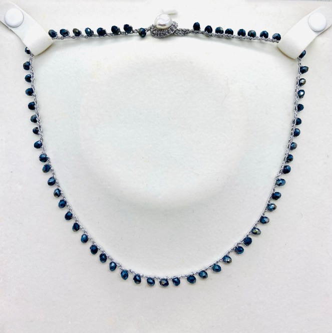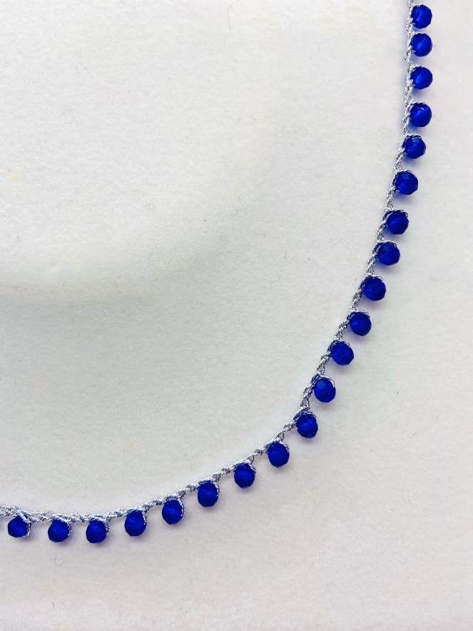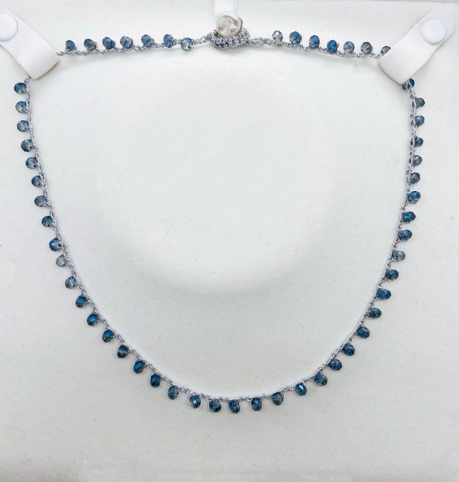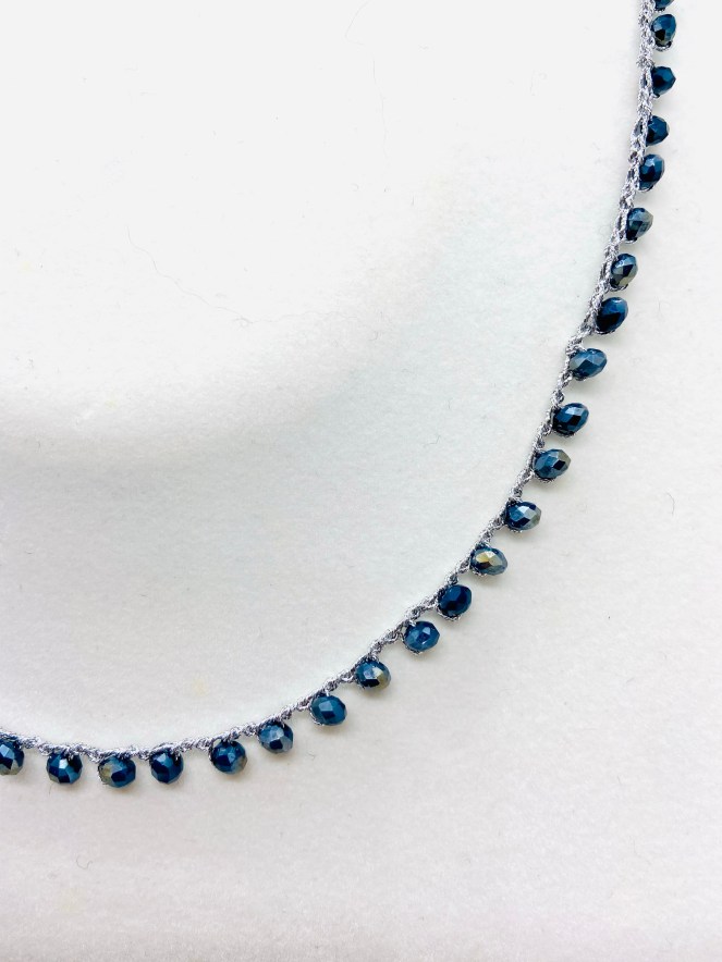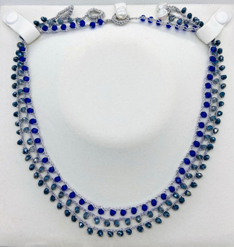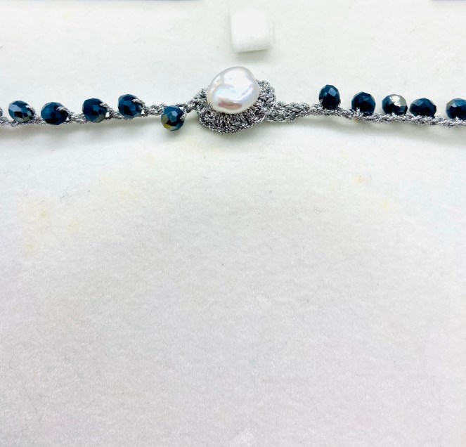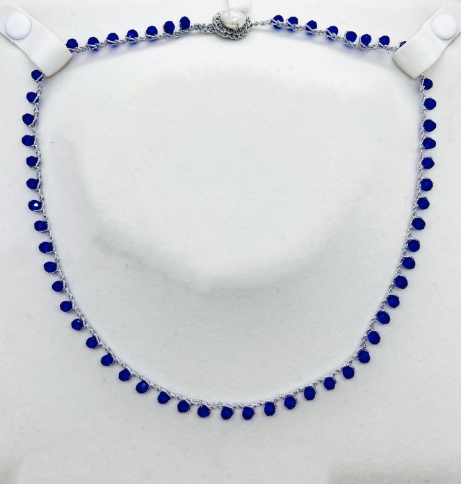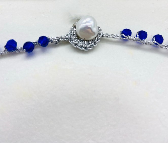 Girocollo lavorato all’uncinetto con filato gioiello color oro-rosa e cristalli blu. Chiusura ad asola con perla di fiume naturale.