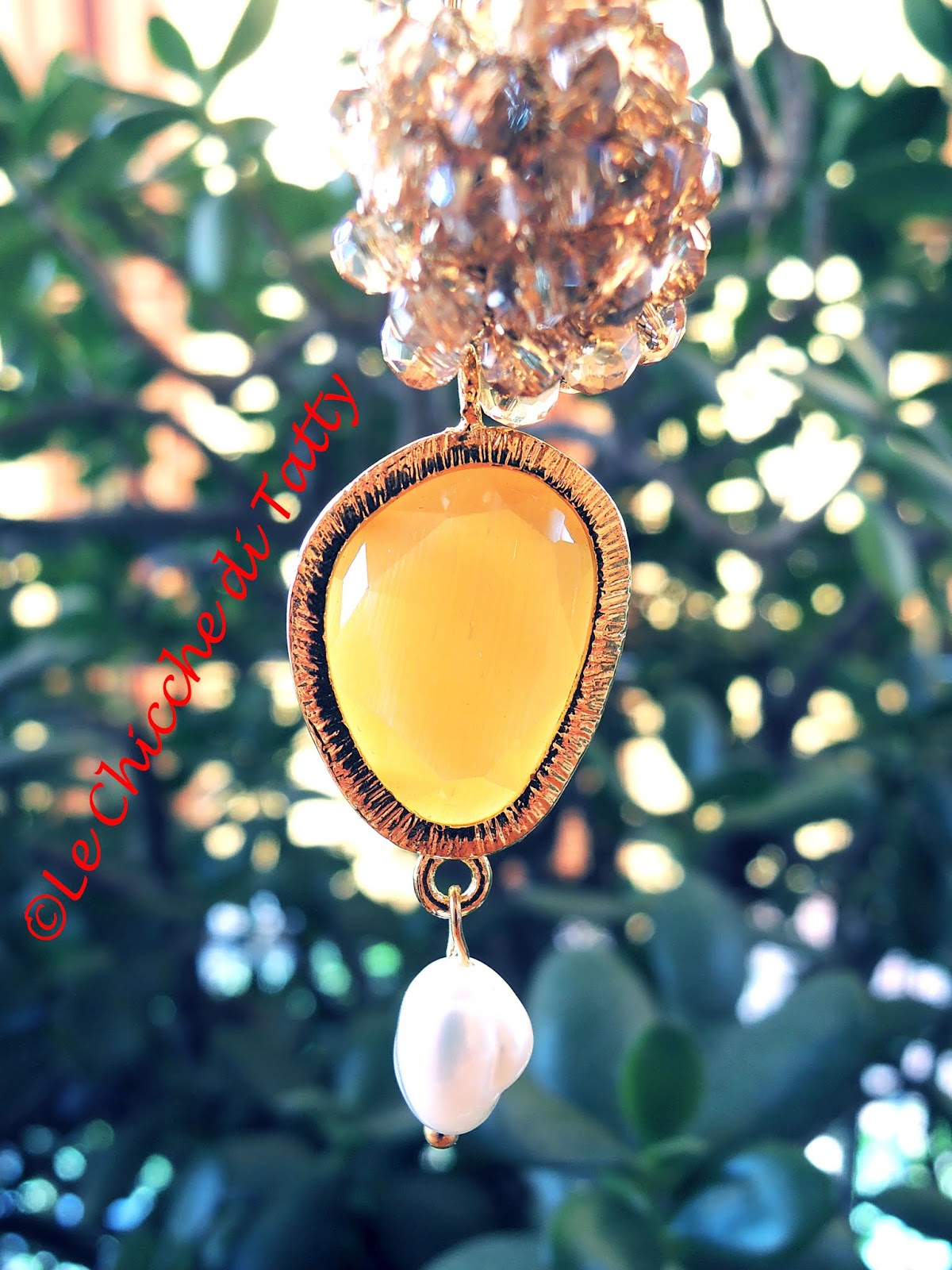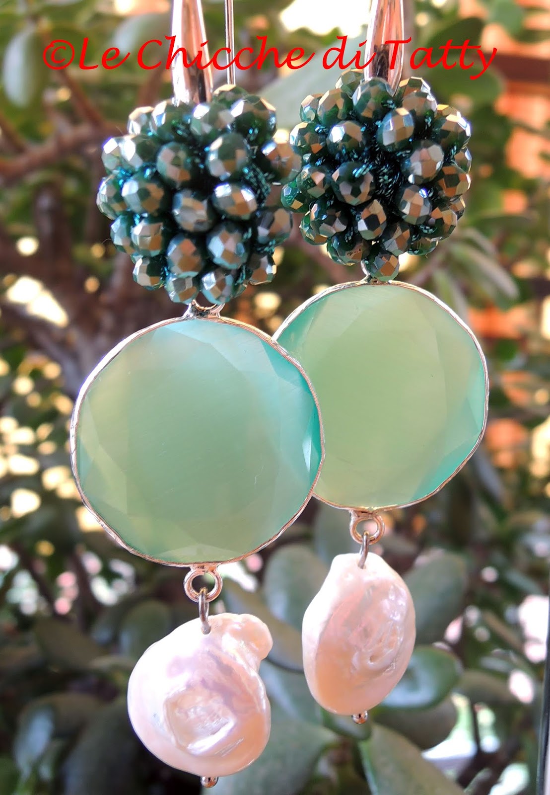 Cristalli blu intenso lavorati all’uncinetto con filato gioiello. Perno a lobo con occhio di gatto azzurro chiaro e come pendente una bellissima perla barocca.