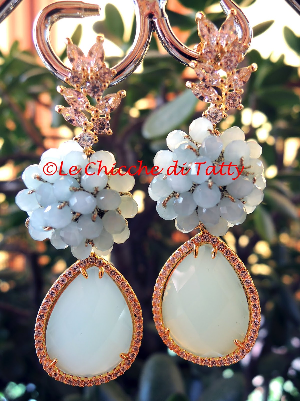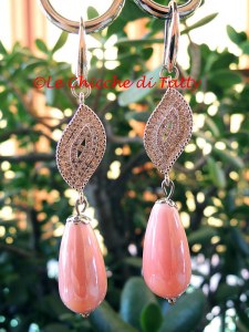 Orecchini con particolare lavorato all’uncinetto con filato gioiello e cristalli. Centrale filigrana in ottone e come pendente una goccia di marcasite.