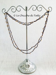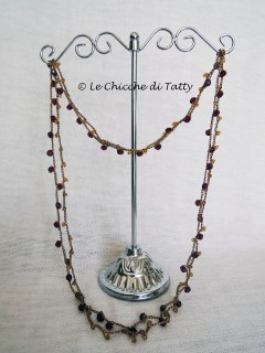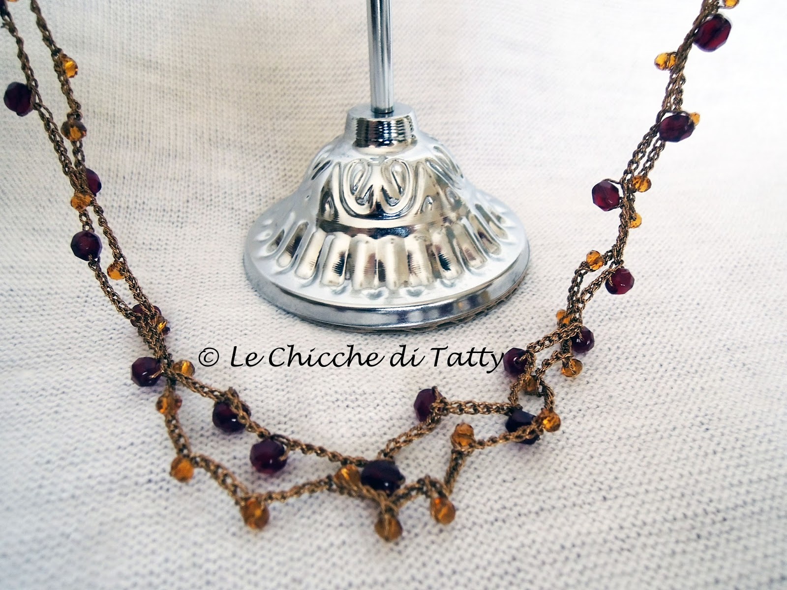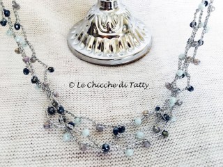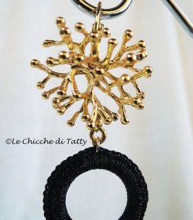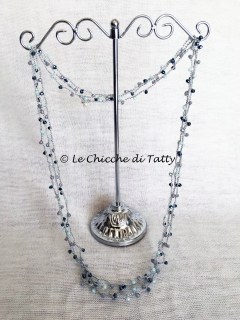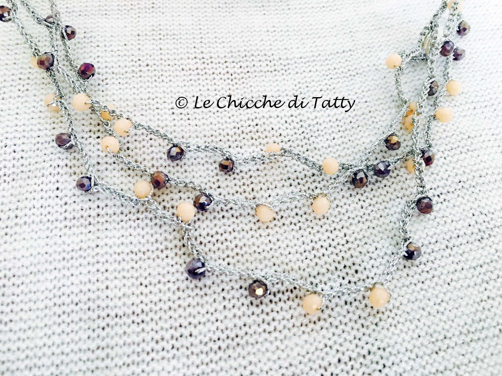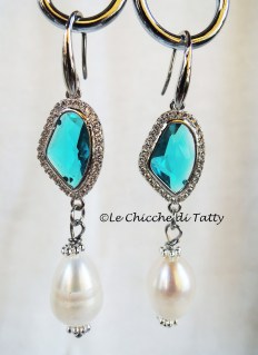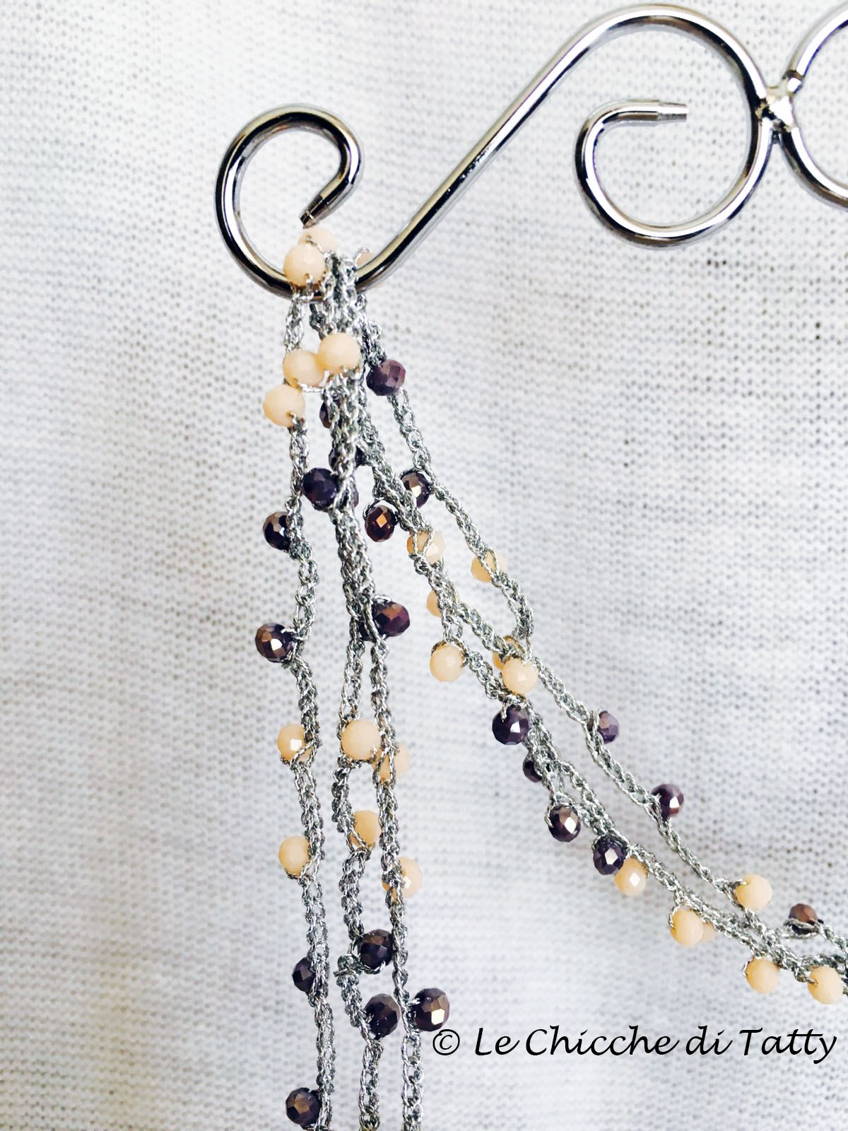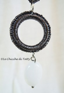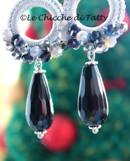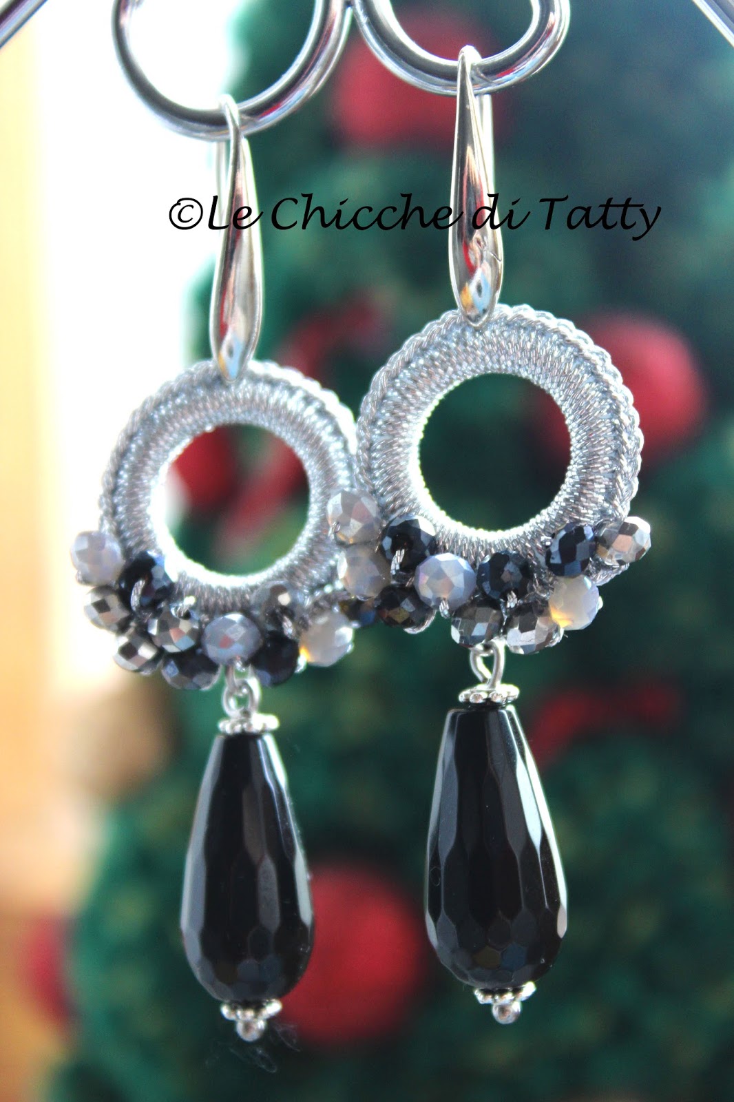 Gli orecchini hanno un particolare lavorato all’uncinetto con filato gioiello argento e cristalli in tre toni di grigio, sono completati da una goccia di onice.
