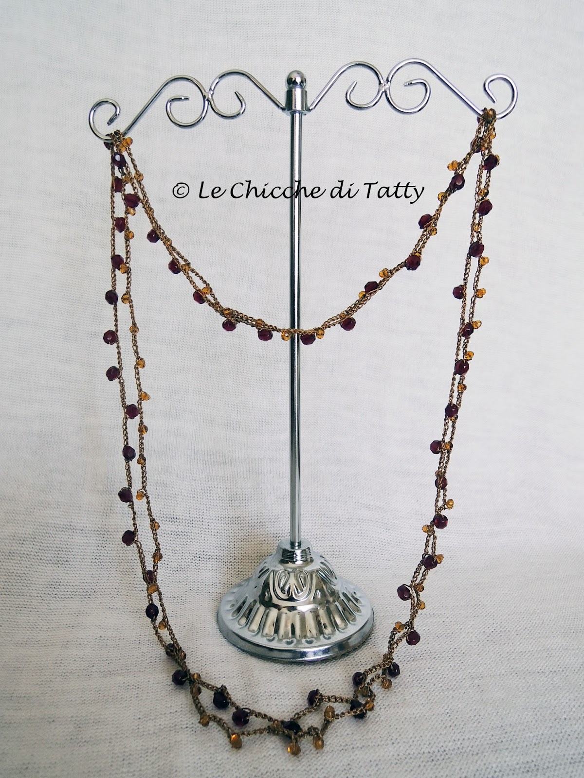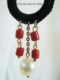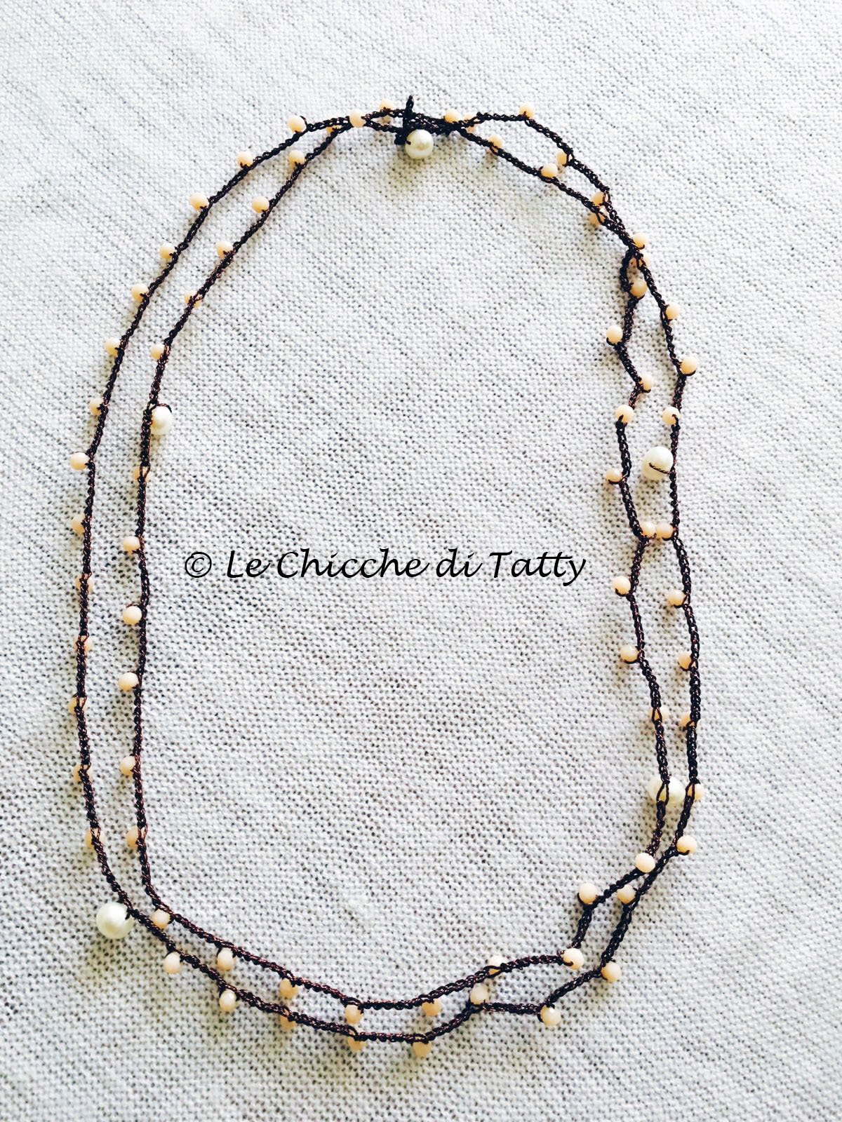 La collana ha come pendente una tamburella dipinta a mano ed è completata da perle di fiume e corallo bambù.