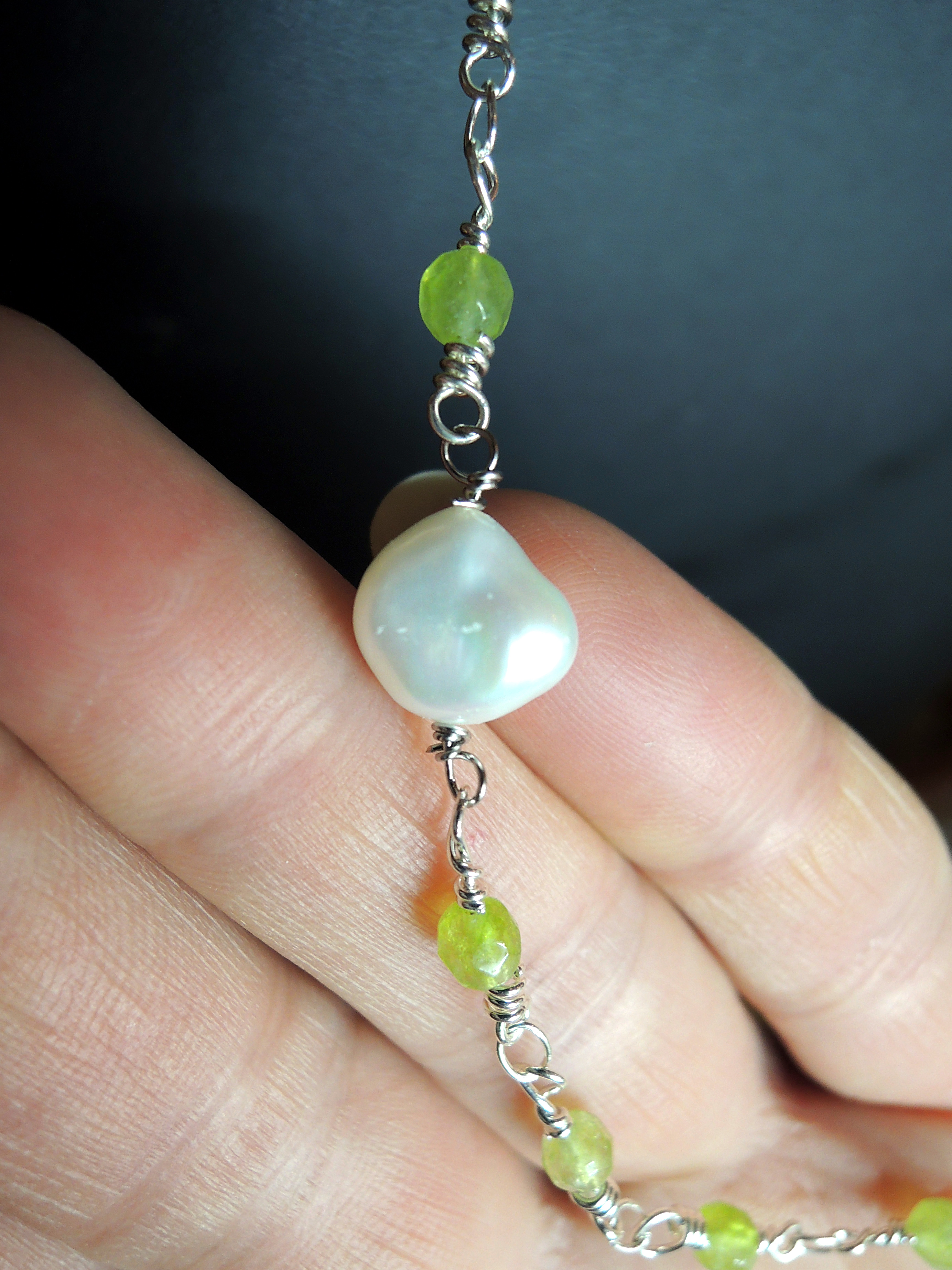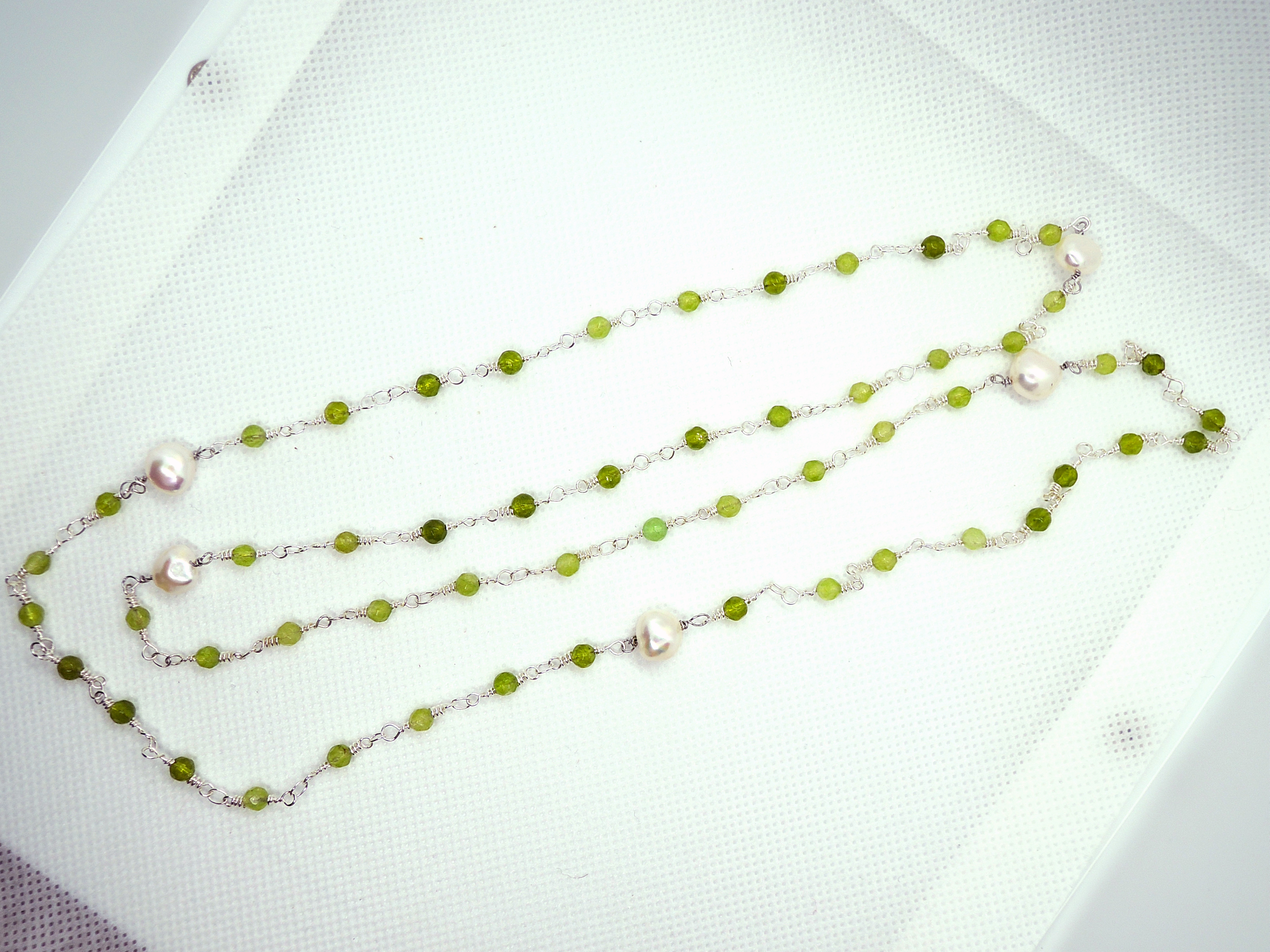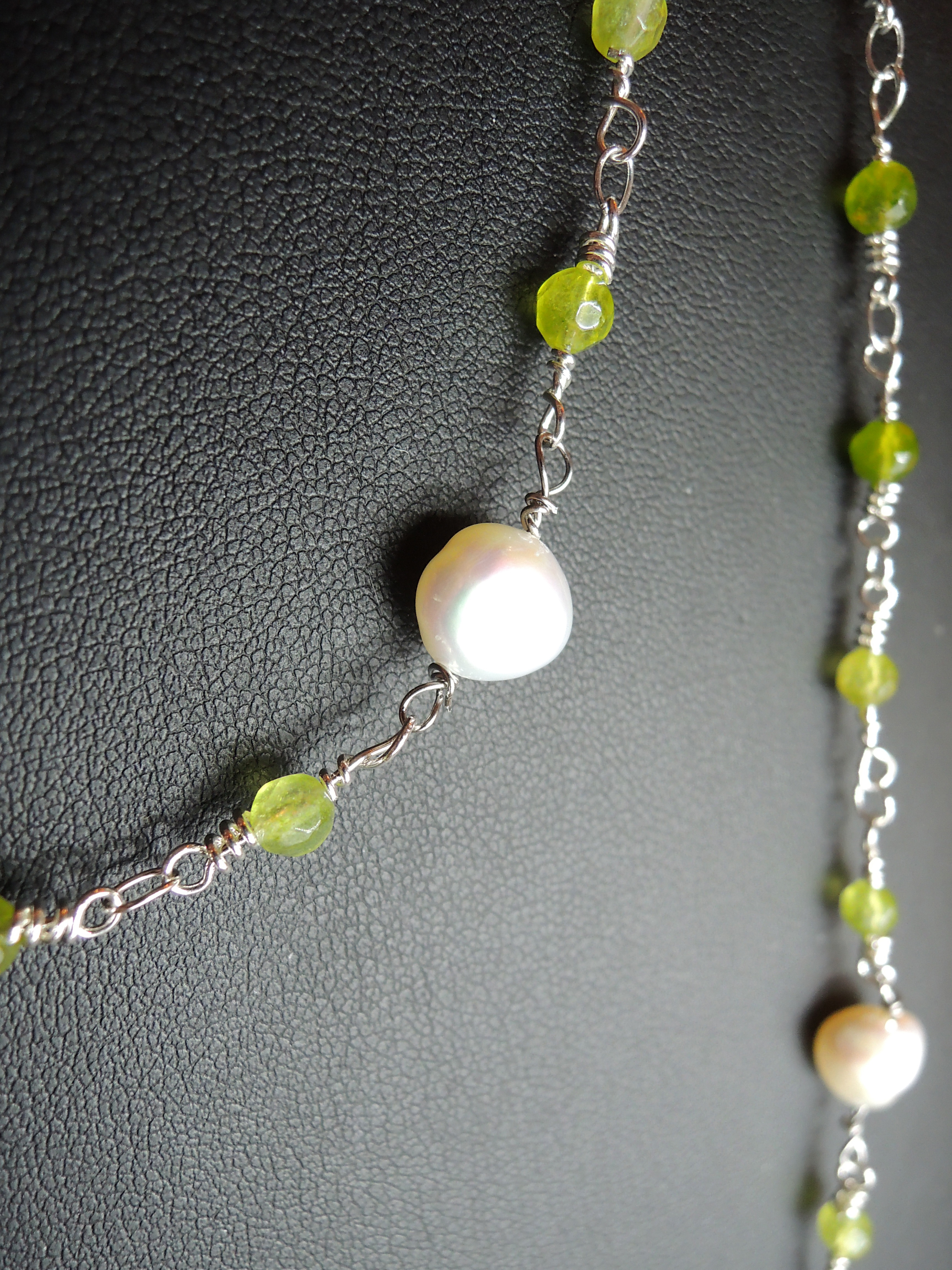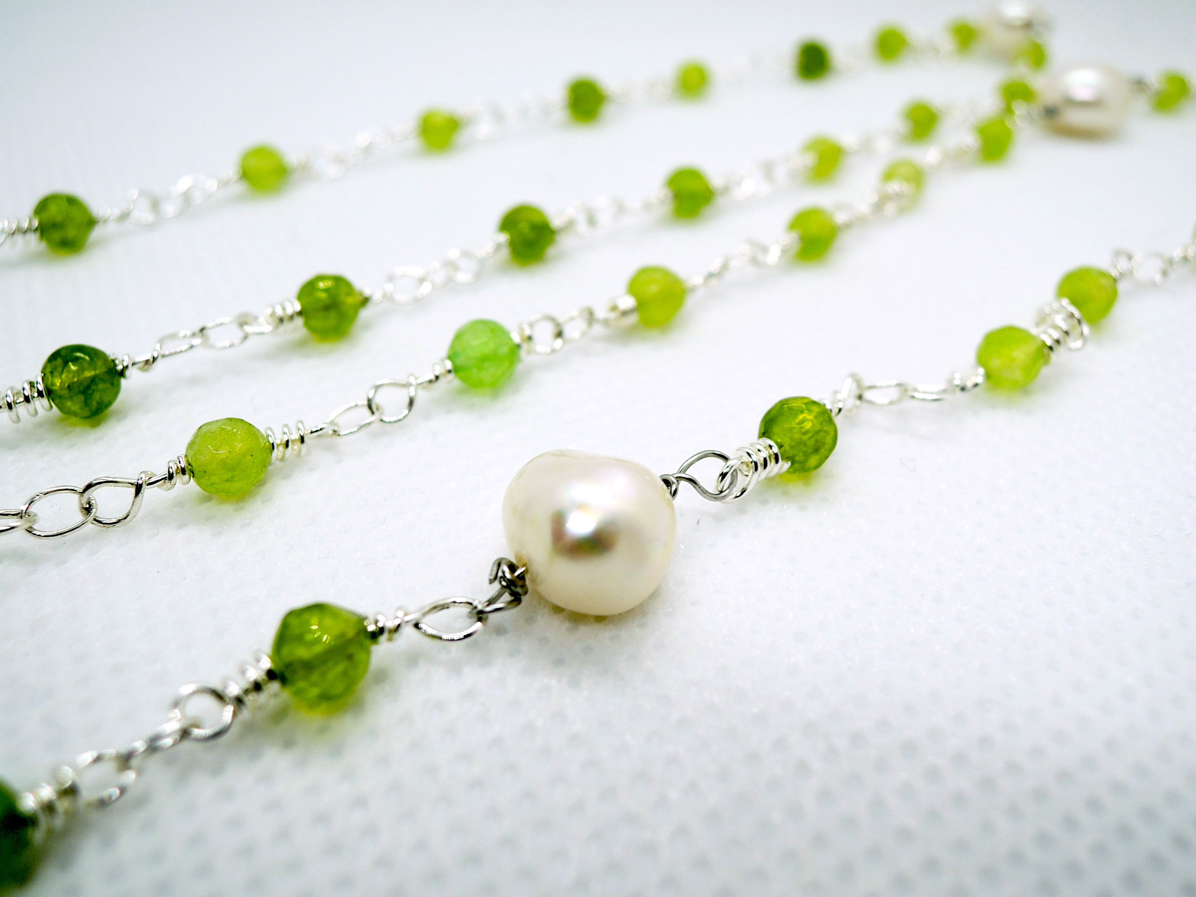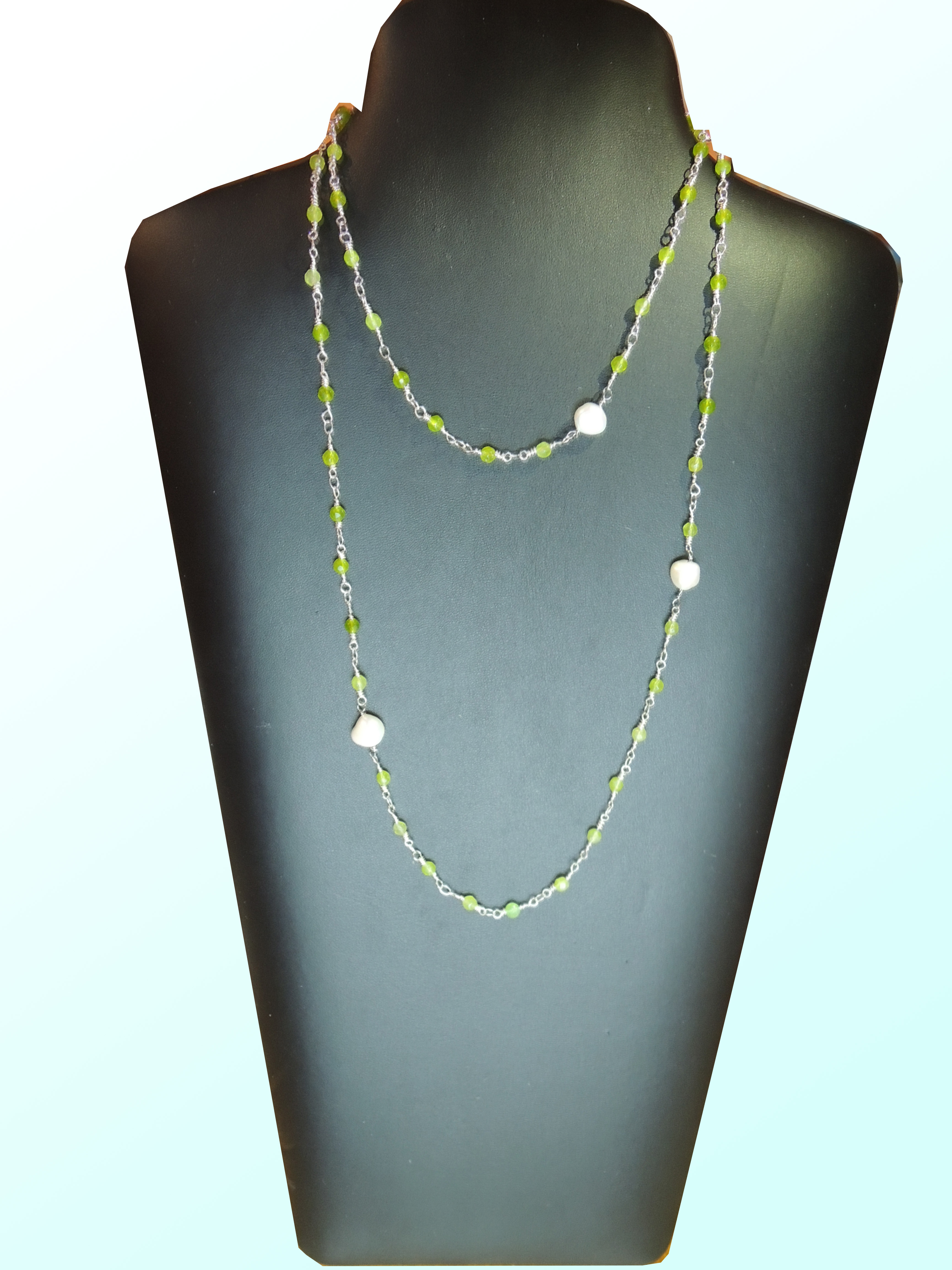 Collana “rosario” con agata verde e perle di fiume naturali. Il colore verde brillante rende questo gioiello particolarmente luminoso, e risalta bene su un abito scuro grazie anche al colore chiaro delle perle di fiume. Può essere indossata regolandone la lunghezza con due o tre giri intorno al collo, o lasciandola molto lunga facendone un solo giro che scende al petto. Il suo design semplice ed elegante allo stesso tempo, la rendono adatta ad essere abbinata sia ad un look elegante, che ad un outfit casual e sportivo. Può essere il regalo ideale per la persona che ami, per un’amica speciale, per tua figlia o per la mamma…