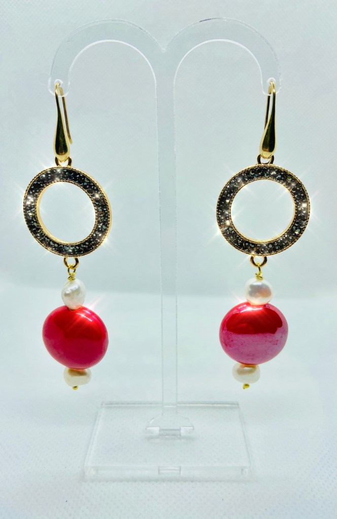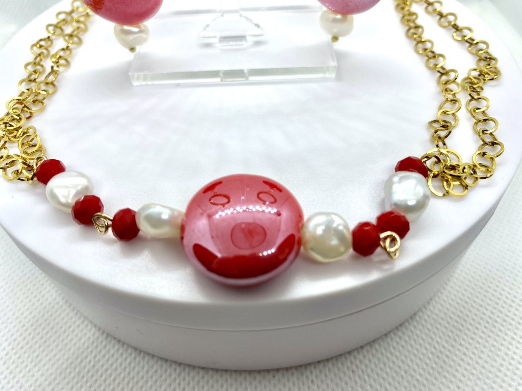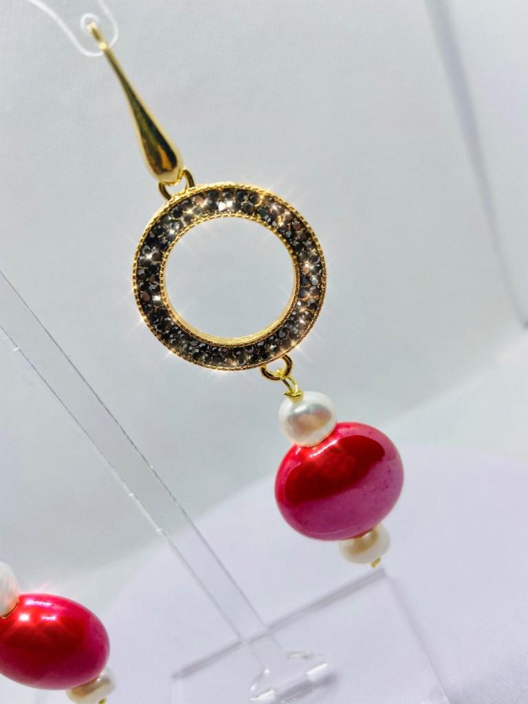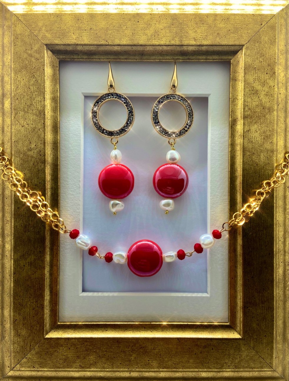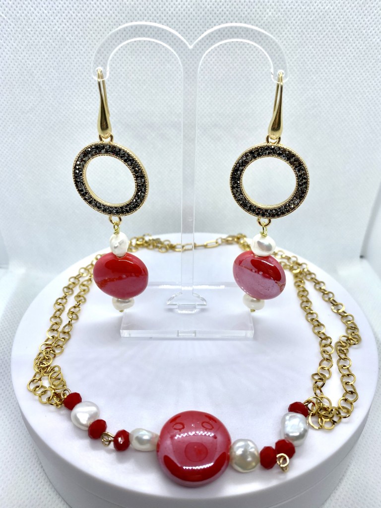 Parure composta da orecchini pendenti donna con disco centrale in ottone e marcasite e pendenti con disco in ceramica di colore rosso e perle di fiume naturali.. La monachella a goccia è in acciaio dorato. Il girocollo con catenelle multiple in acciaio dorato, disco centrale in ceramica di colore rosso, perle di fiume naturali e cristalli rossi. La chiusura del girocollo è a moschettone in acciaio dorato. Il rosso, e l’oro…. I colori delle feste natalizie per eccellenza…. E il Natale si avvicina! Regalate questa splendida parure alle persone a voi più care, realizzata interamente a mano con materiali di primissima scelta e qualità!
