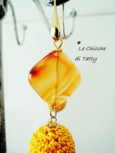 Questi gialli invece sono composti da un quadrato di corniola sfaccettata da cui pende una sfera ricoperta sempre da un filato Viscosa giallo lavorato anch’esso all’uncinetto.
