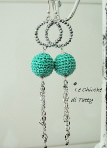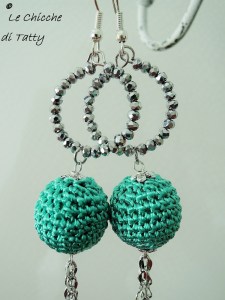 Il primo paio che vi propongo è formato da due sferette rivestite in Viscosa lavorata all’uncinetto di colore verde TIFFANY, tenute da un cerchio di cristalli e con un finale di catenelle di acciaio lucido inalterabile molto luccicante.