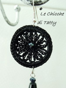 Il nero fa da protagonista in questo paio di orecchini che segue, composto da un fiore in VISCOSA nera lavorato all’uncinetto con al centro un cristallo nero.