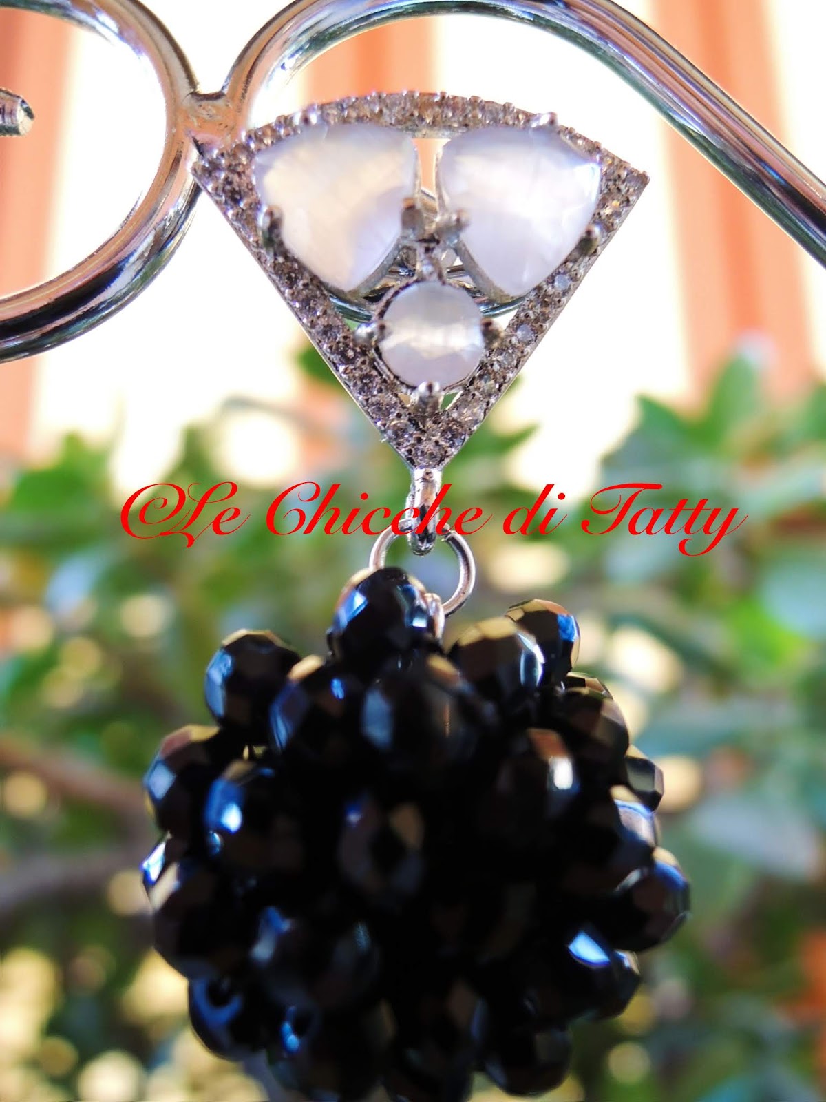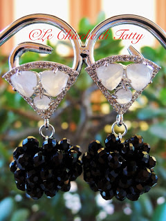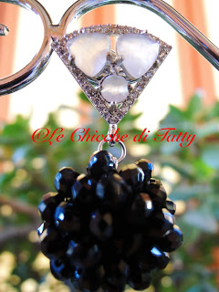 Orecchini con pendente lavorato all’uncinetto con filato gioiello e cristalli neri. Il perno è arricchito da pietre occhio di gatto (quarzo) bianco opalescente e zirconi.