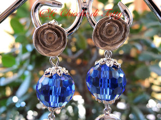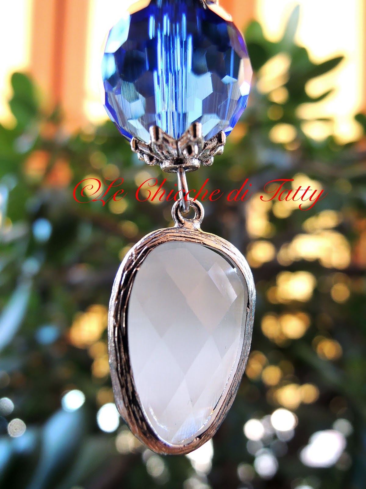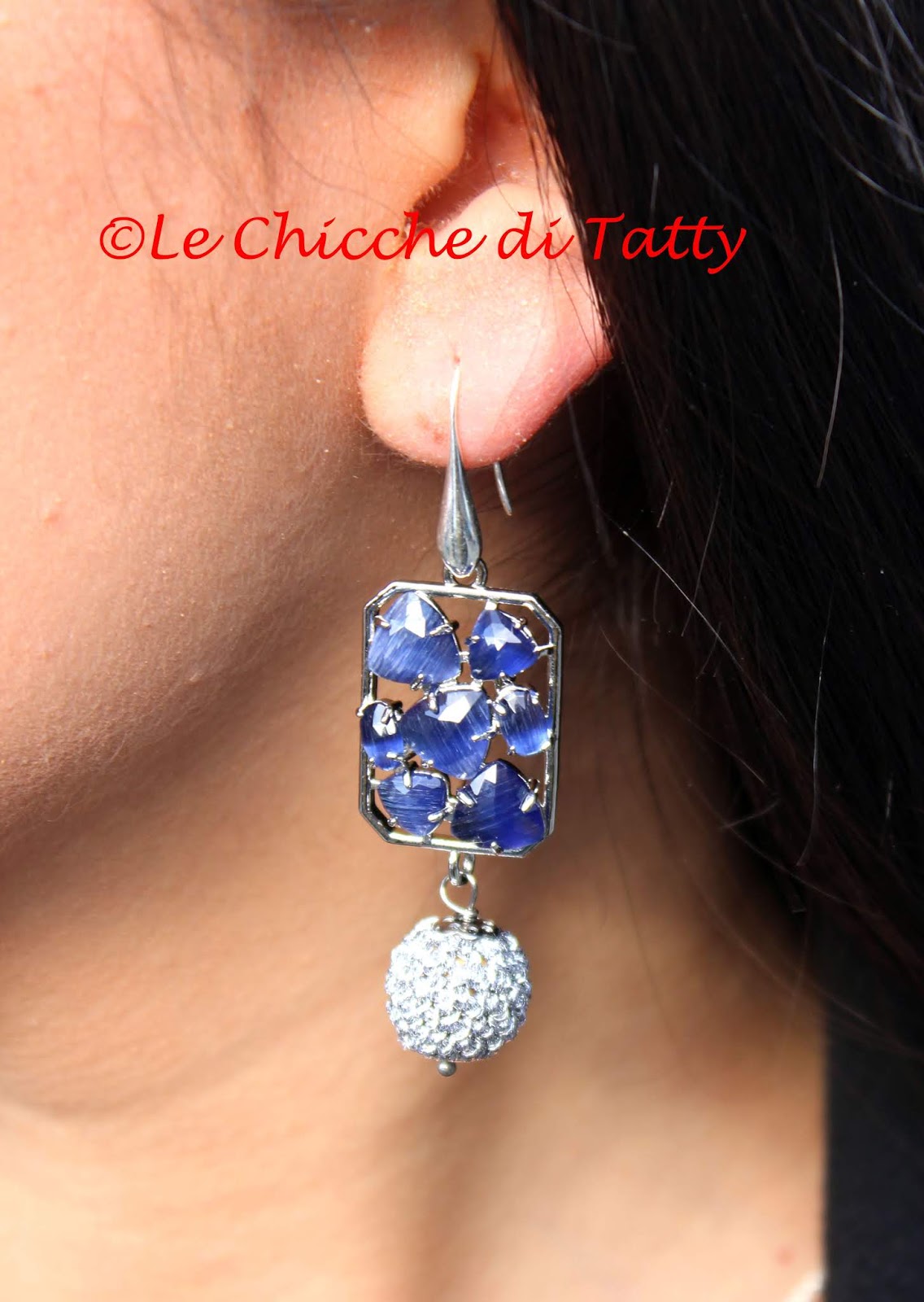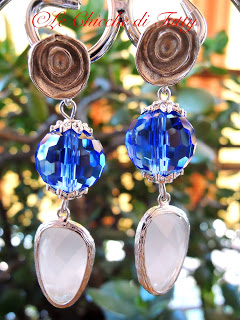 Orecchino pendente composto da una sfera di cristallo sfaccettata azzurra, molto luminosa. Il pendente ha una forma a goccia irregolare ed è un occhio di gatto (quarzo) di colore bianco opalescente, ed è anche essa sfaccettata. Il perno che sostiene il tutto ha il disegno di una rosellina stilizzata, in lega “zama” anallergica con chiusura posteriore.