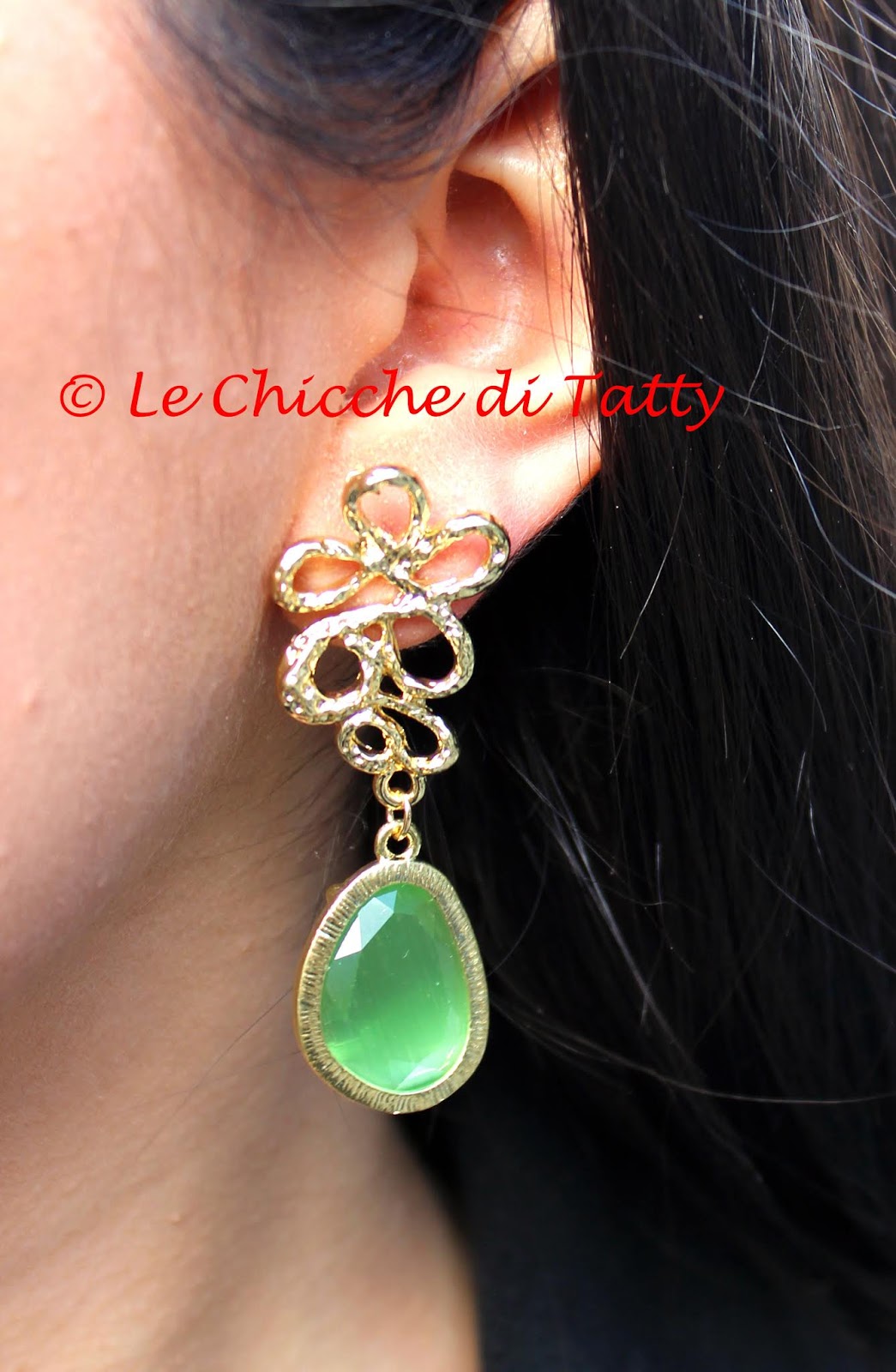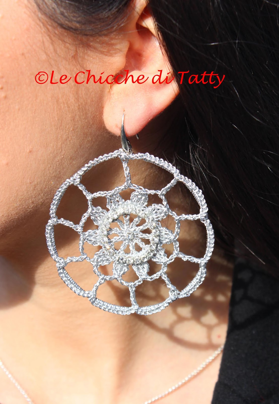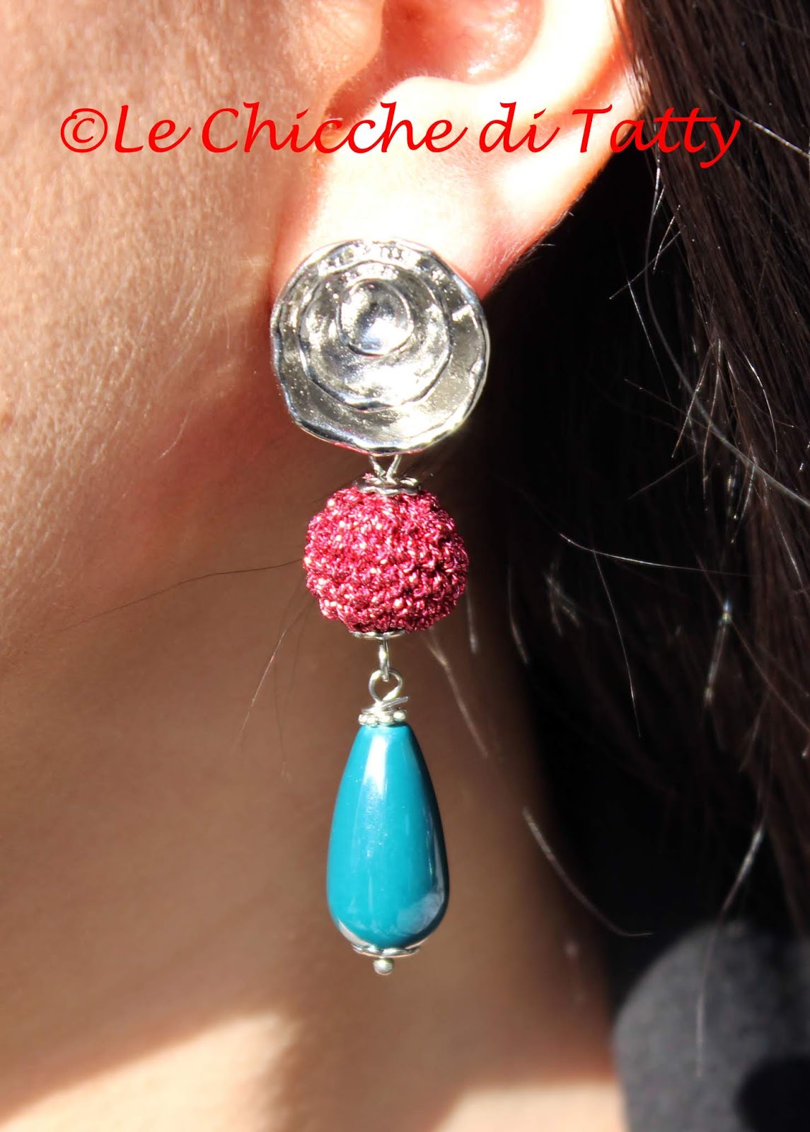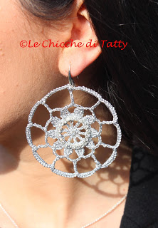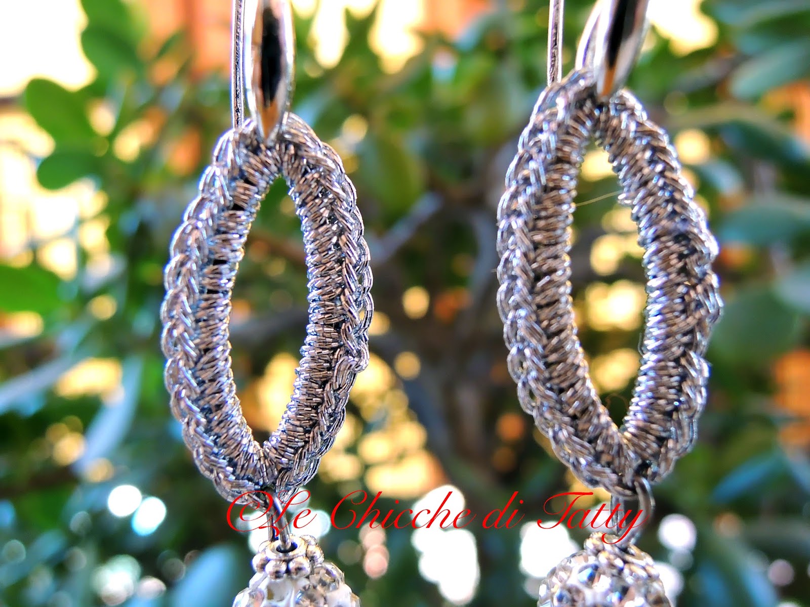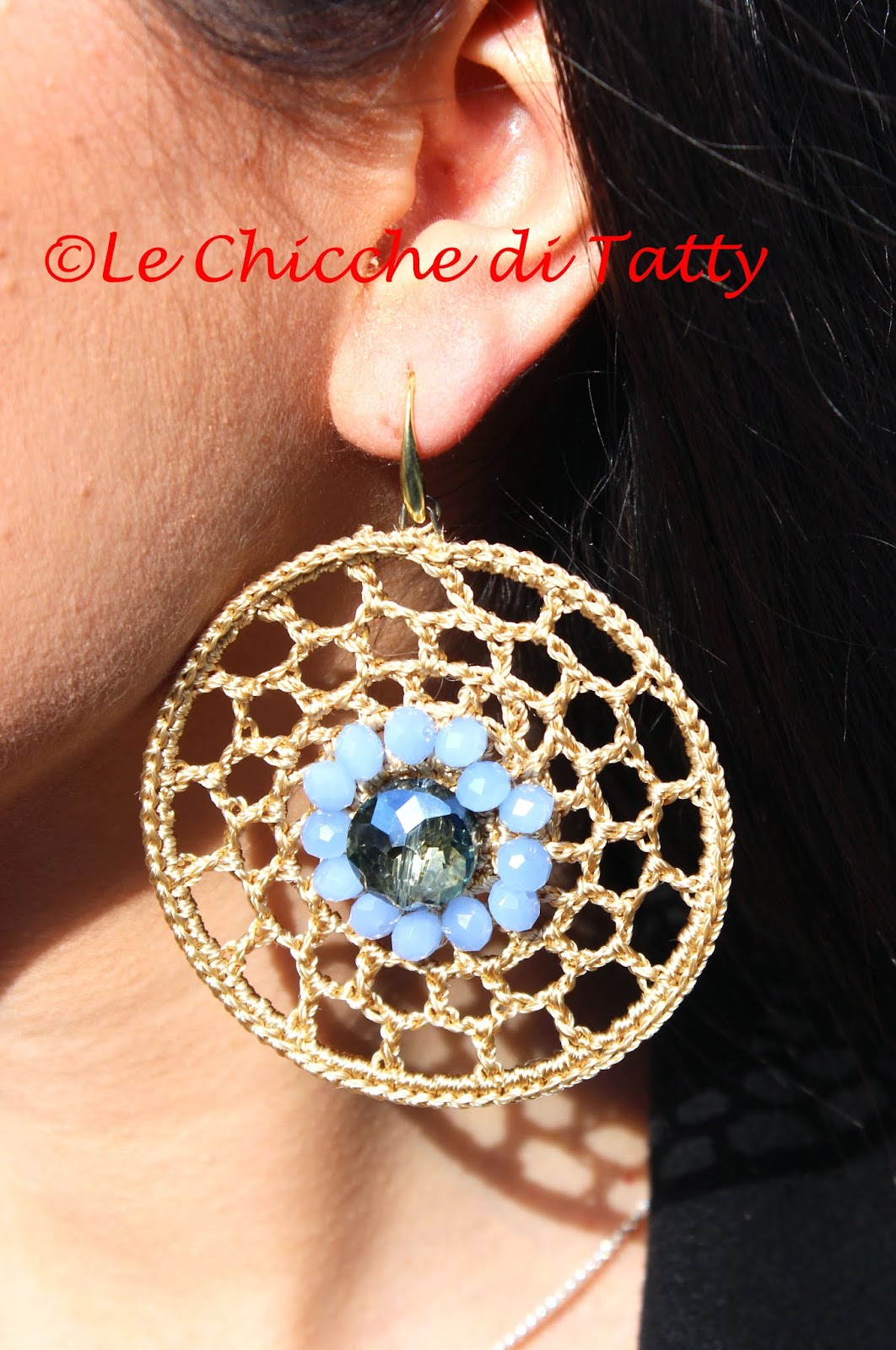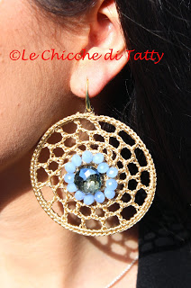 Orecchini con pendente all’uncinetto e occhio di gatto.