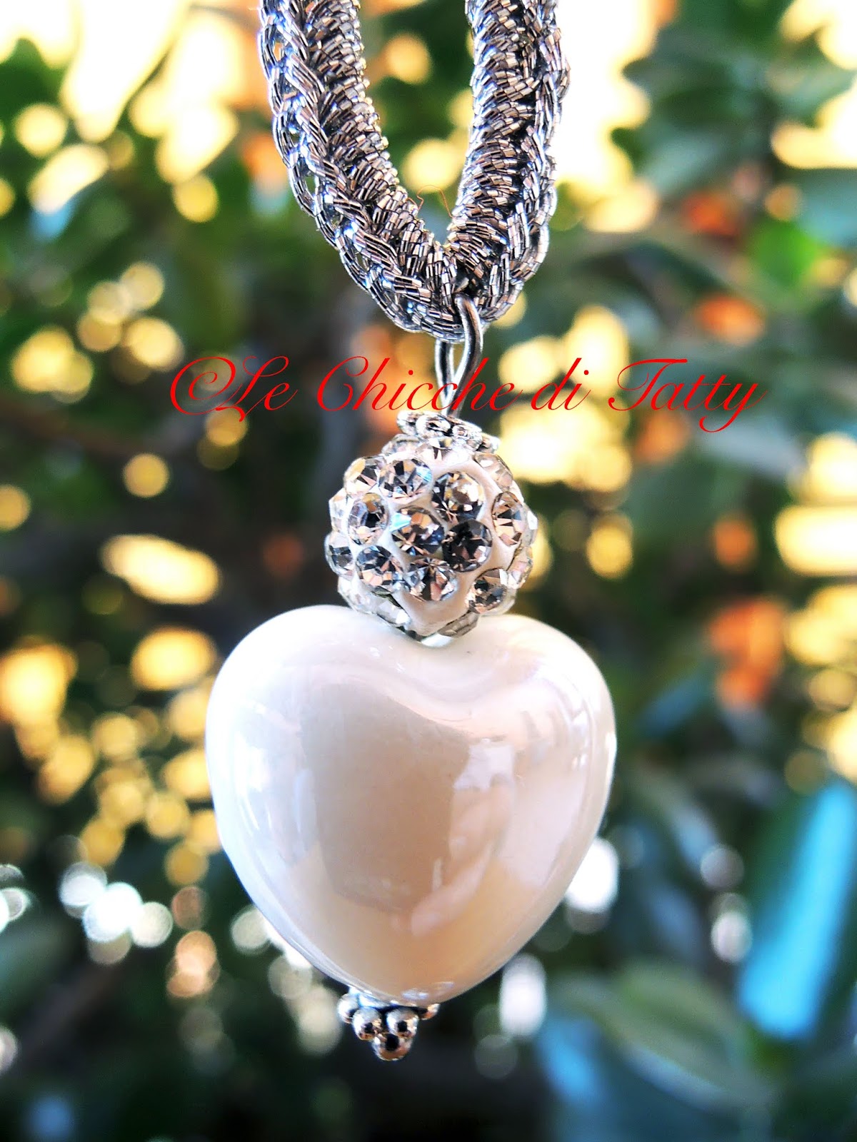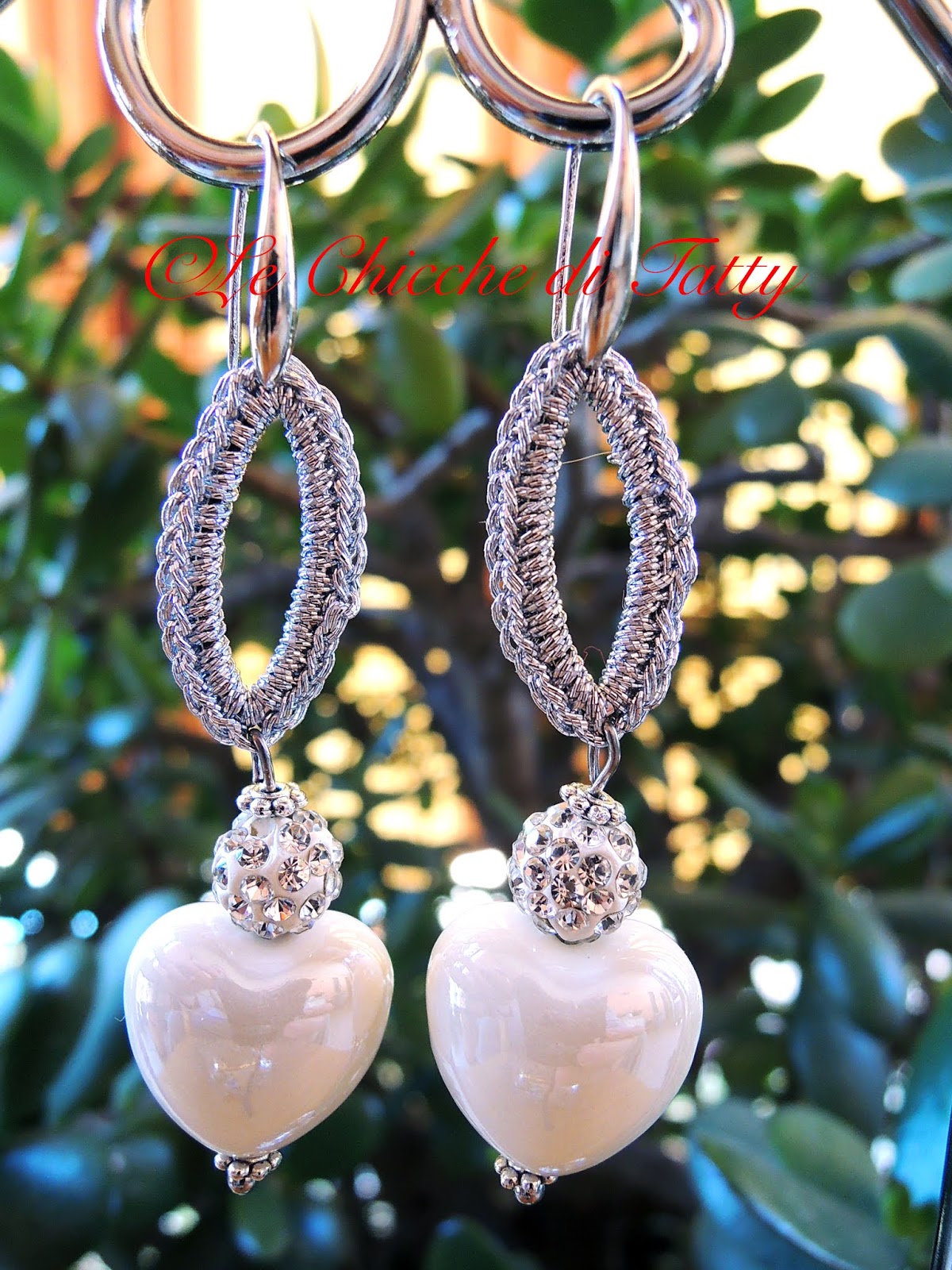 Orecchino pendente con particolare centrale di forma ovale lavorato all’uncinetto con filato gioiello di colore argento. La sfera è completamente ricoperta da un pavè di cristalli Swarovski luminosissimi. Il cuore che completa l’orecchino è in finissima ceramica bianca smaltata.