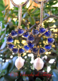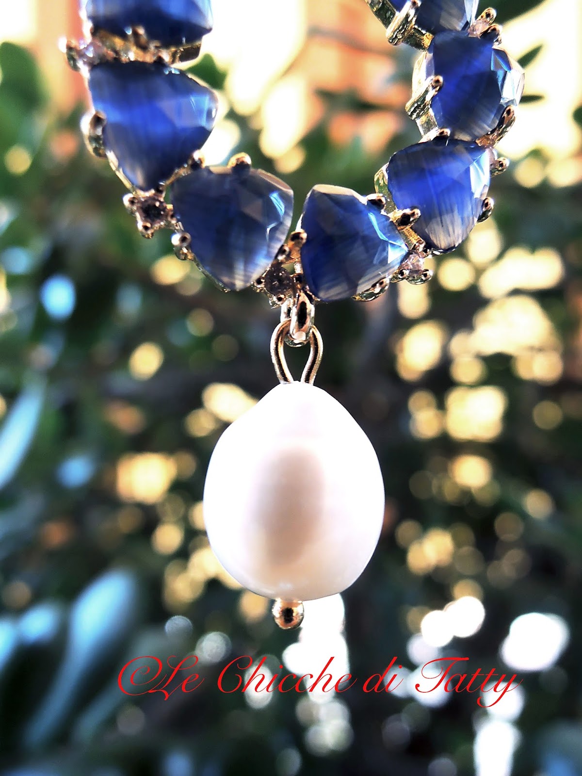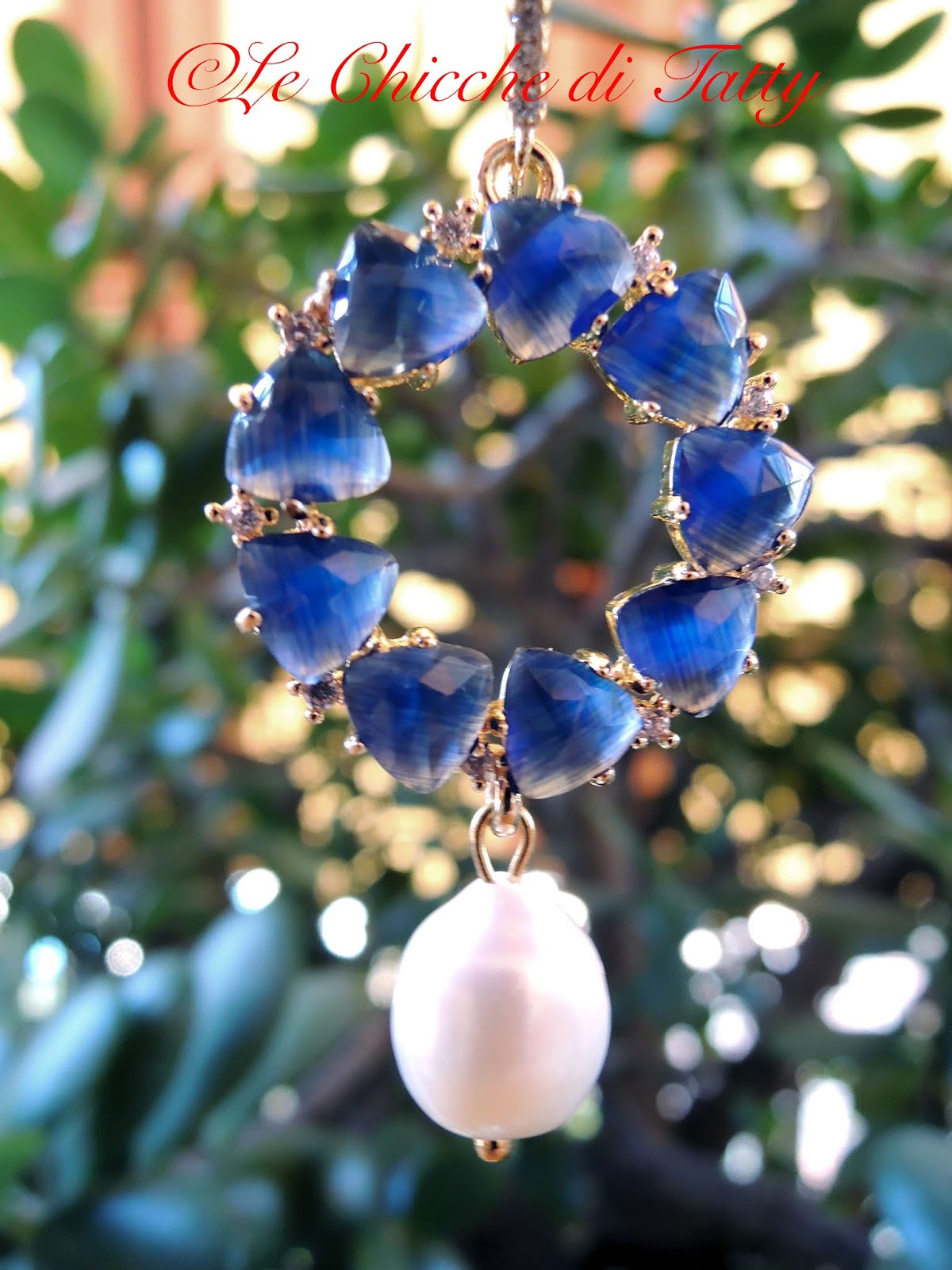 Orecchino pendente composto da un cerchio su cui sono incastonate fantastiche pietrenocchi di gatto blu intervallate da zirconi molto luminosi. La monachella è in ottone dorato anch’essa decorata con zirconi. Il pendente infine è una perla di fiume naturale.