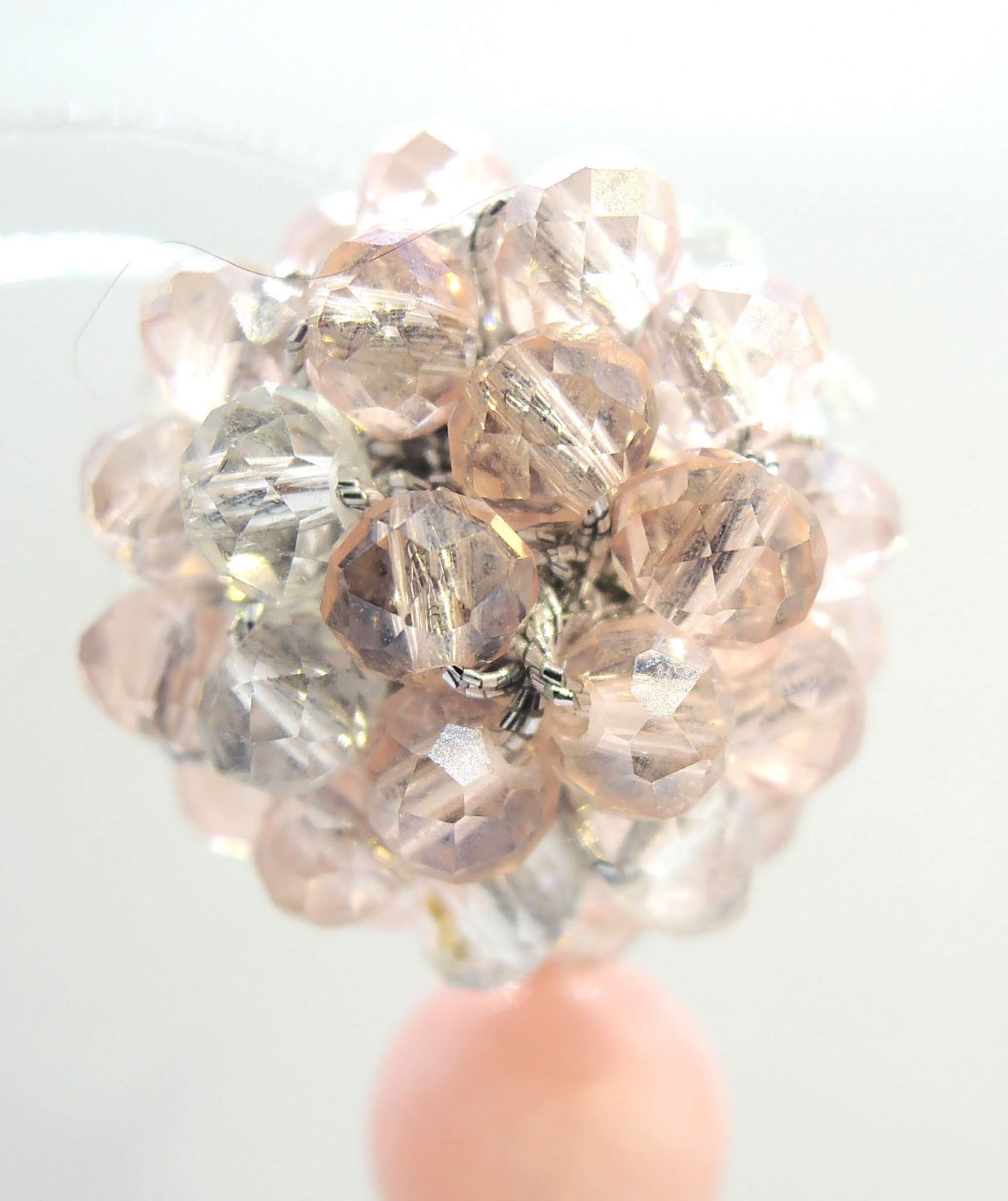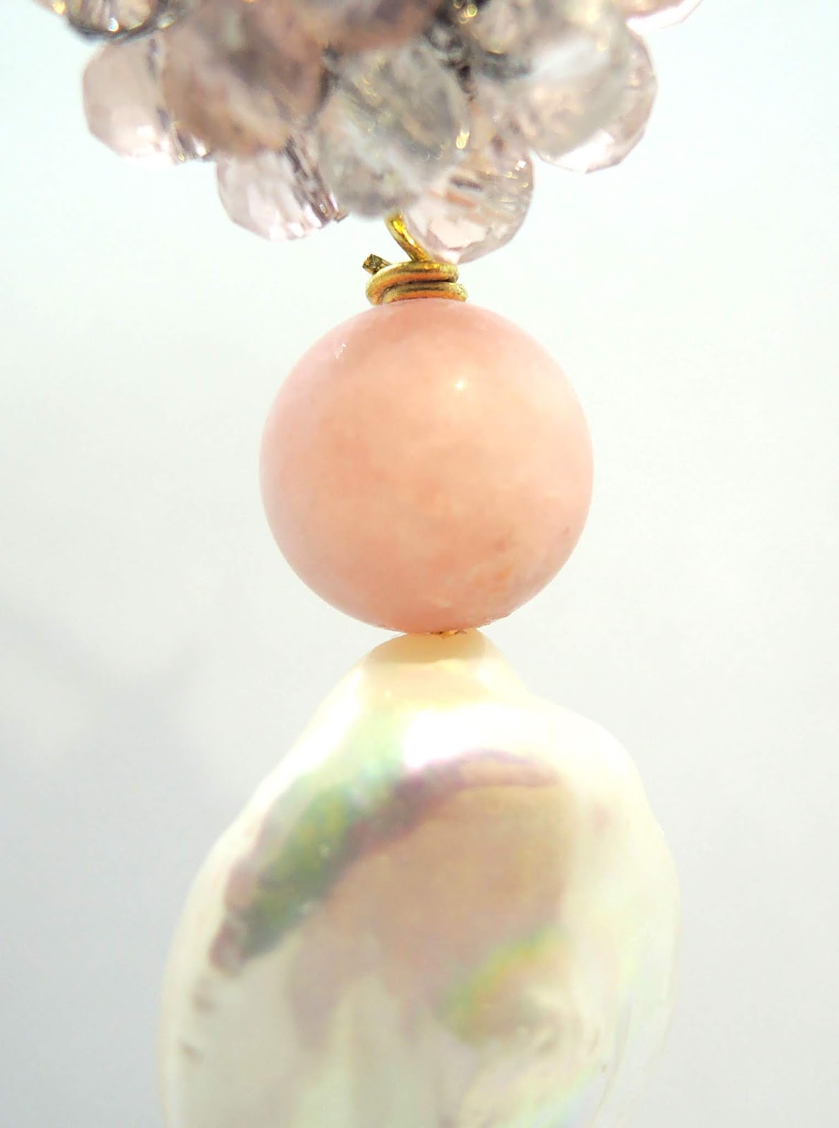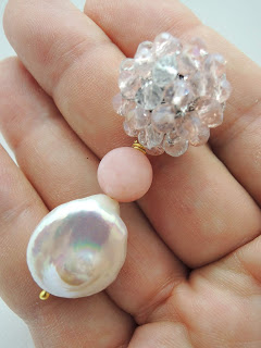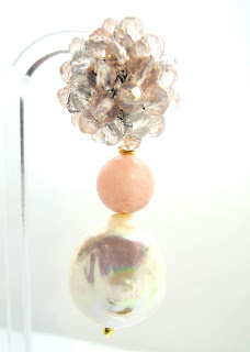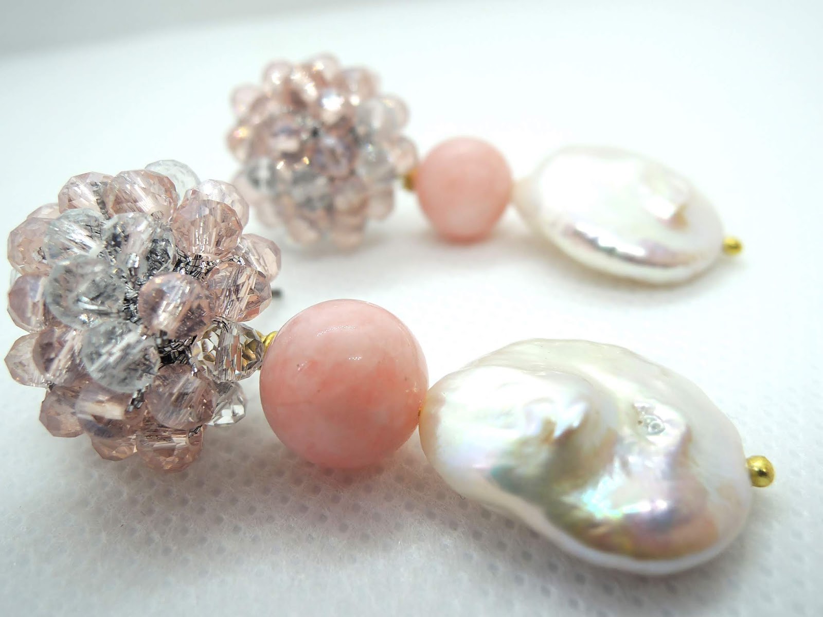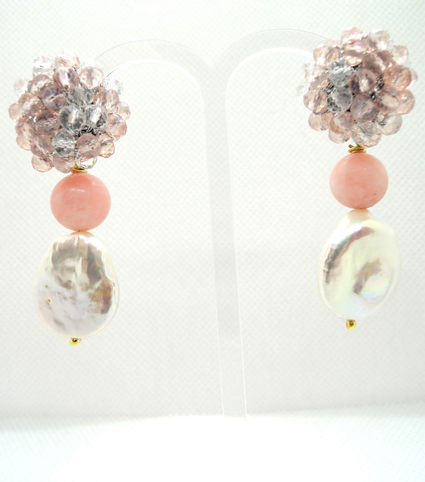Questi orecchini invece sono con cristalli rosa e trasparenti, giada rosa e perla barocca piatta.