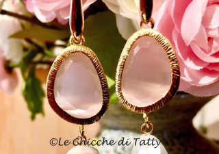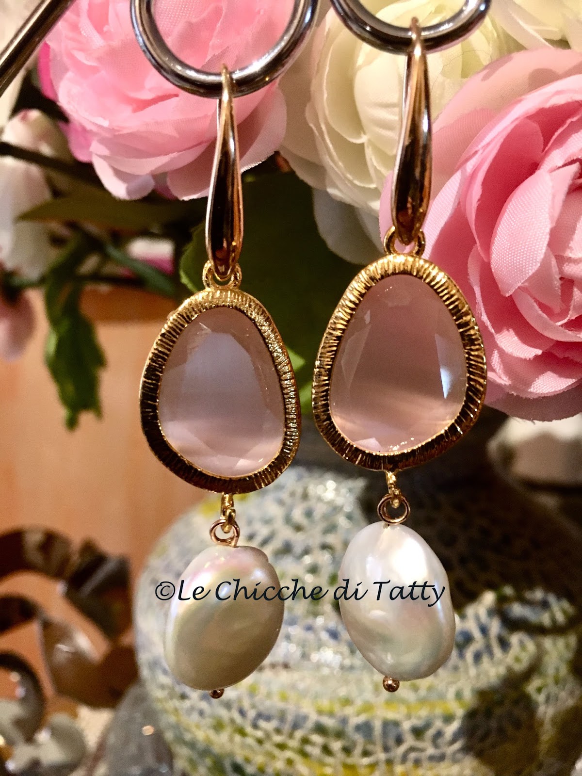 Elegantissimo questo paio di orecchini composti da cristalli occhio di gatto rosa e perle barocche piatte.
