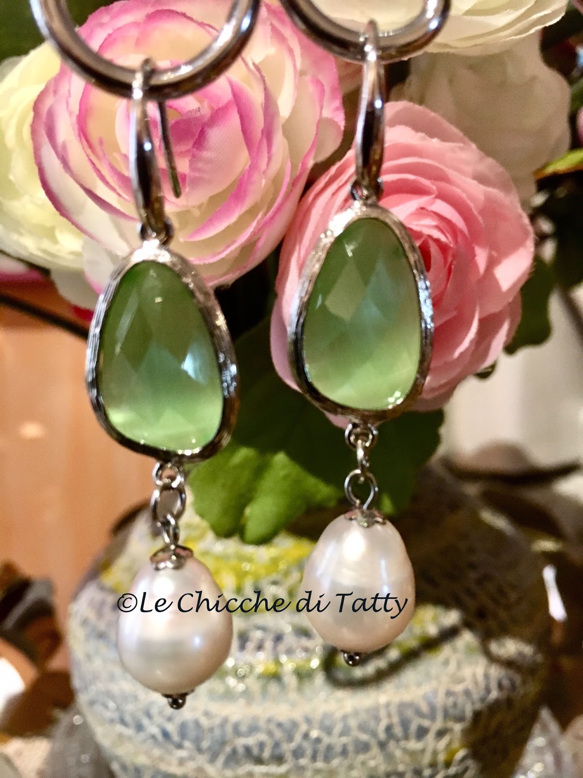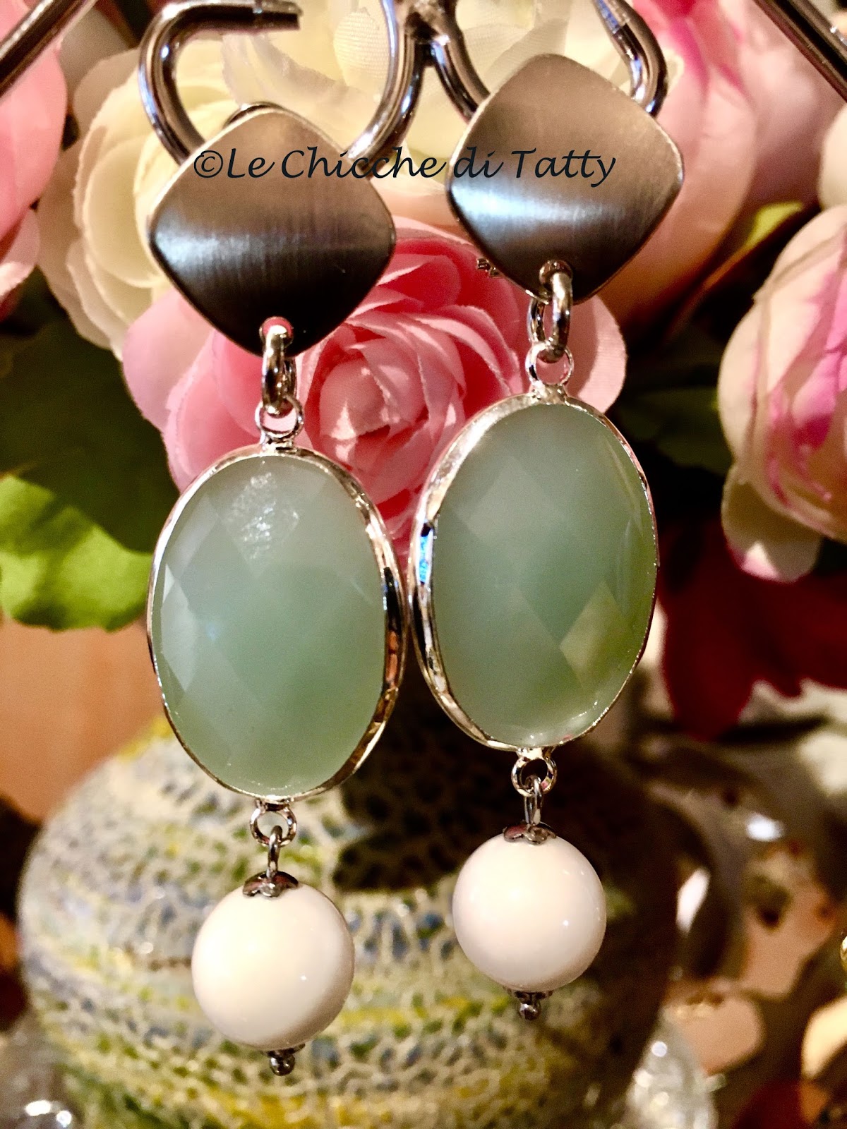 L’ultimo paio di orecchino, per oggi, è composto anch’esso da occhi di gatto verde ma in un’altra tonalità ed è completato da due sfere di conchiglia.