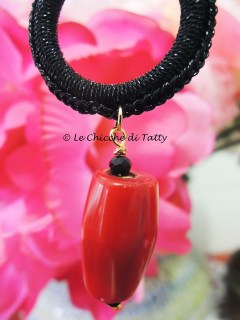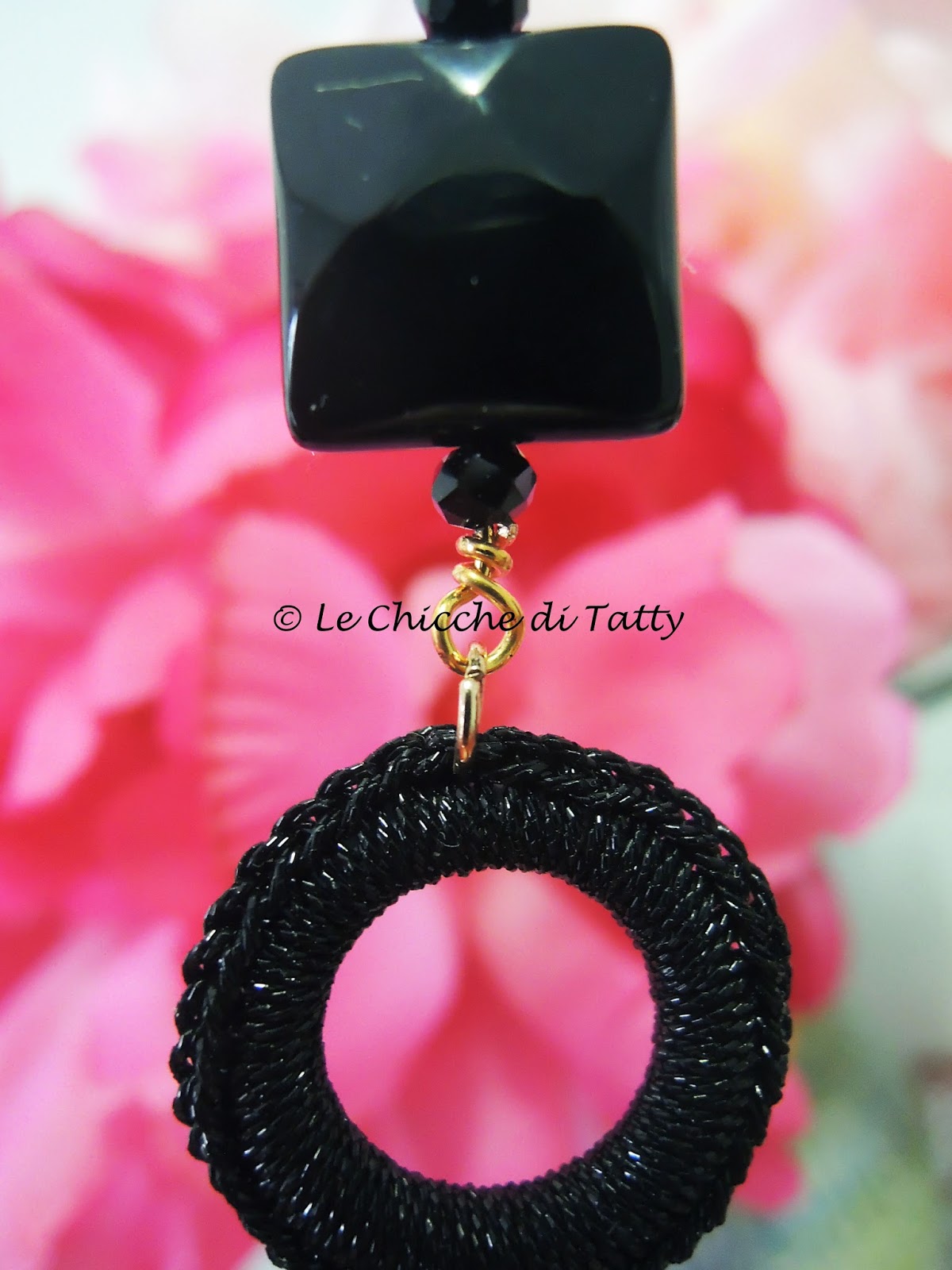 Monachella in ottone argentato, un rombo rivestito all’uncinetto con filato LUREX color argento e un pendente a goccia in onice di prima scelta.