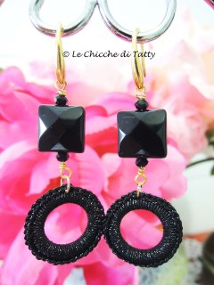 Un’agata nera striata è al centro di questo paio di orecchini, da cui pende una sferetta ricoperta all’uncinetto con LUREX color oro, il tutto sostenuto da monachelle in ottone dorato.