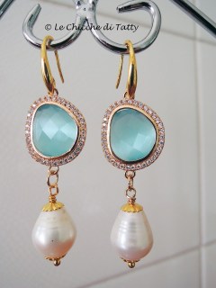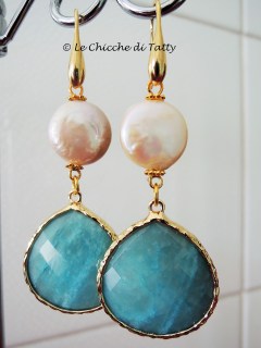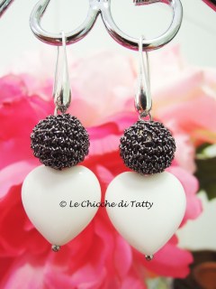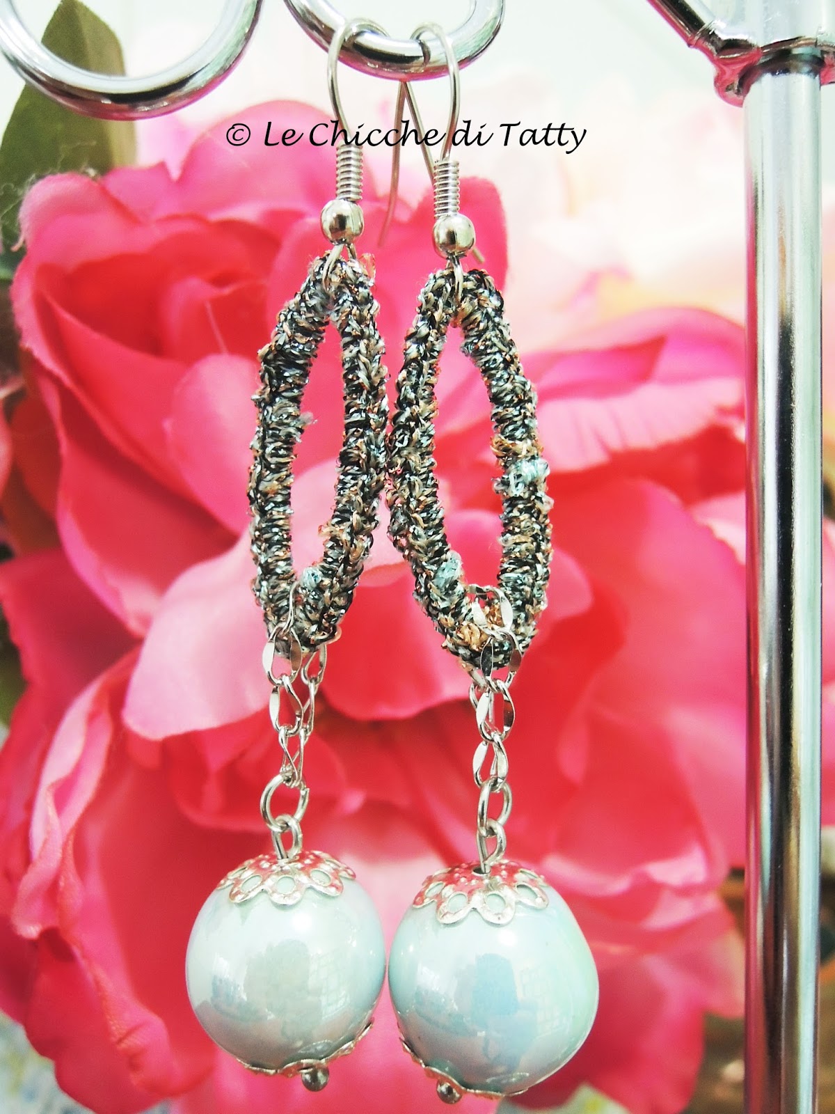 Il primo paio è composto da una perla barocca grigia sormontata da un cerchio lavorato all’uncinetto in LUREX color argento e completato da piccoli cristalli dello stesso colore.