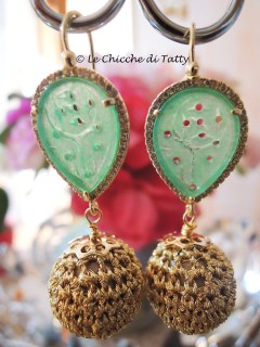 Gli orecchini che seguono sono formati da una monachella d’ottone dal disegno geometrico, disegno che ritroviamo nel rombo ed il cerchio ricoperti all’uncinetto con filato LUREX verde e per finire un’agata completa il tutto.