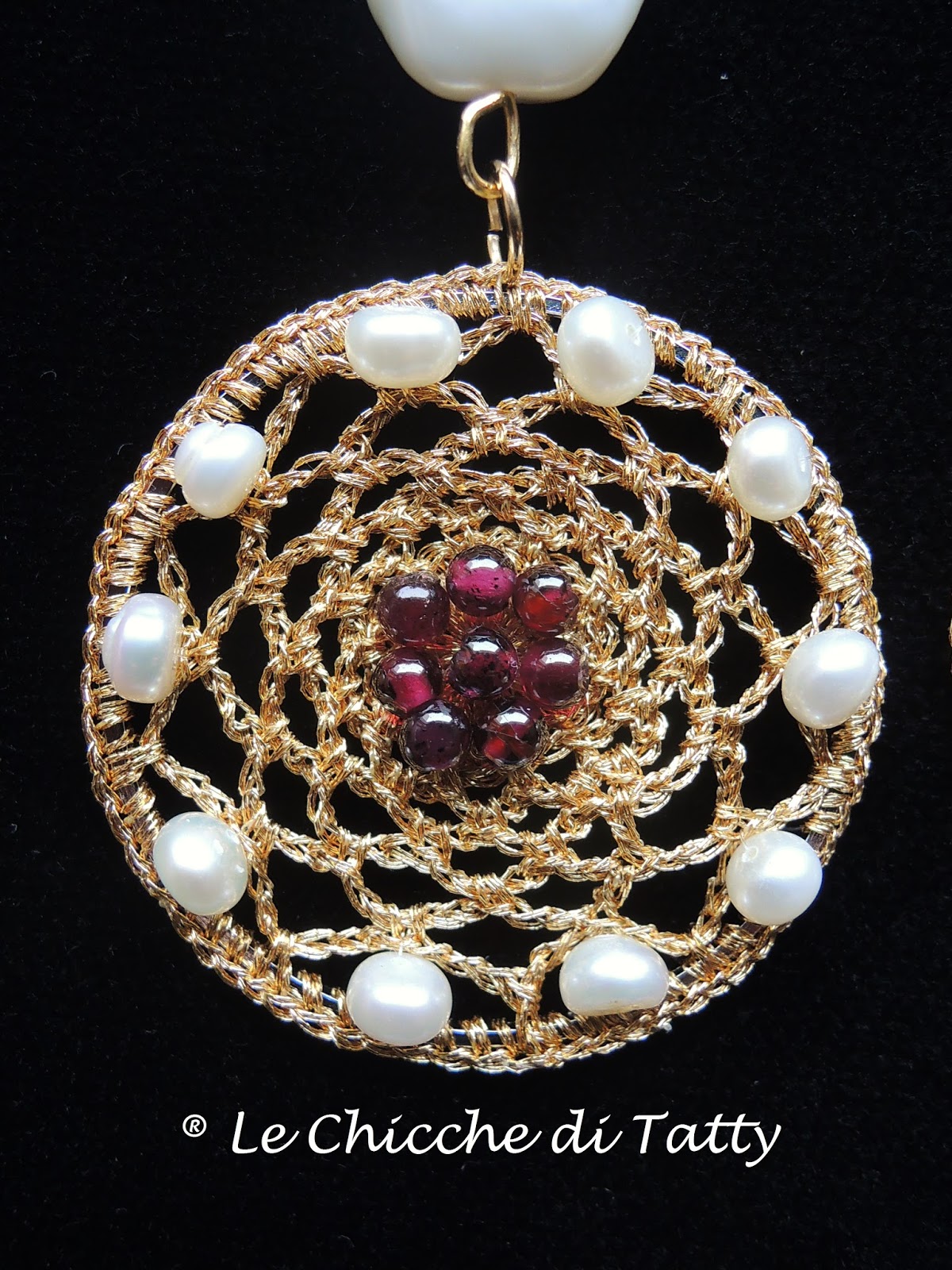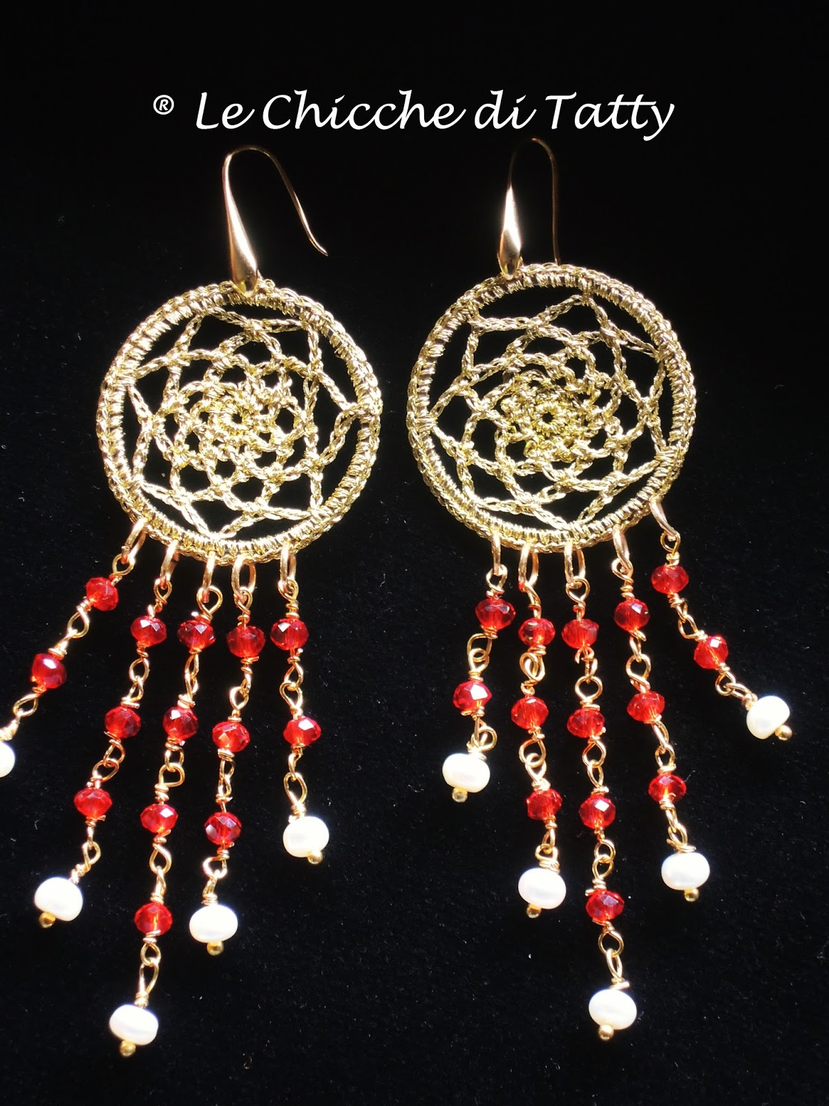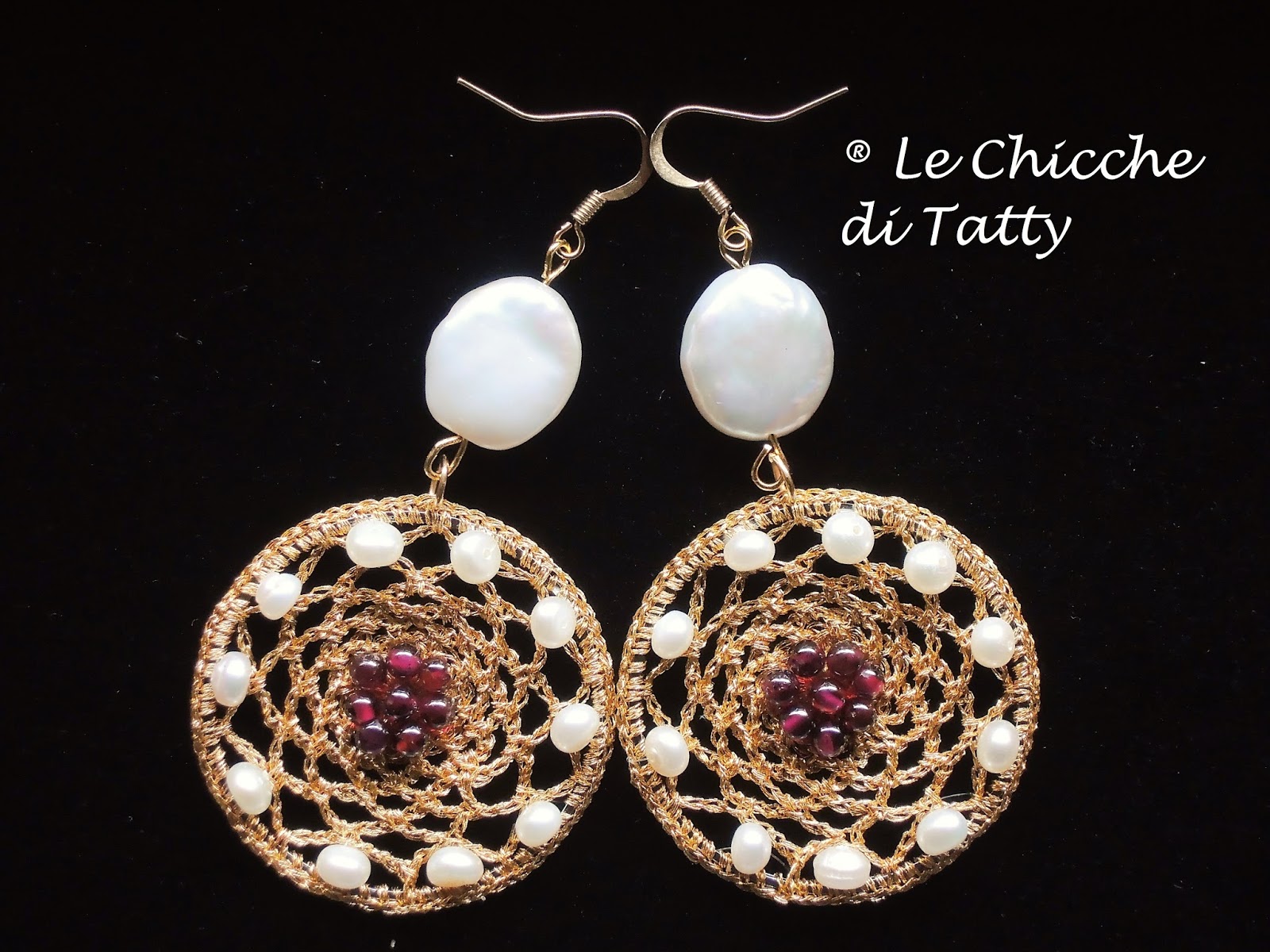 Questi orecchini fanno completo con il bracciale. Sono realizzati all’uncinetto con filato gioiello, granati e cubetti di ematite dorata.