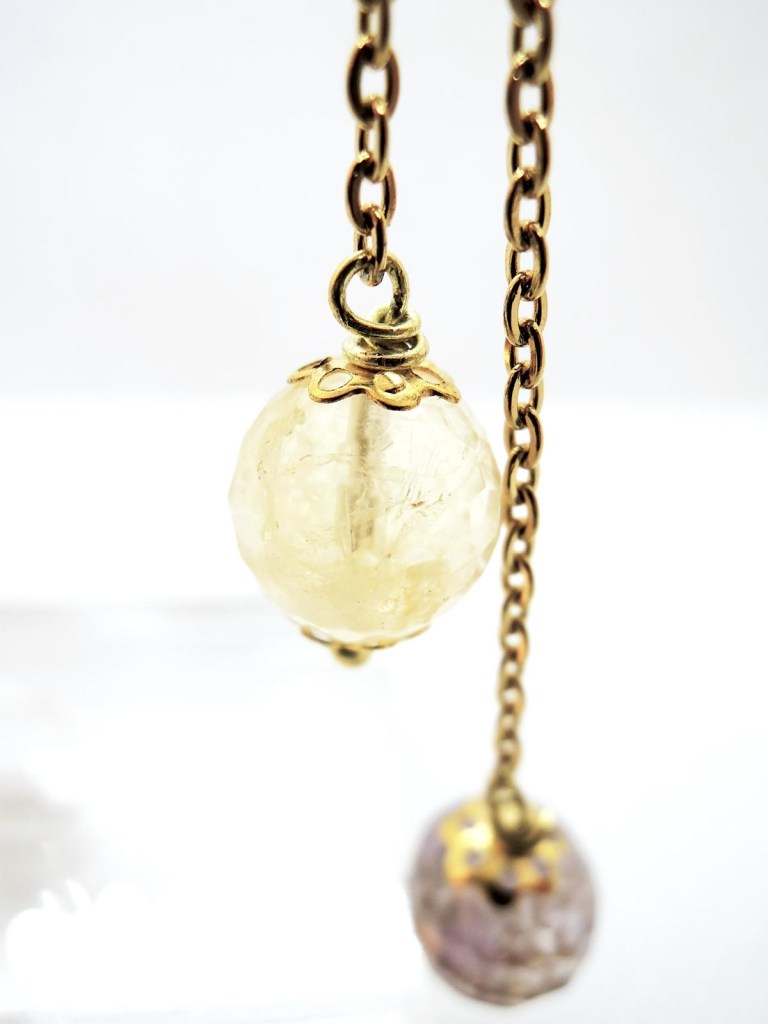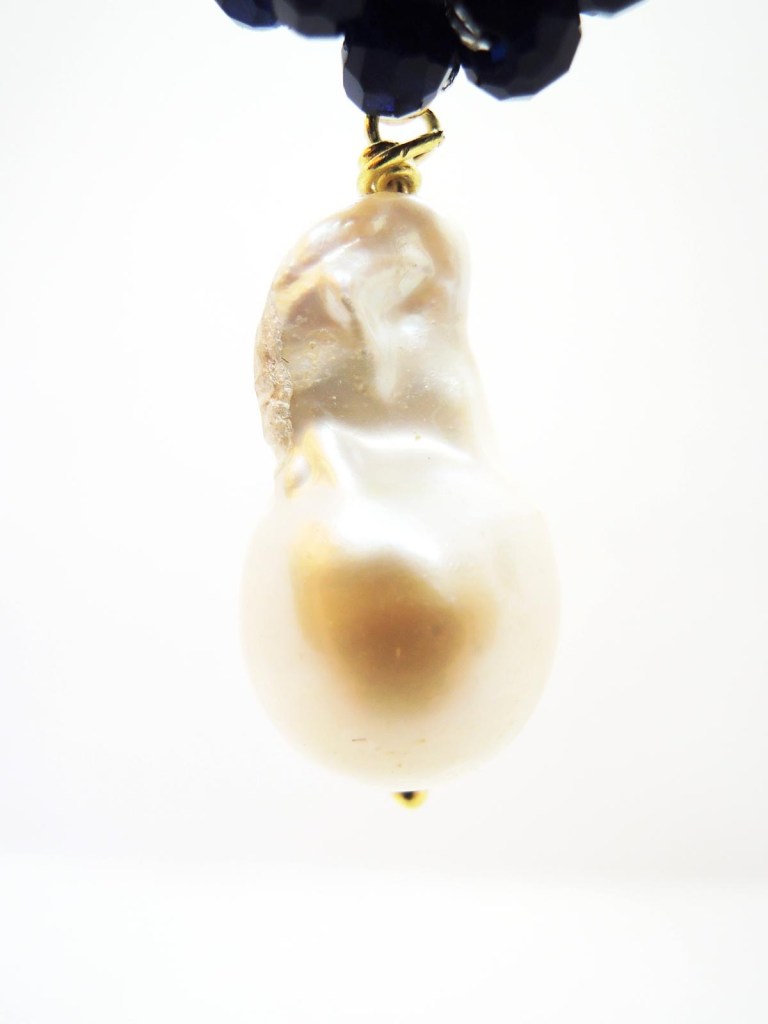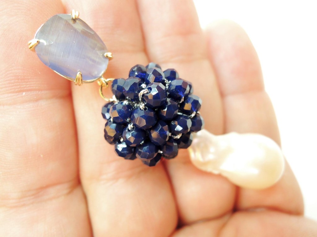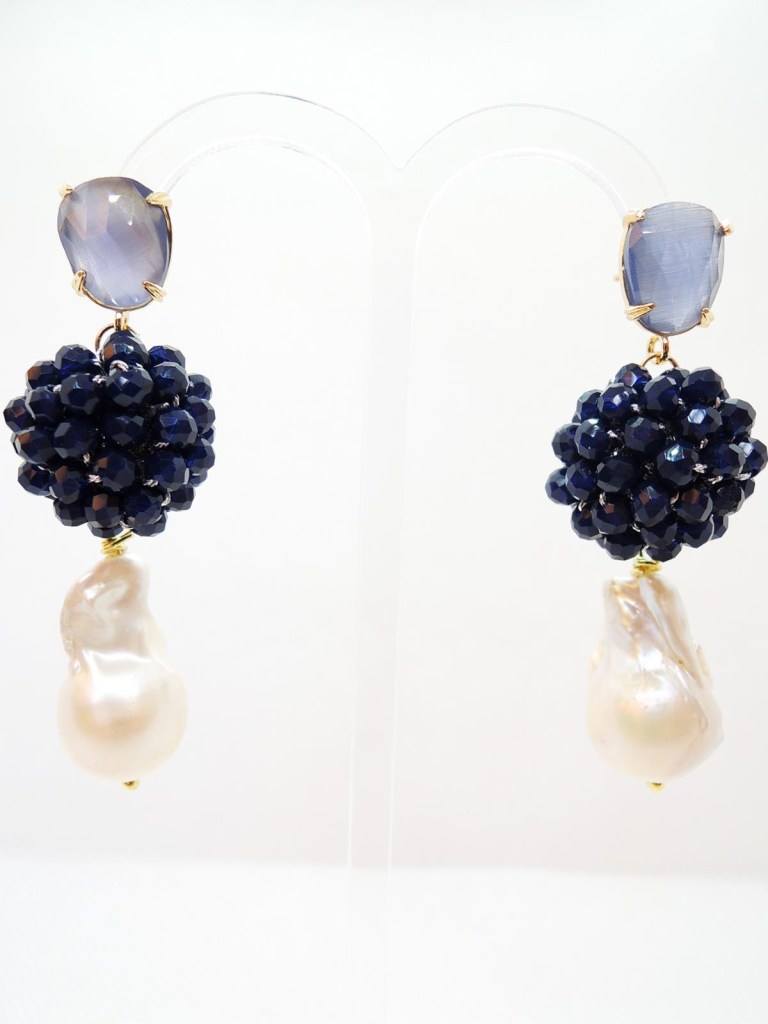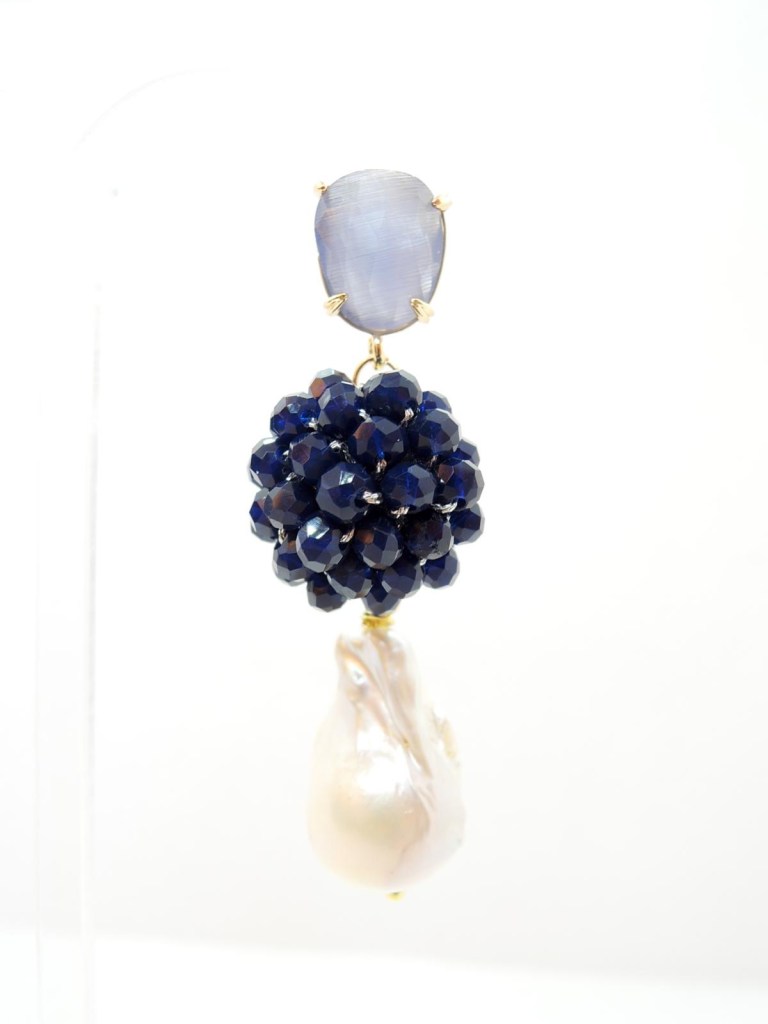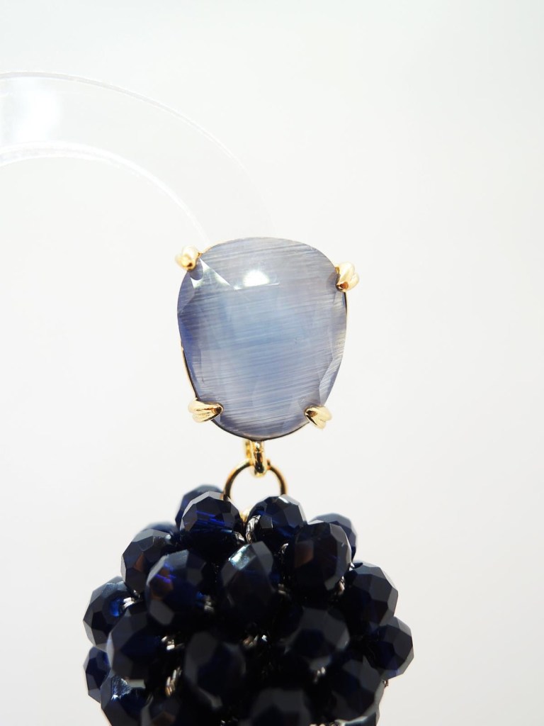 Cristalli bicono ricamati a mano arricchiscono l’elemento centrale a forma di cerchio, mentre il pendente è una goccia in onice sfaccettata.