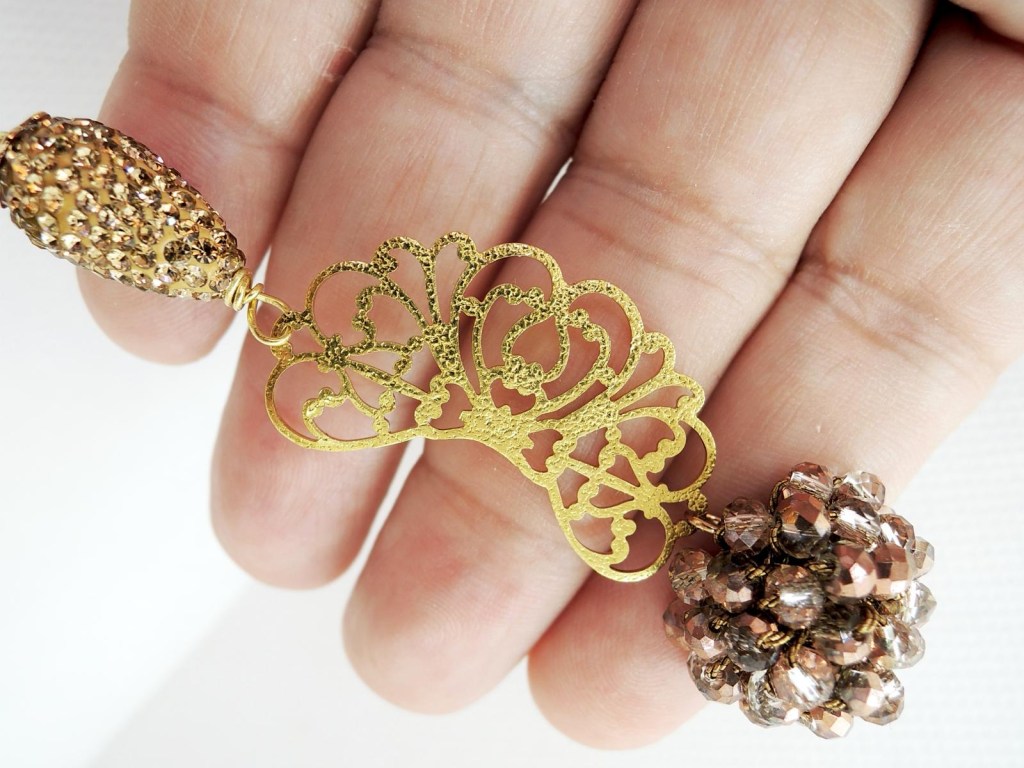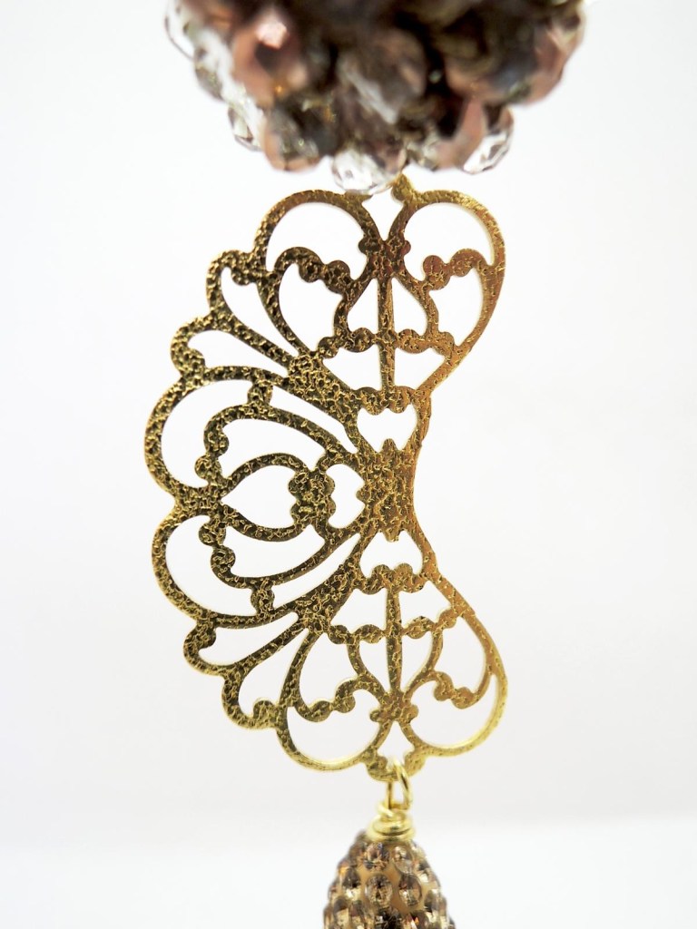 Il colore nero dell’onice e dei cristalli centrali si abbina perfettamente al colore dorato dell’elemento lavorato all’uncinetto e del perno a spirale.