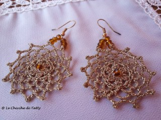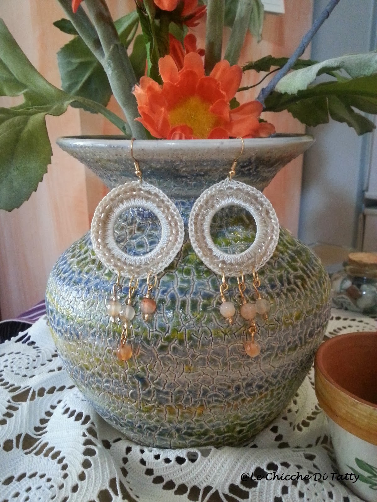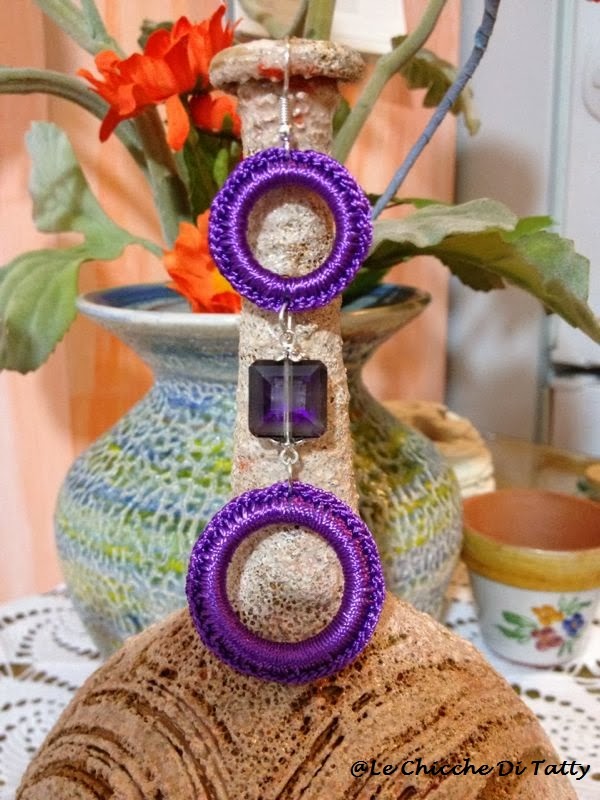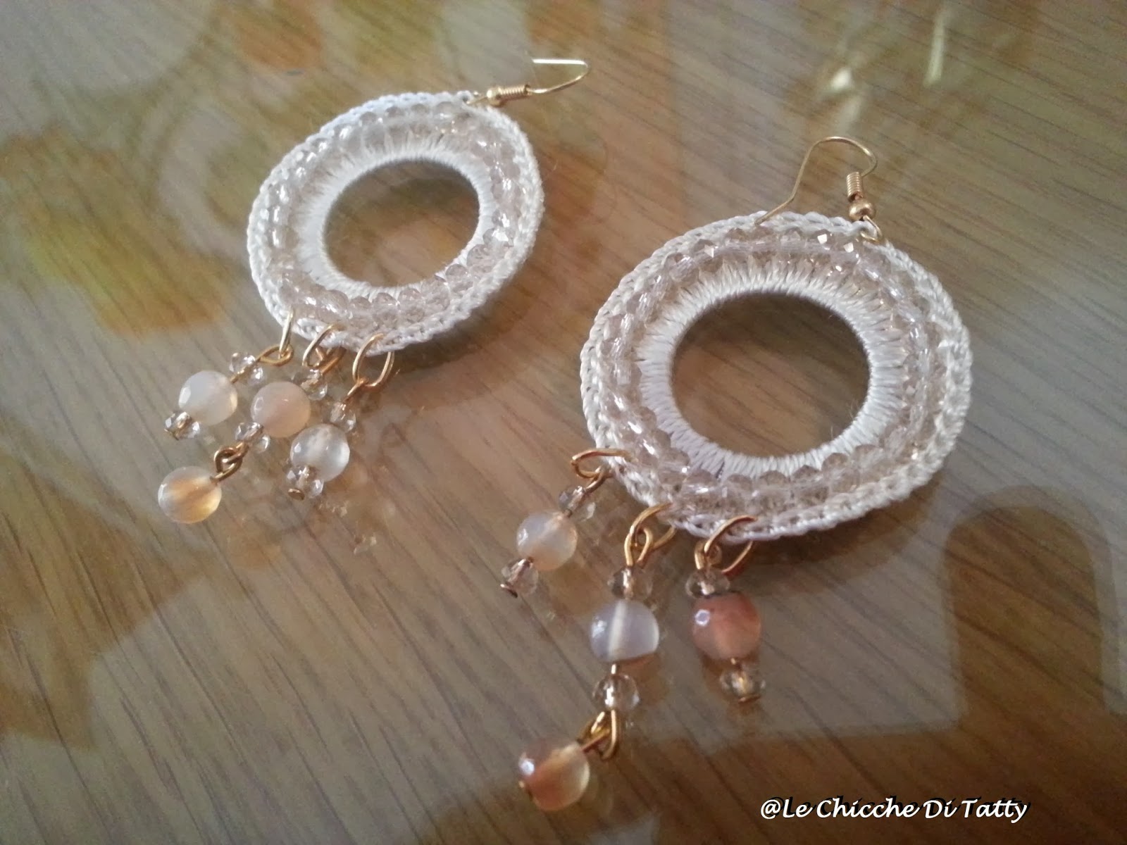 Gli orecchini sono realizzati con filato lucido che imita la seta, e sono arricchiti da cristalli e corniola: