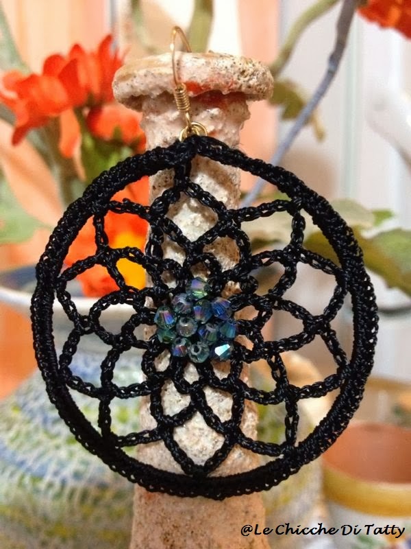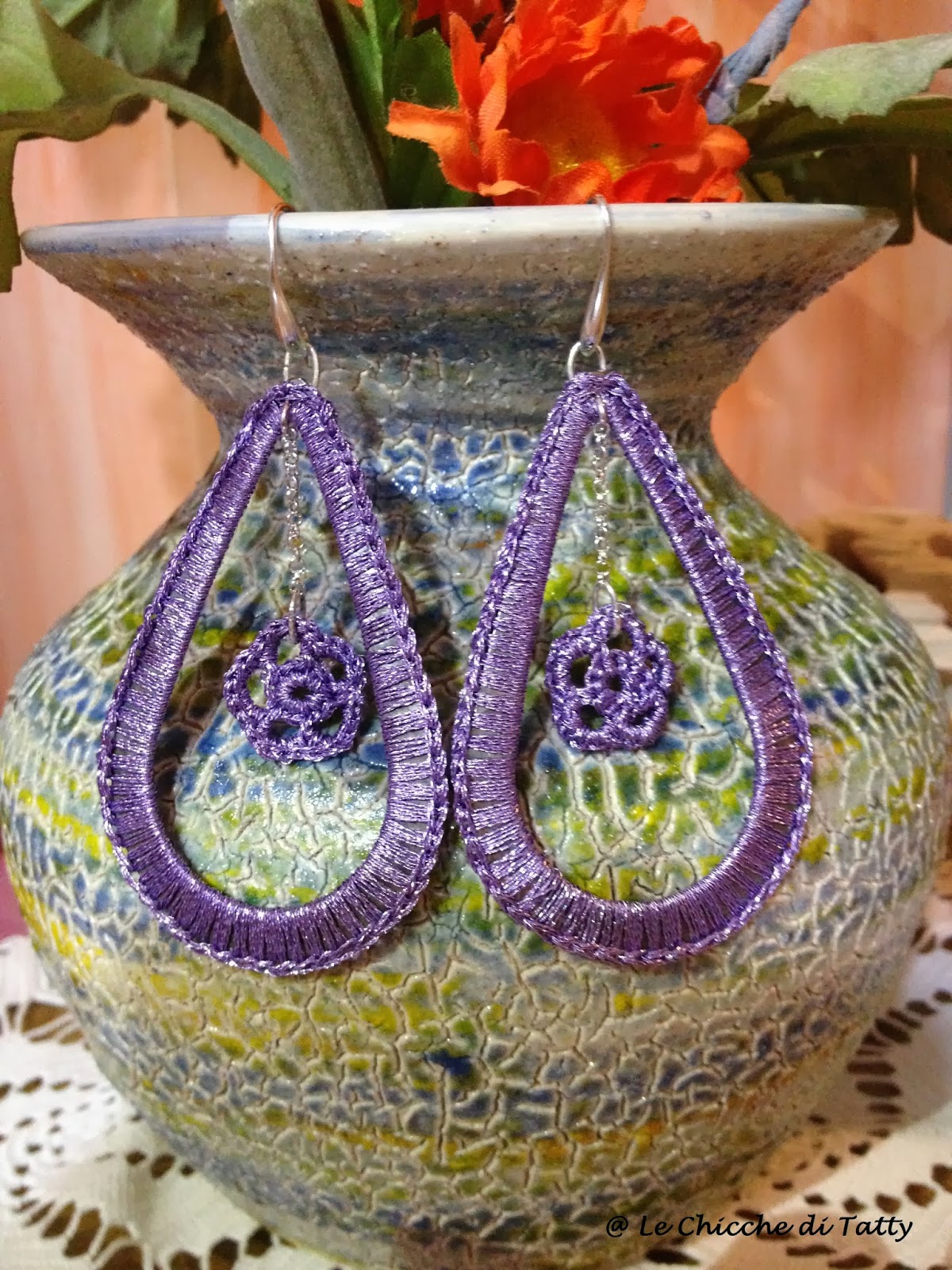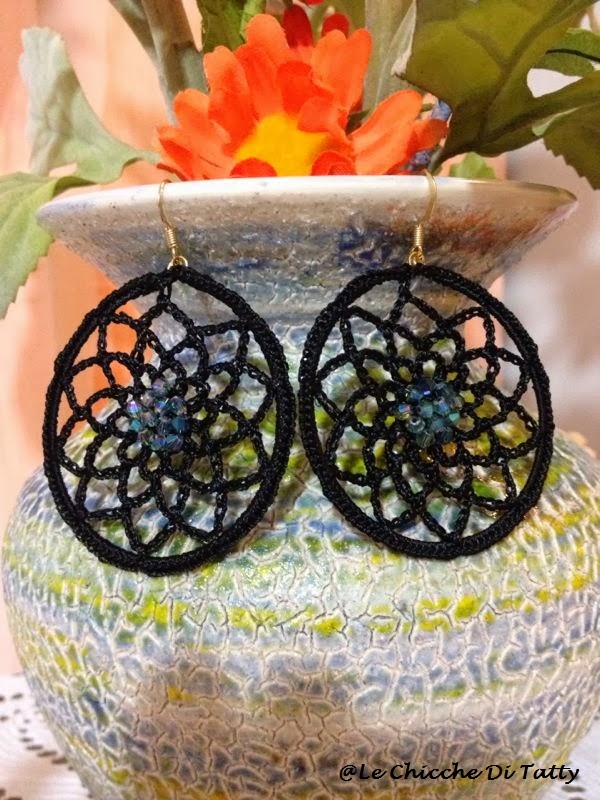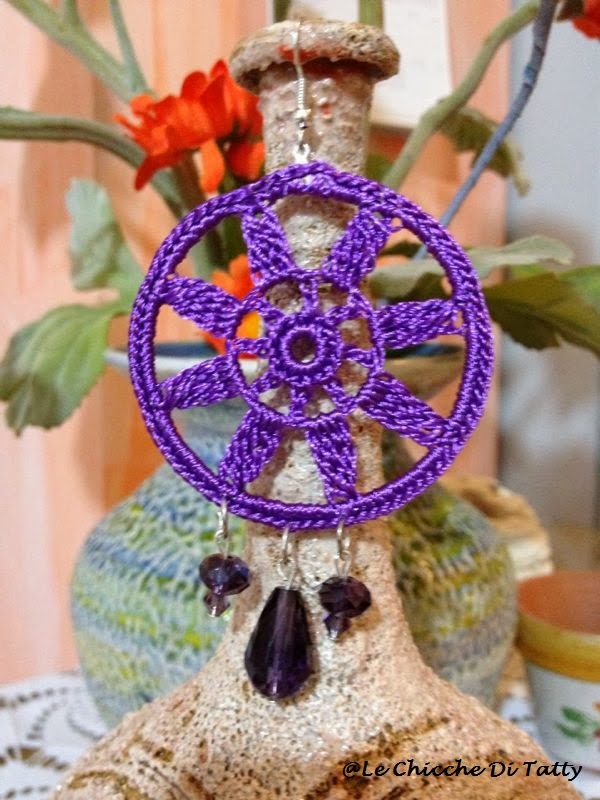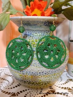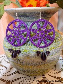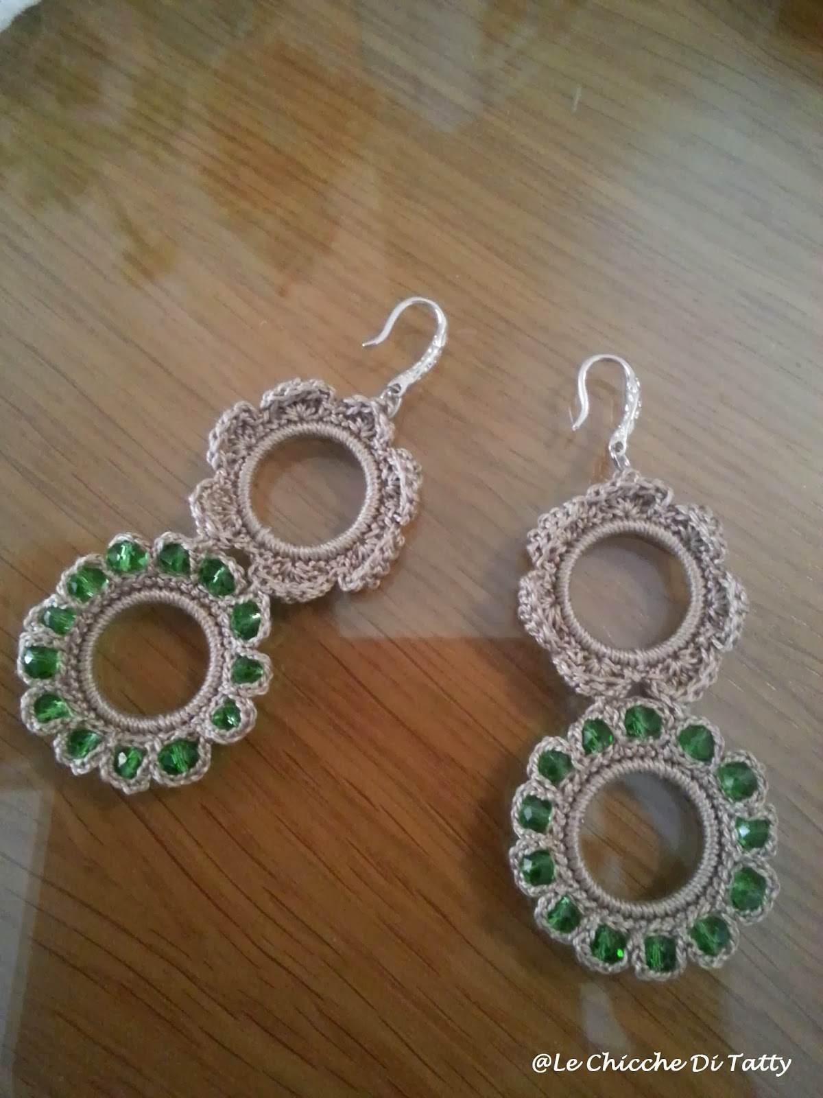 Gli orecchini sono realizzati con filato lucido che imita la seta, e sono arricchiti da cristalli e corniola:
