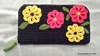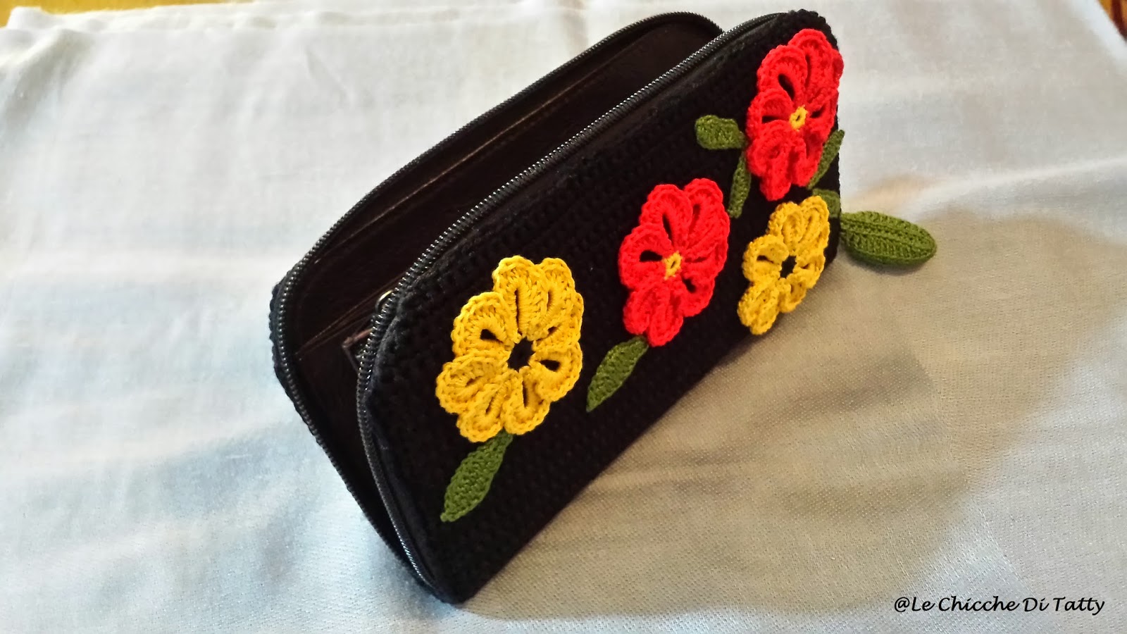 Ho deciso così di rivestirlo con un lavoro all’uncinetto: la base è fatta a “punto basso” ed ho realizzato dei fiori in un luminosissimo rosso e giallo.