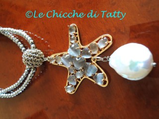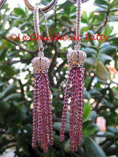 Orecchini con pendente all’uncinetto e occhio di gatto.