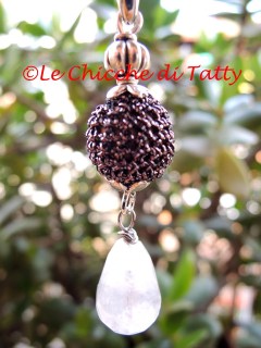 Orecchino pendente composto da una sfera di cristallo sfaccettata azzurra, molto luminosa. Il pendente ha una forma a goccia irregolare ed è un occhio di gatto (quarzo) di colore bianco opalescente, ed è anche essa sfaccettata. Il perno che sostiene il tutto ha il disegno di una rosellina stilizzata, in lega “zama” anallergica con chiusura posteriore.