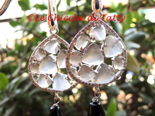 Orecchini con pendente lavorato all’uncinetto con filato gioiello e cristalli neri. Il perno è arricchito da pietre occhio di gatto (quarzo) bianco opalescente e zirconi.