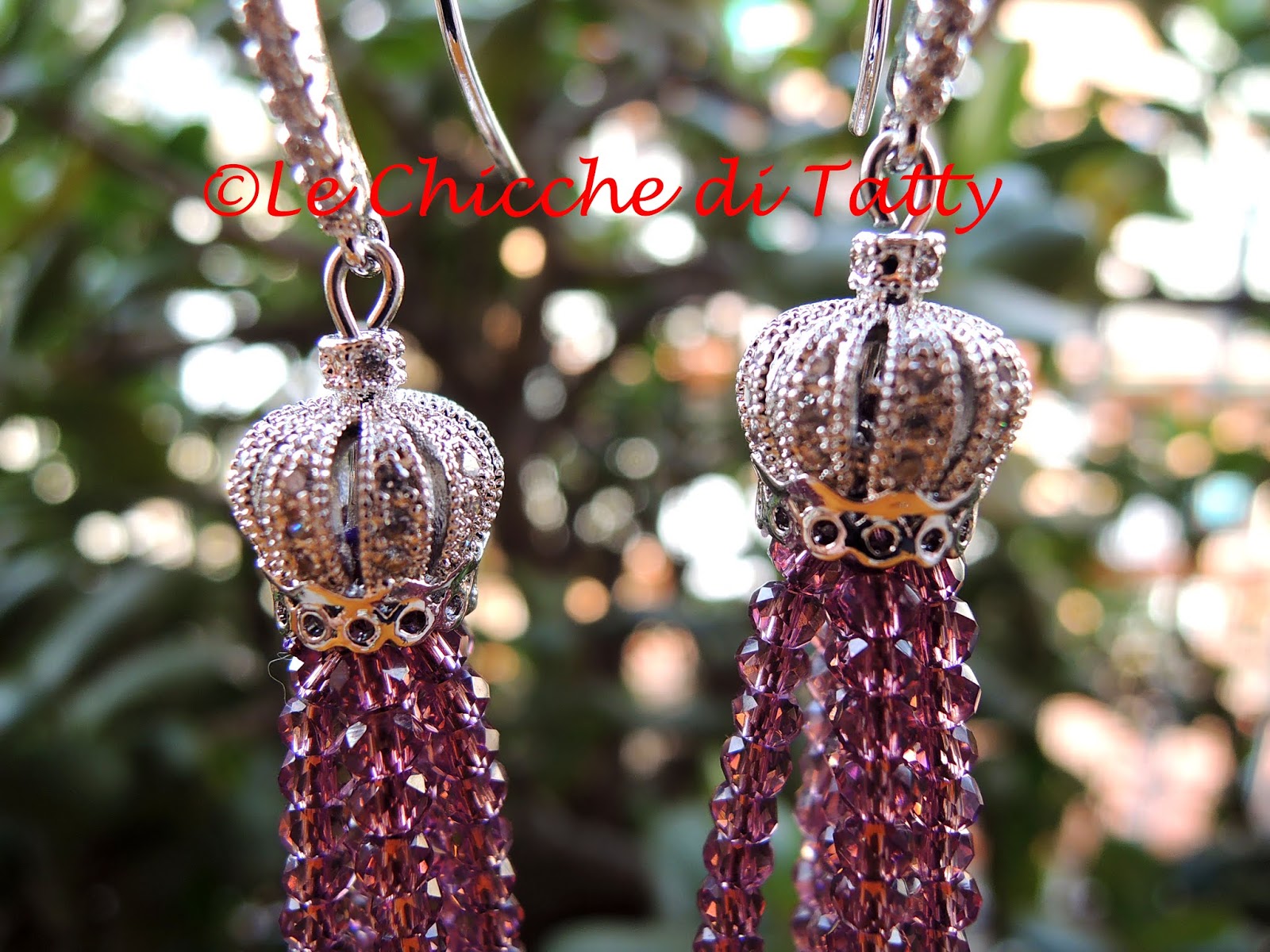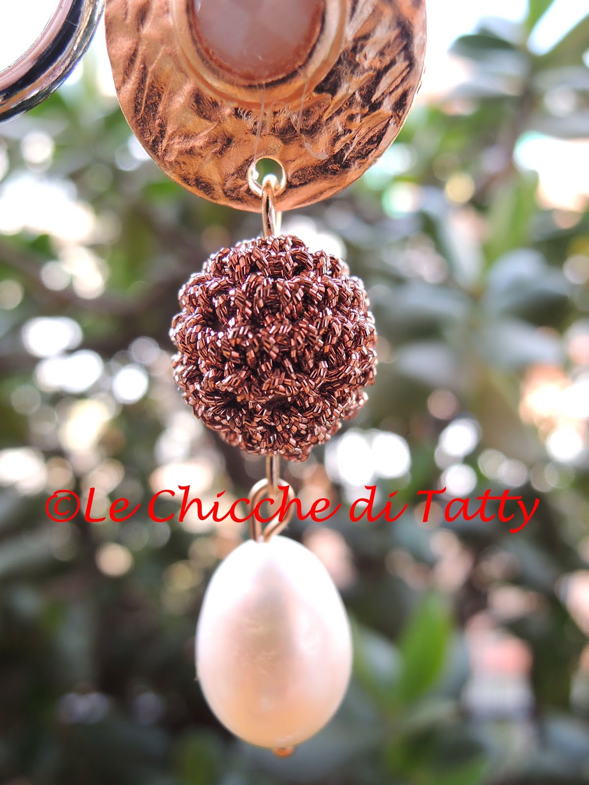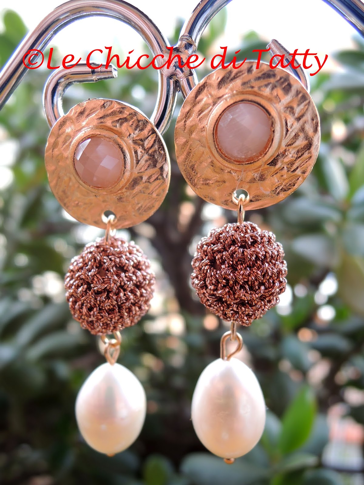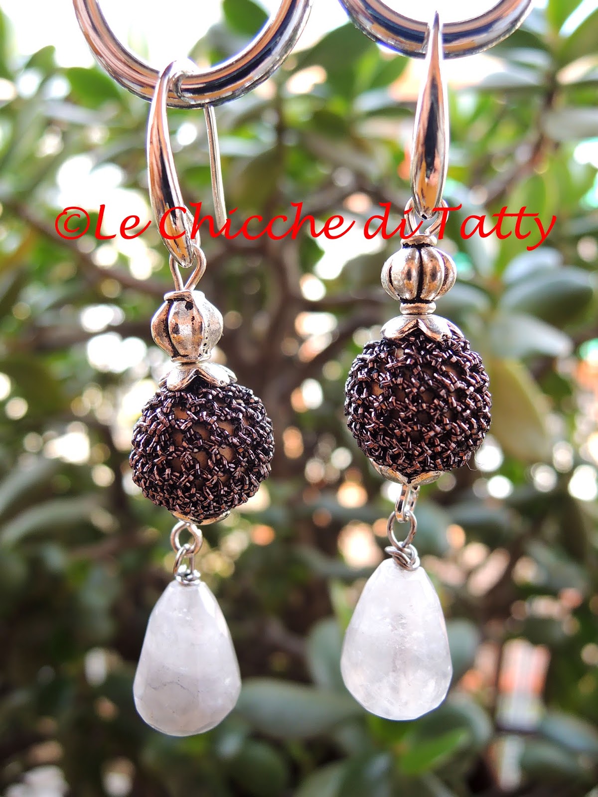Orecchini con pendente all’uncinetto e occhio di gatto.