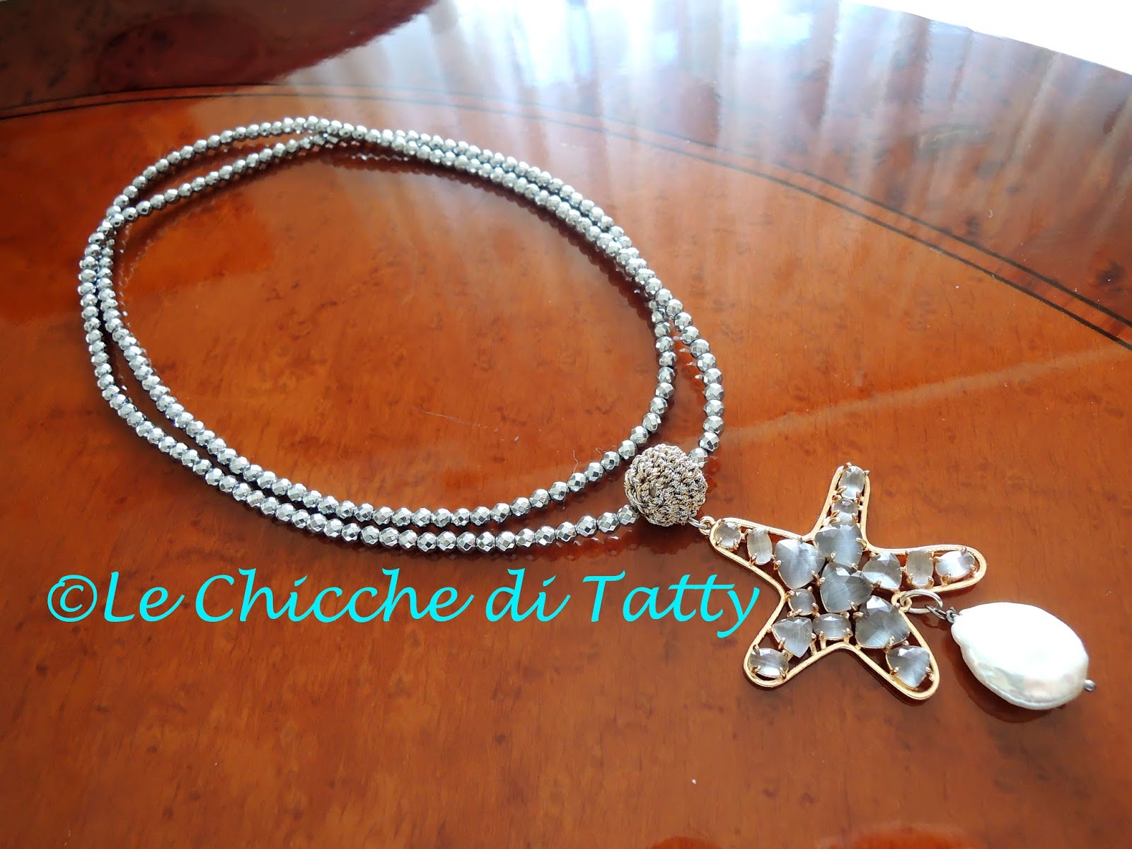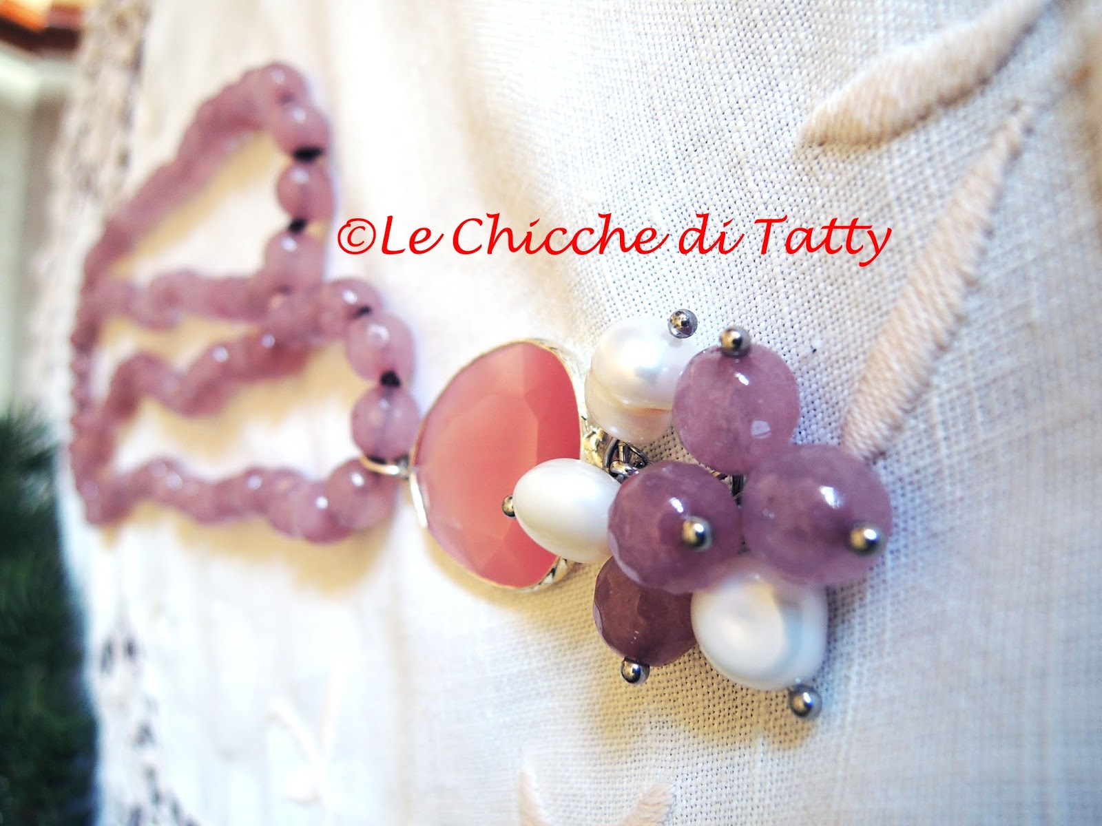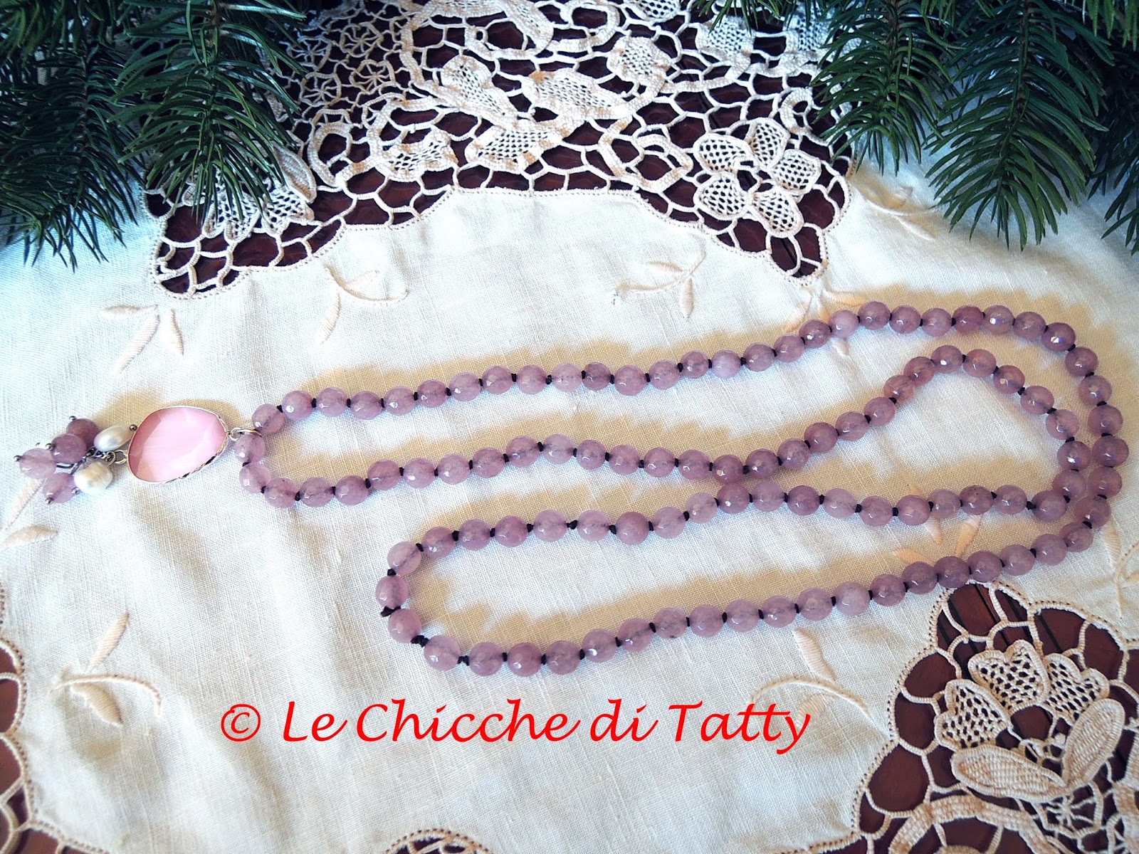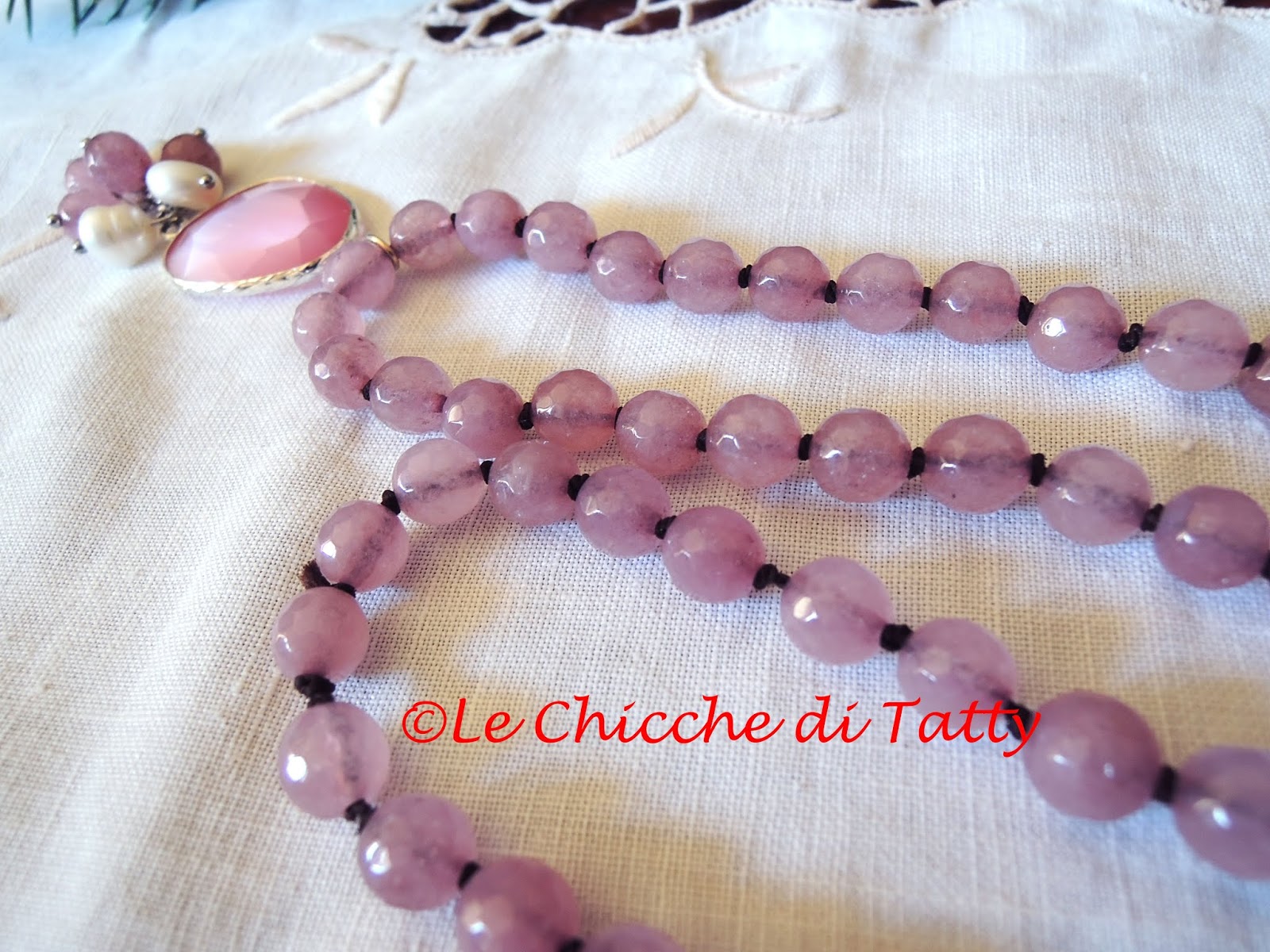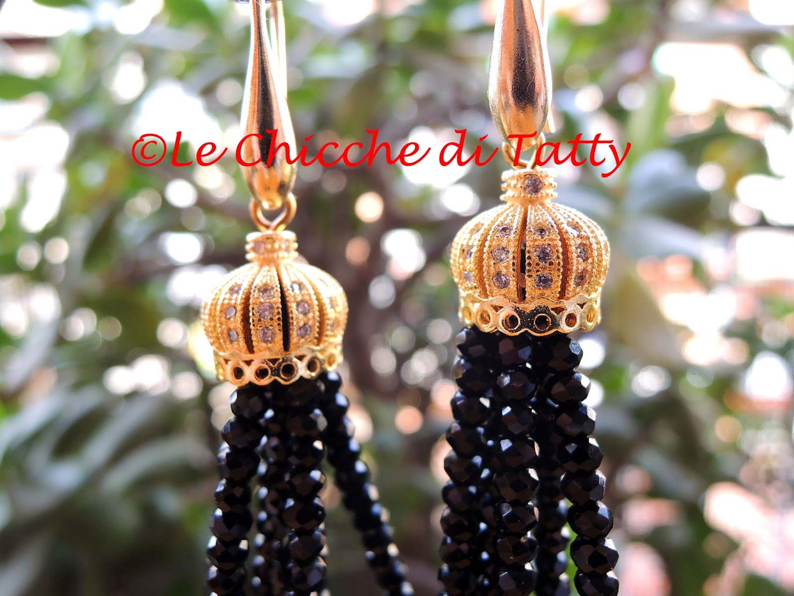Orecchini con pendente all’uncinetto e occhio di gatto.
