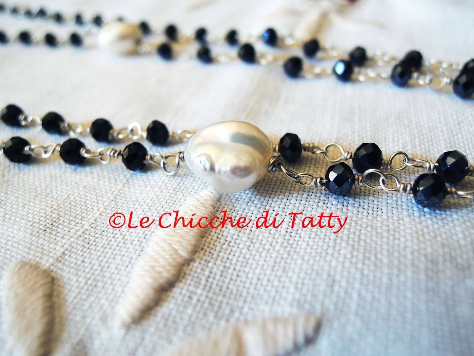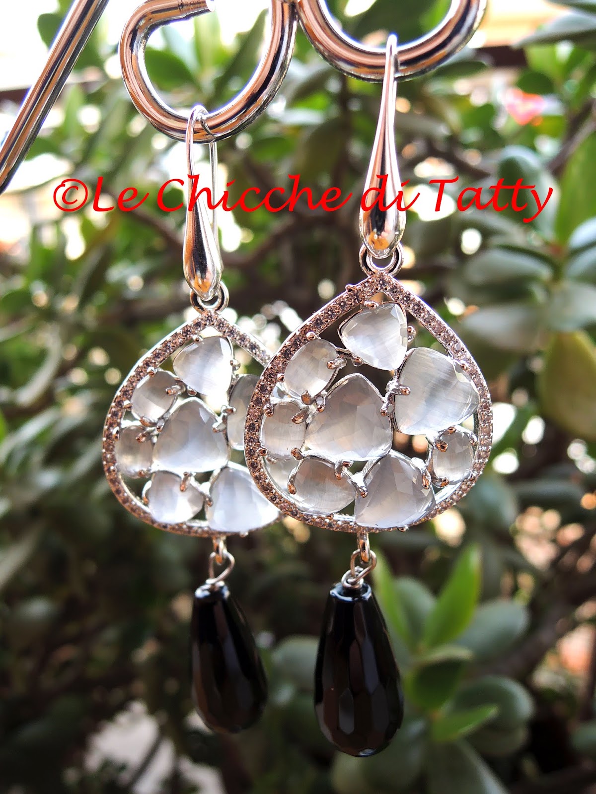 Orecchini con pendente lavorato all’uncinetto con filato gioiello e cristalli neri. Il perno è arricchito da pietre occhio di gatto (quarzo) bianco opalescente e zirconi.