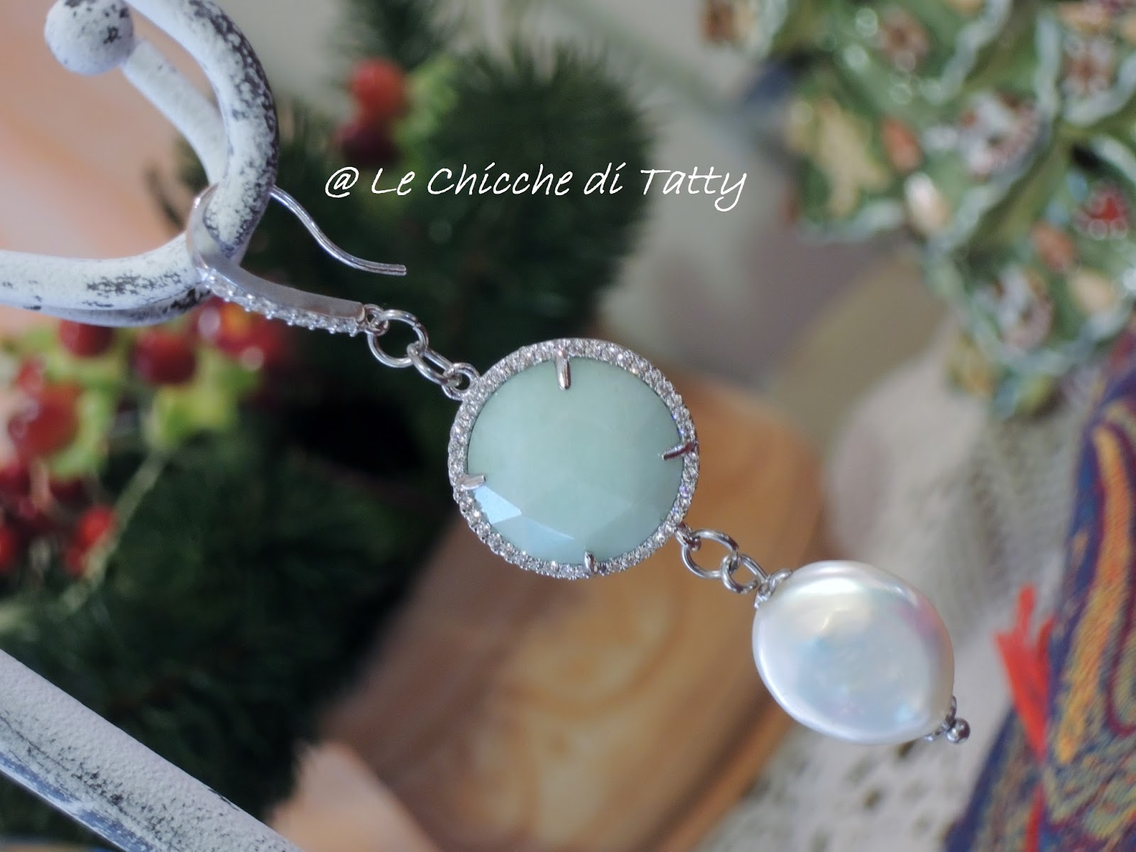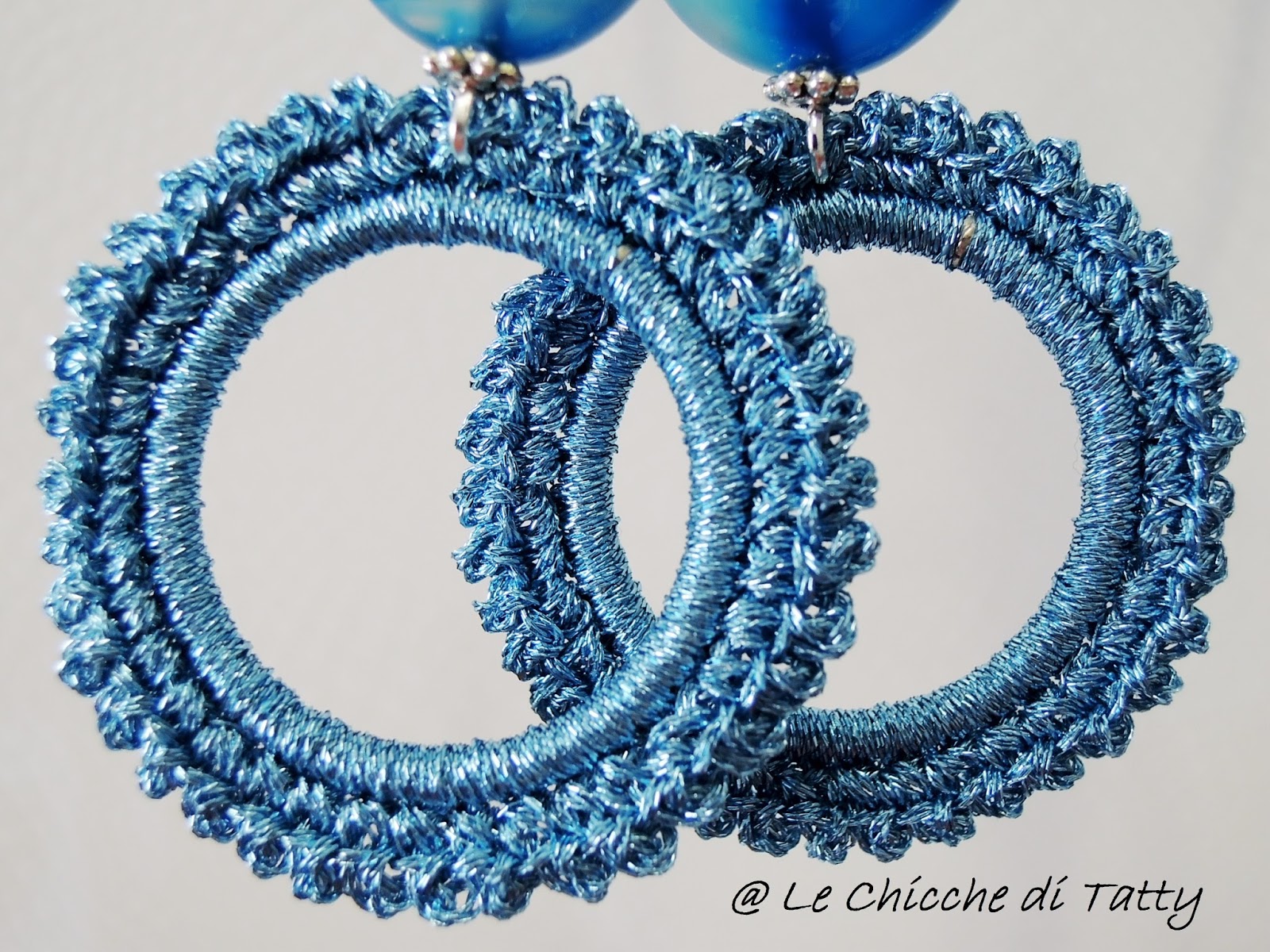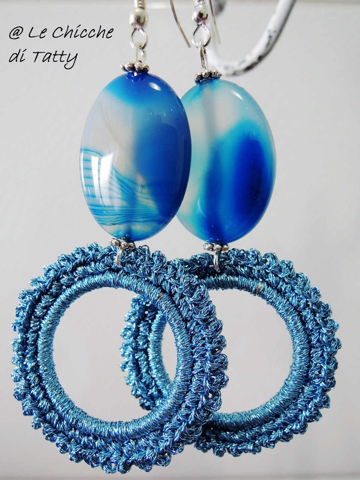 Cristalli blu intenso lavorati all’uncinetto con filato gioiello. Perno a lobo con occhio di gatto azzurro chiaro e come pendente una bellissima perla barocca.