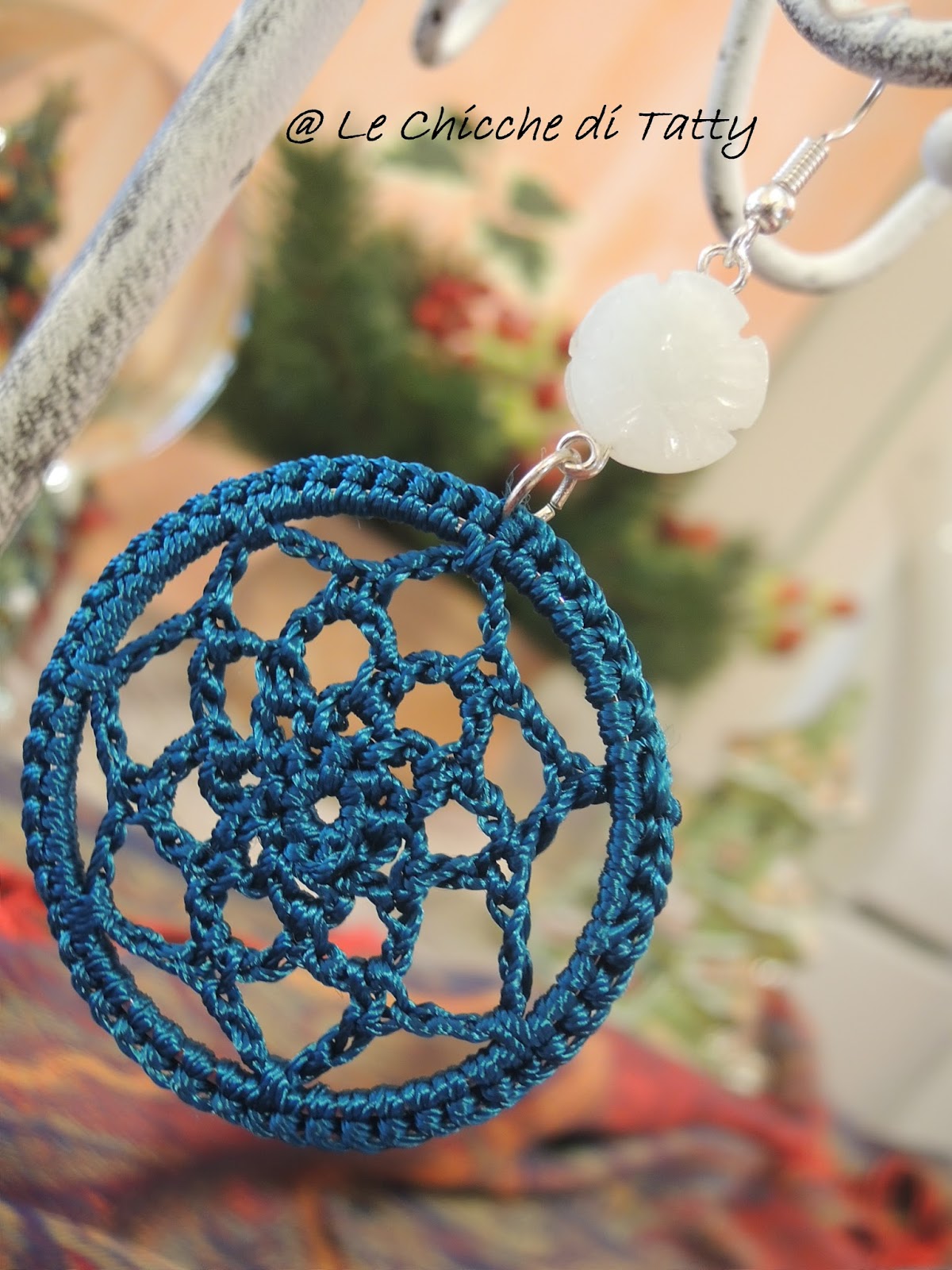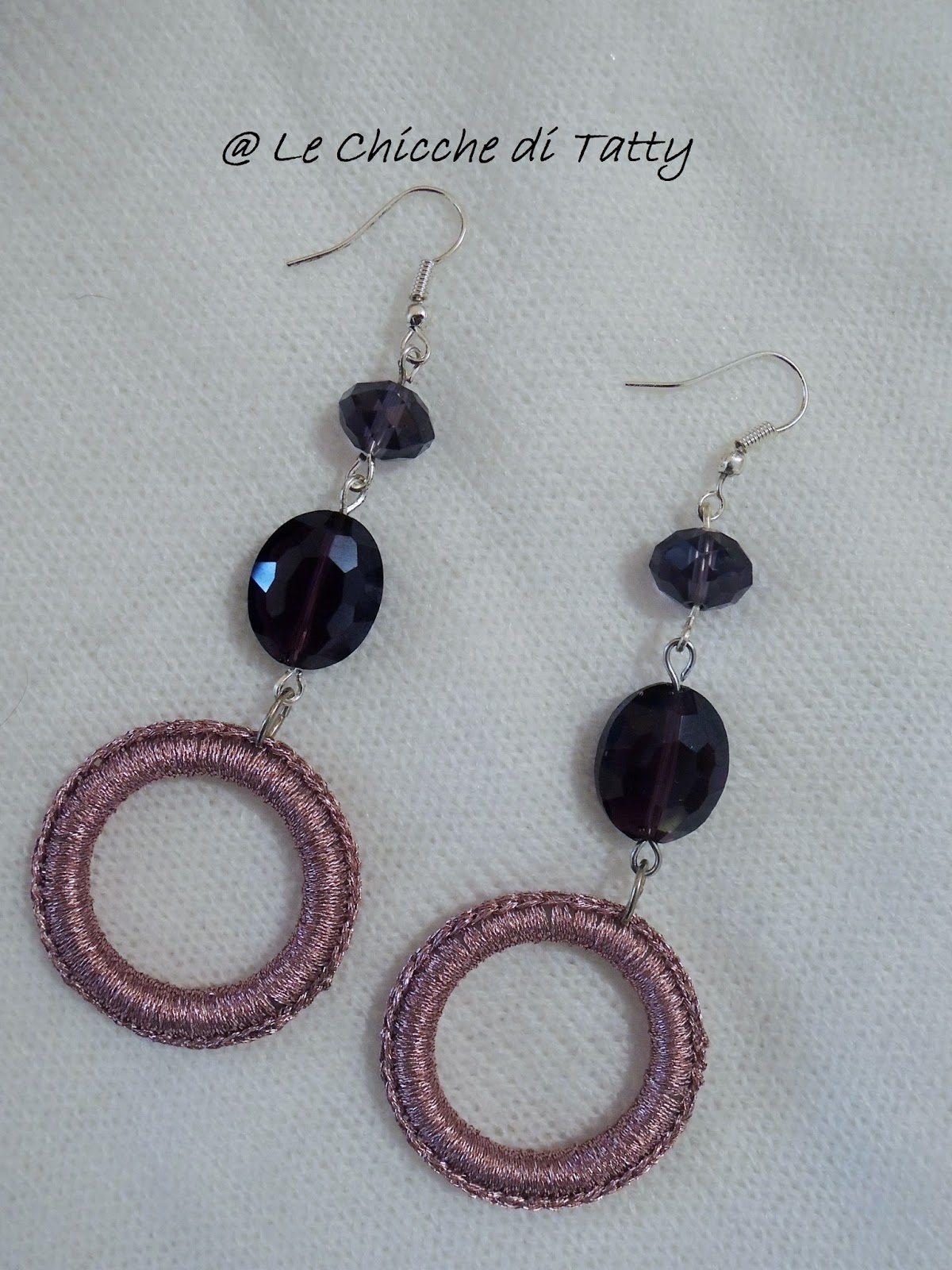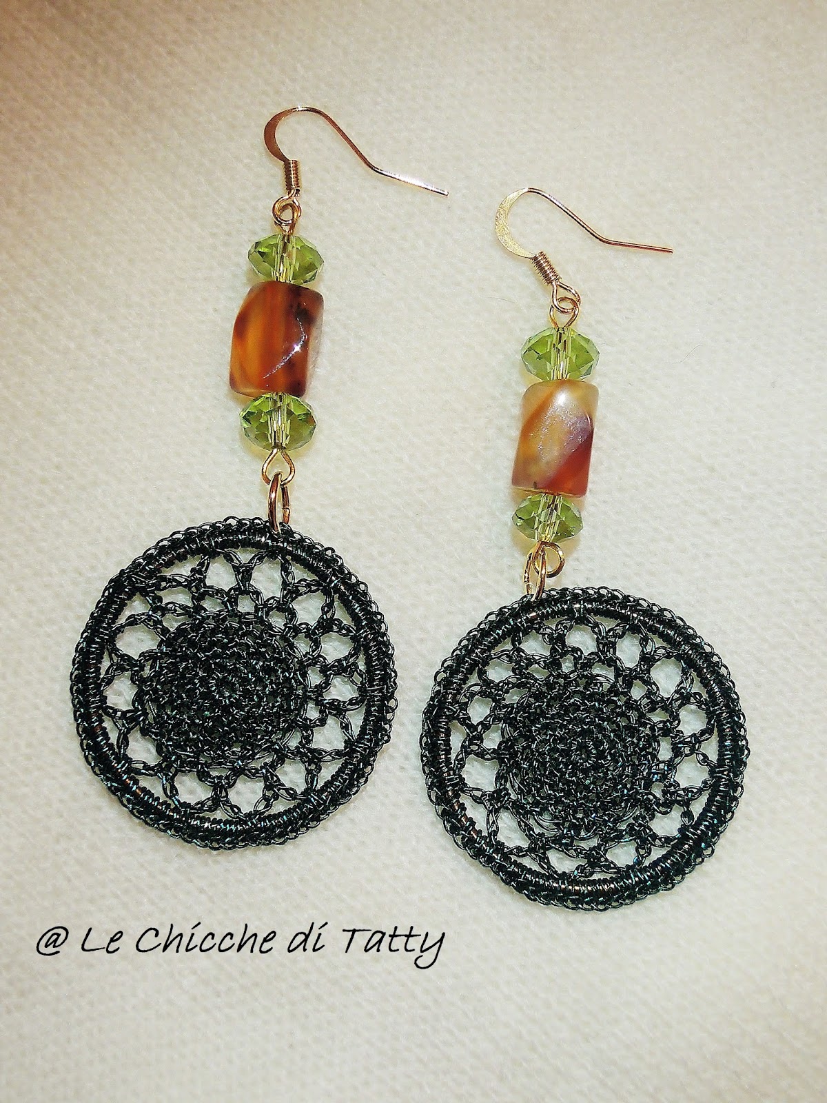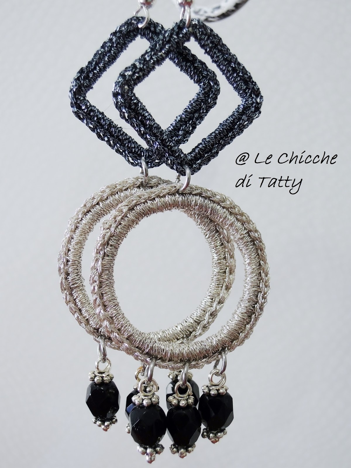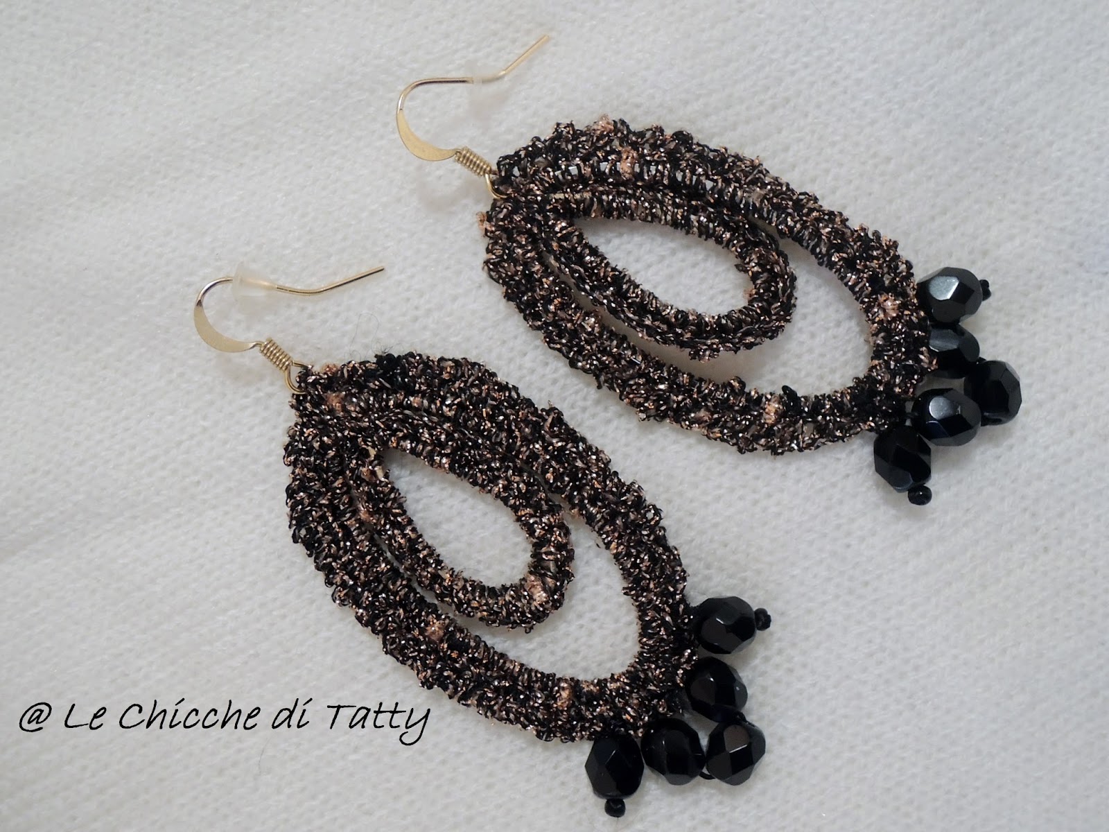 Orecchini con particolare lavorato all’uncinetto con filato gioiello e cristalli. Centrale filigrana in ottone e come pendente una goccia di marcasite.