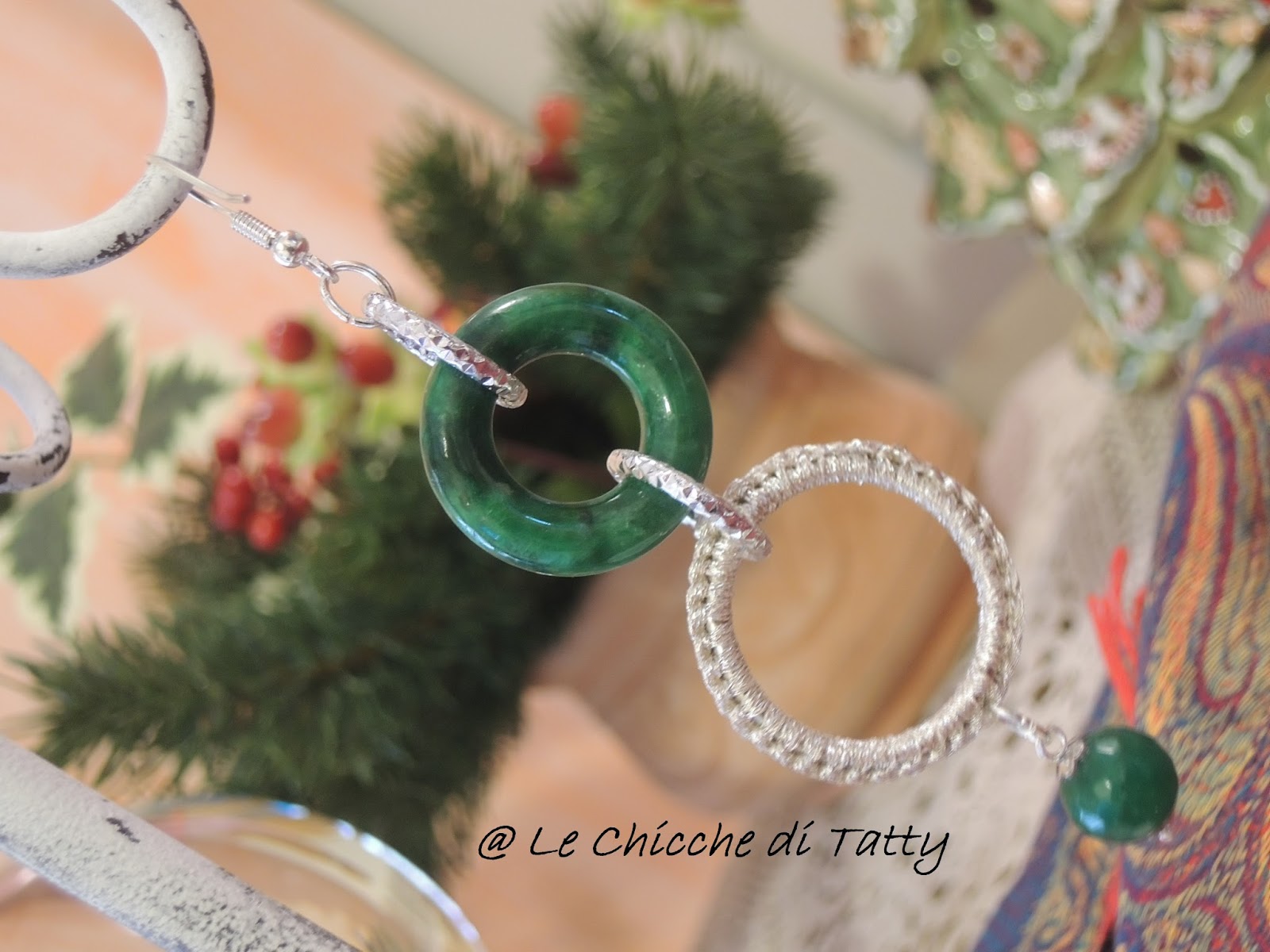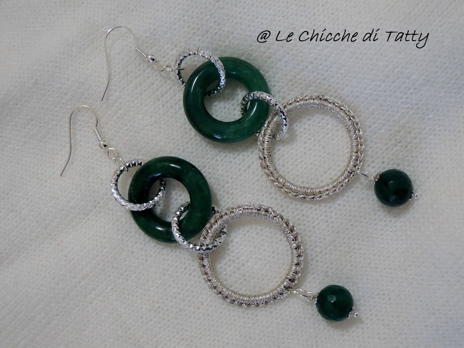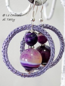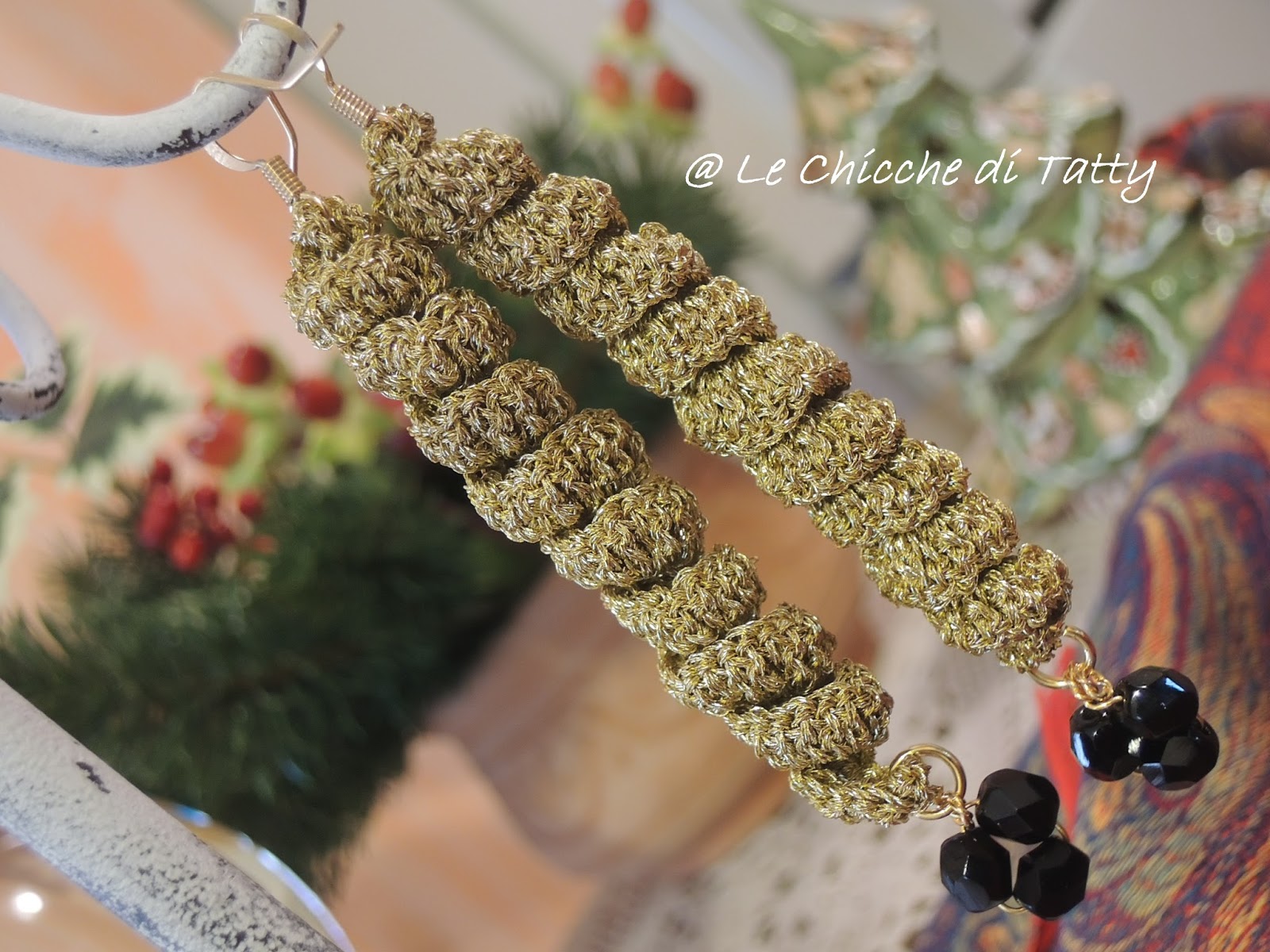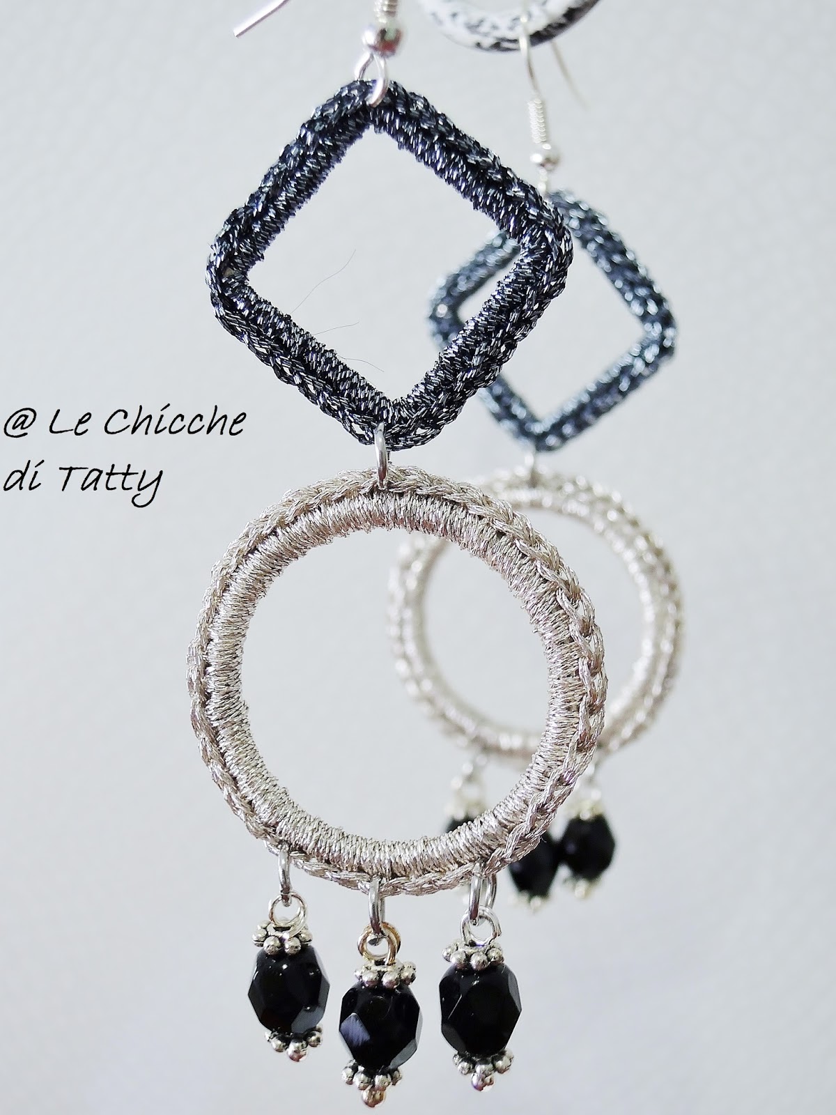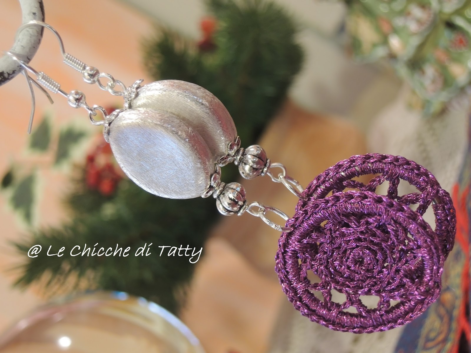 Orecchini con particolare lavorato all’uncinetto con filato gioiello e cristalli. Centrale filigrana in ottone e come pendente una goccia di marcasite.