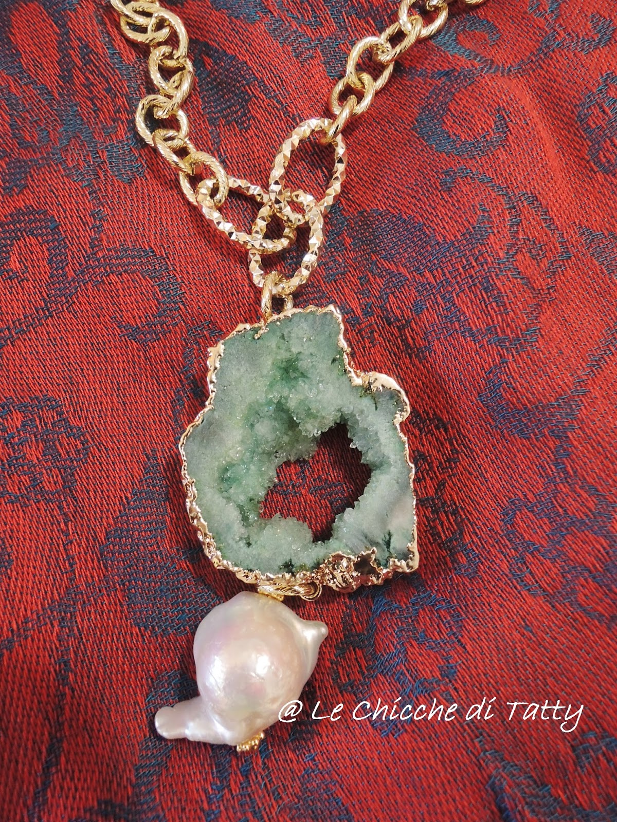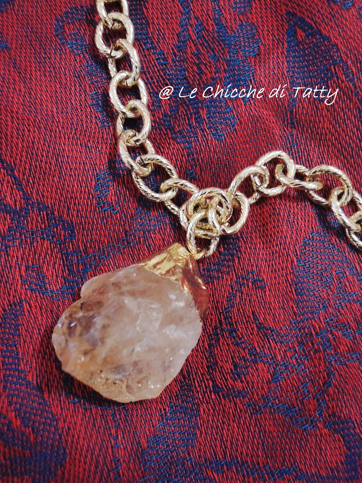 Perno a forma di foglia color oro, catenelle in acciaio dorato e quarzi, quarzi citrini e ametista