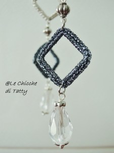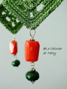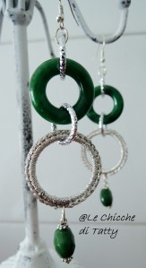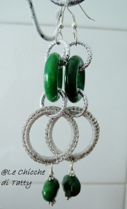 La giada verde si intreccia con cerchi di metallo argentati e un cerchio all’uncinetto con filato LUREX.