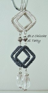 Il verde invece è il protagonista negli orecchini successivi, in cui una resina verde si alterna ad un cerchio all’uncinetto ricamato con cristalli dello stesso colore.