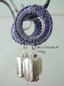 Un pendente di metallo color argento arricchisce l’orecchino tondo realizzato all’uncinetto con filato LUREX color lilla.